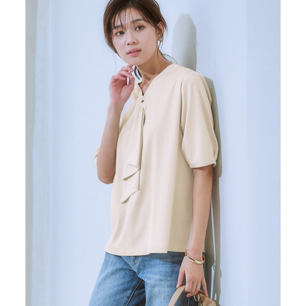 ・すっきりとした狭めのVネックにかわいいフリルタイが映えるトップス。