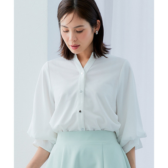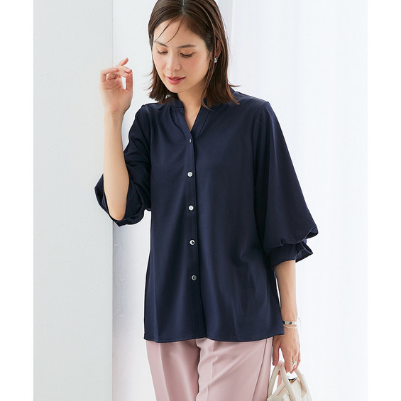 【本格シャツ見えするカットソー】柔らか素材仕立てのノーカラーの前開きシャツできちんと見えと楽な着心地を両立。