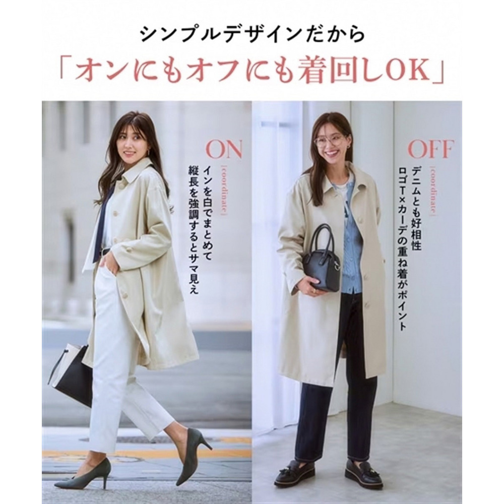 ・白のボウタイブラウスにダークトーンのテーパードパンツを合わせ、このコートを羽織るだけで、上品で知的な通勤スタイルが完成します。
