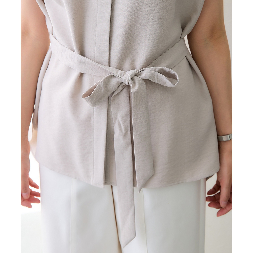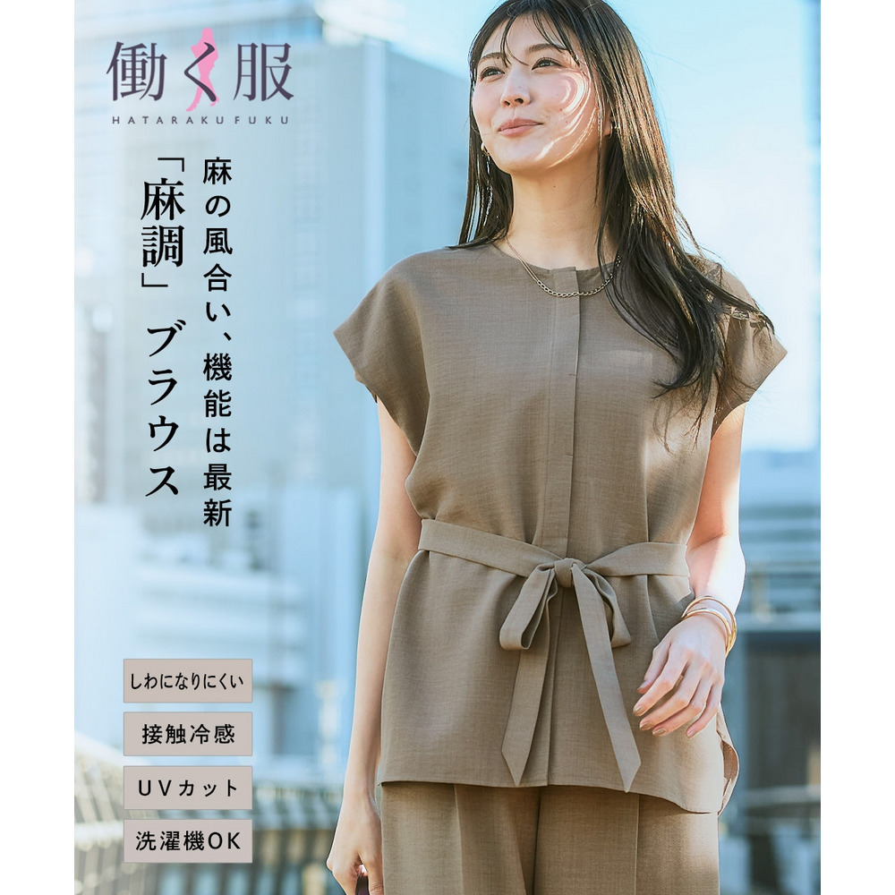 麻調合繊共布リボン付きフレンチスリーブブラウス(しわになりにくい・接触冷感・UVカット・ウォッシャブル) 大きいサイズ