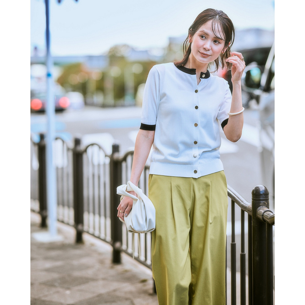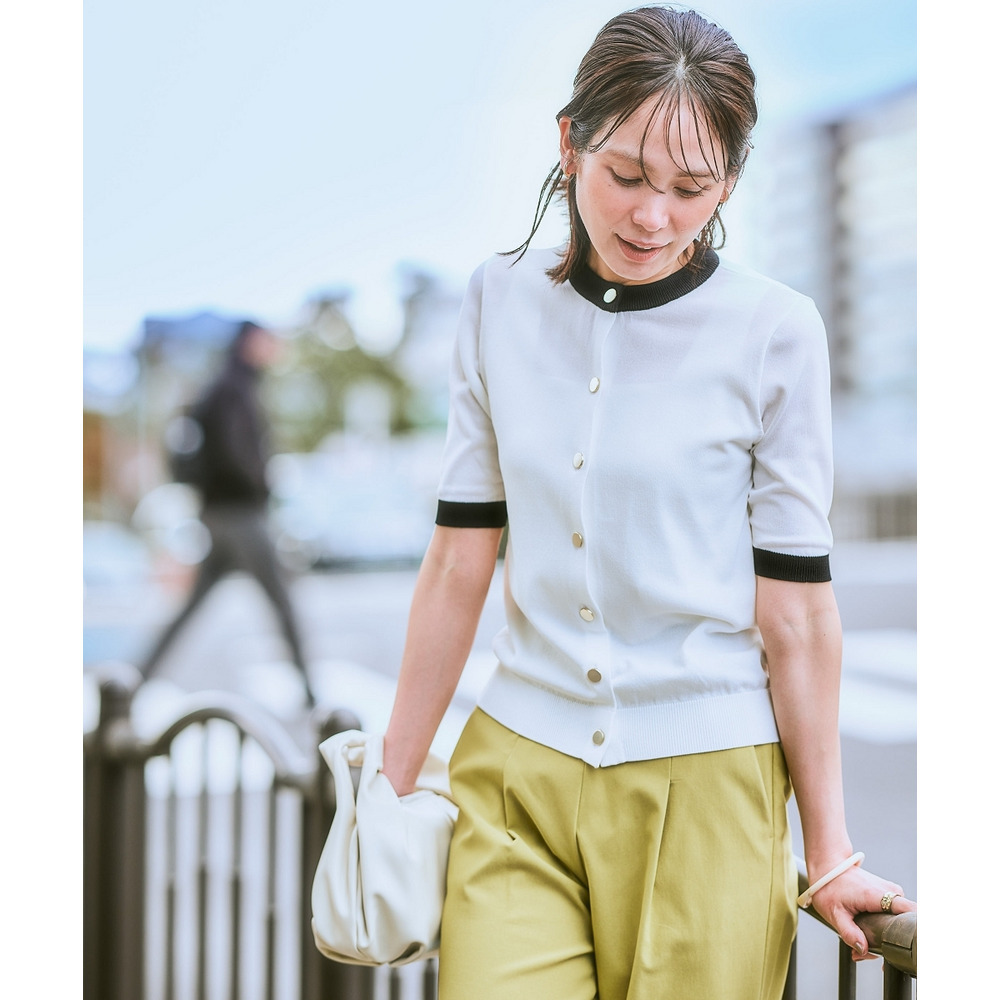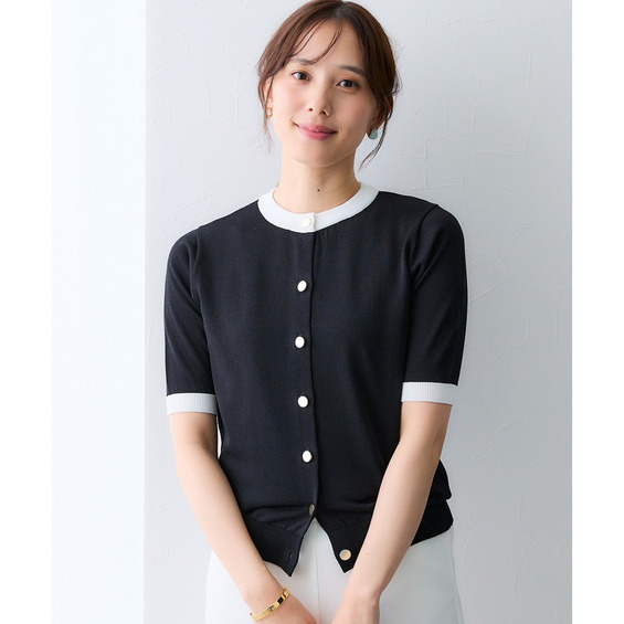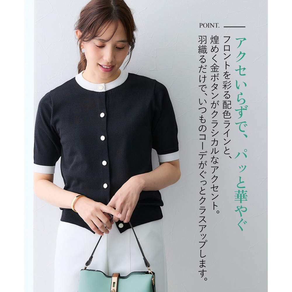 襟元と袖口に施された配色ラインがアクセントとなり、一枚で着映えする上品なデザインです。