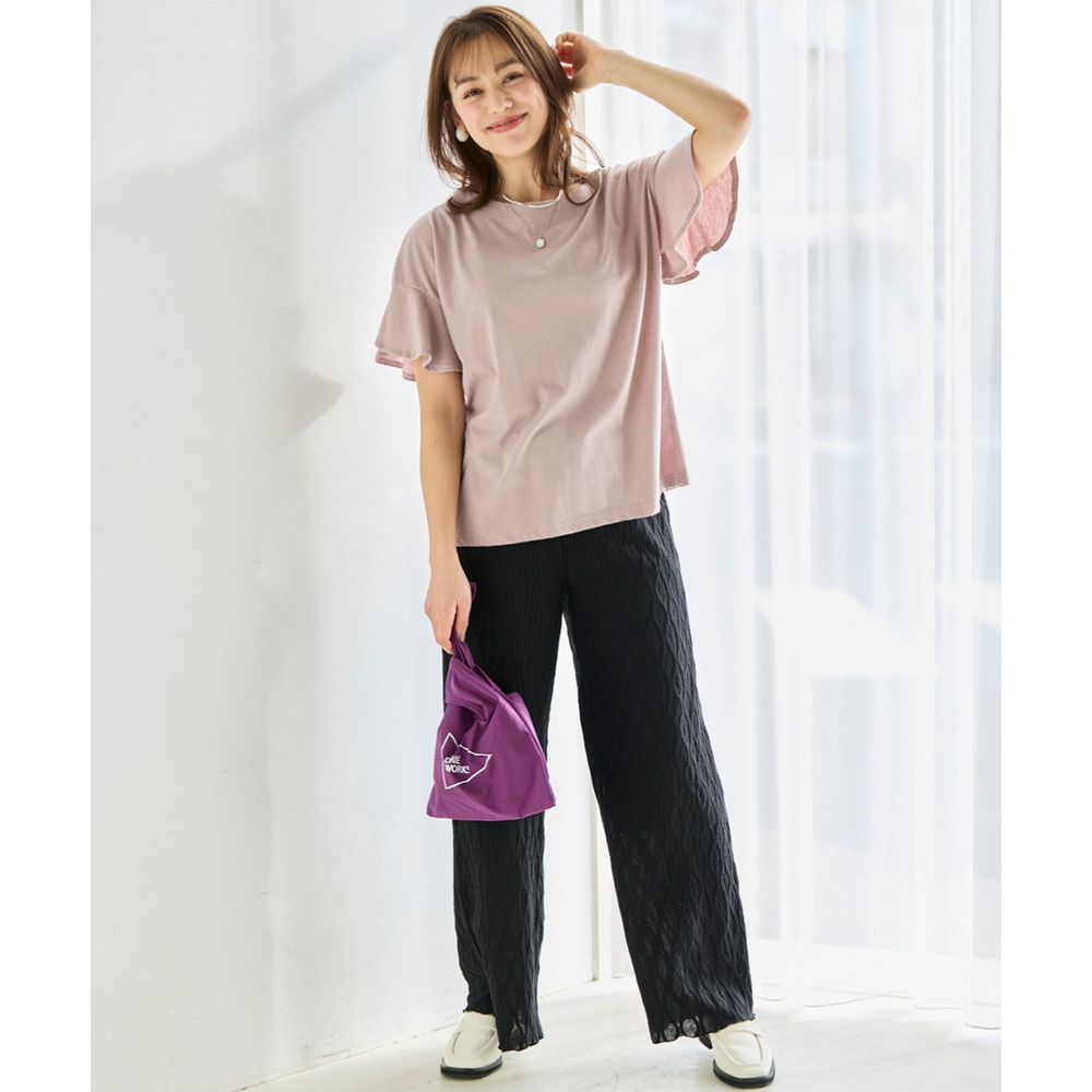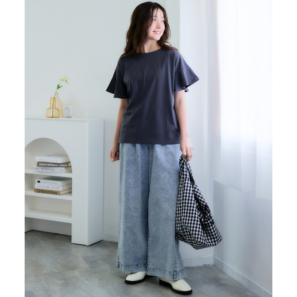 存在感のあるフリル袖を主役にするなら、ボトムスはスッキリとしたシルエットのパンツを合わせるのがおすすめです。