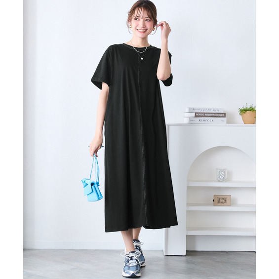 トレンドの「ゆる×ゆる」バランスも、配色ステッチの効いたこのワンピースなら、だらしなくならずに大人のこなれ感を演出してくれます。