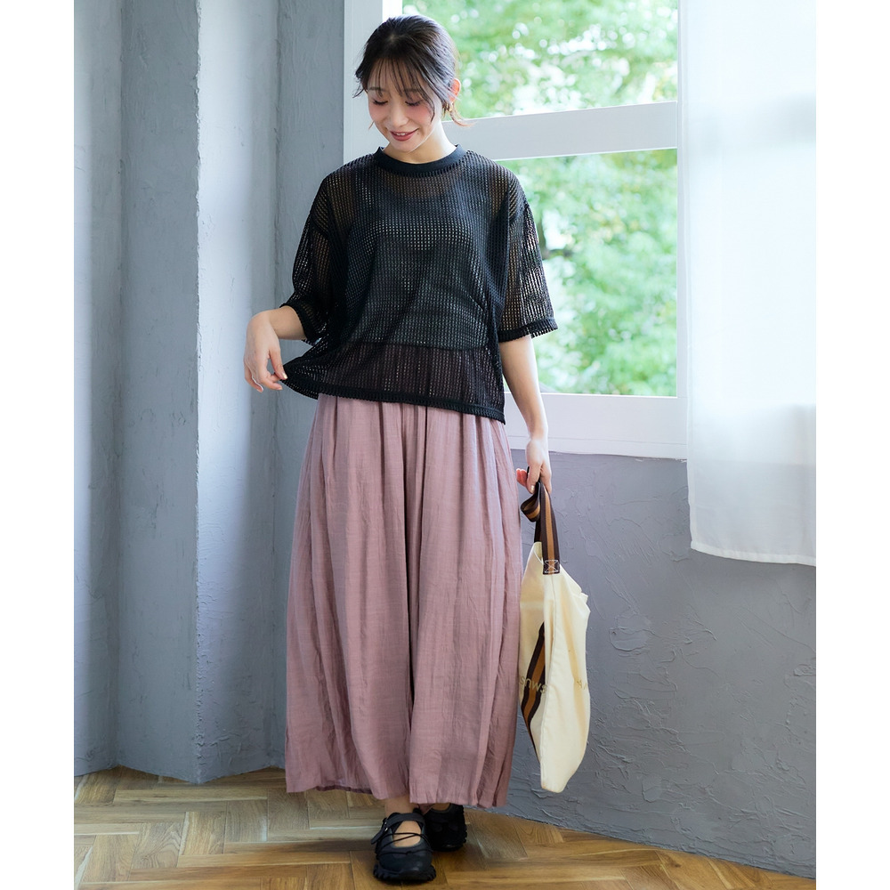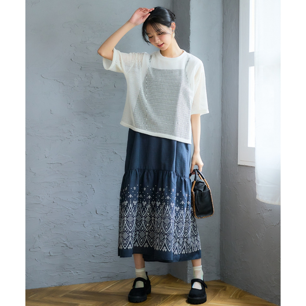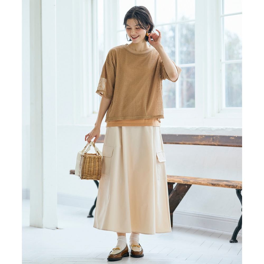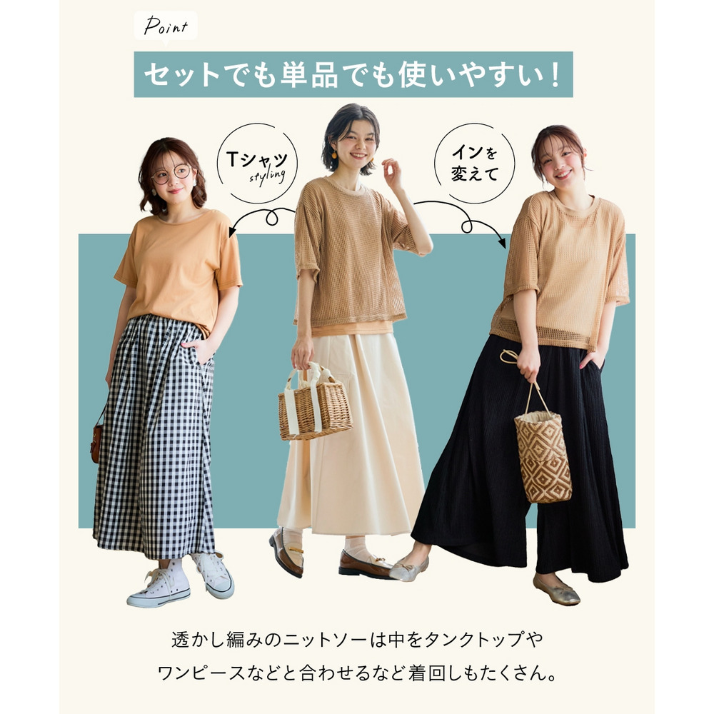 透かし編みニットソーをお手持ちのタンクトップやキャミソールワンピースの上に重ねれば、いつもとは違う透け感を楽しめる旬なレイヤードスタイルに。