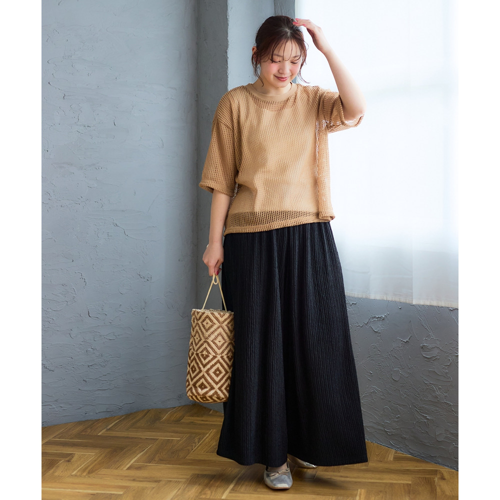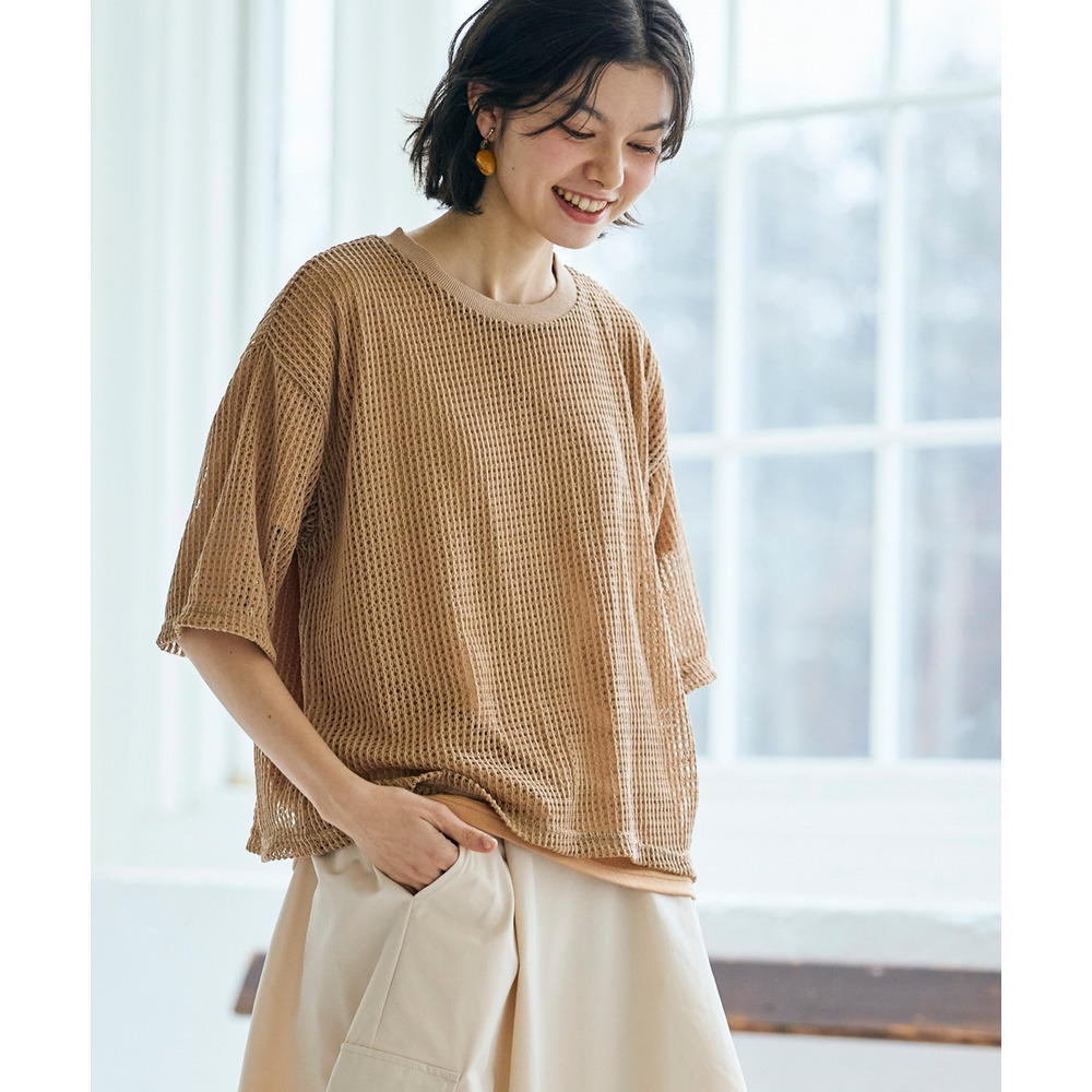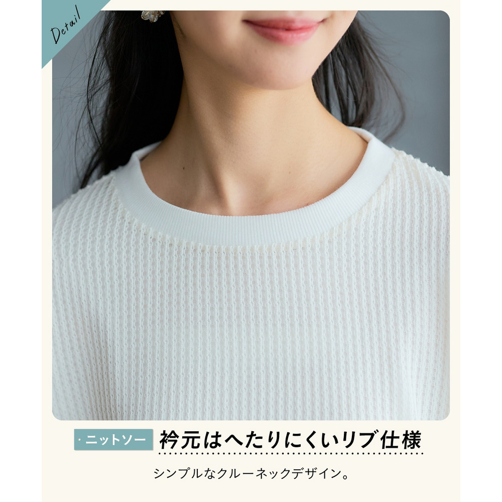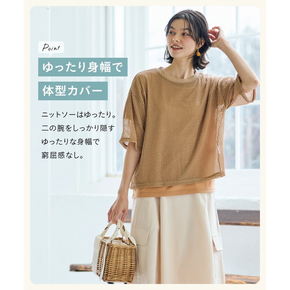 透かし編みのニットソーは、程よい透け感が軽やかな印象を与えつつ、二の腕をカバーする絶妙な袖丈にこだわりました。