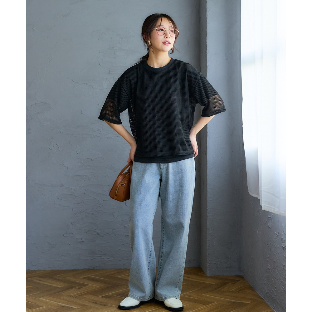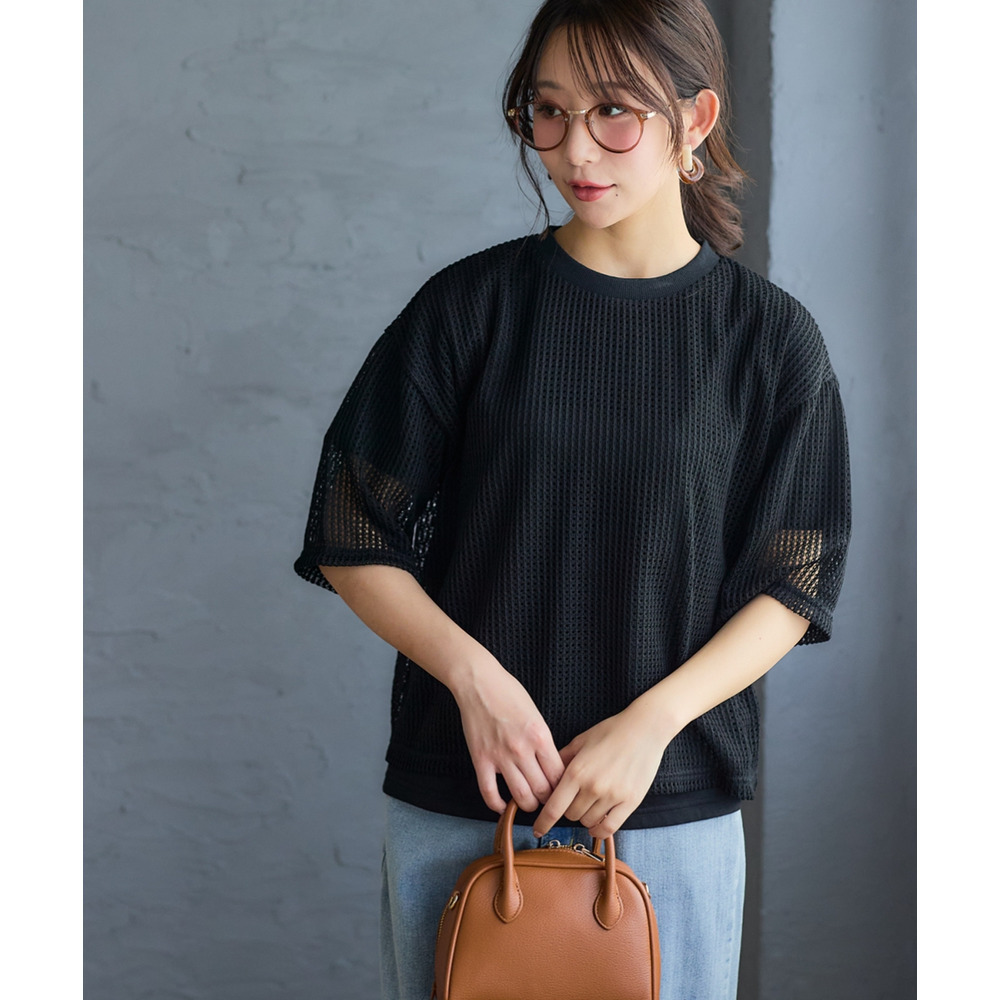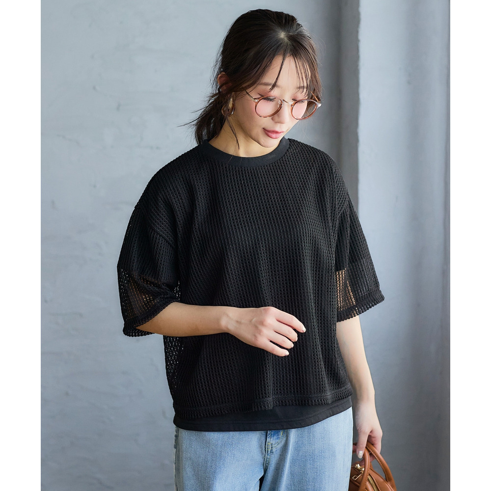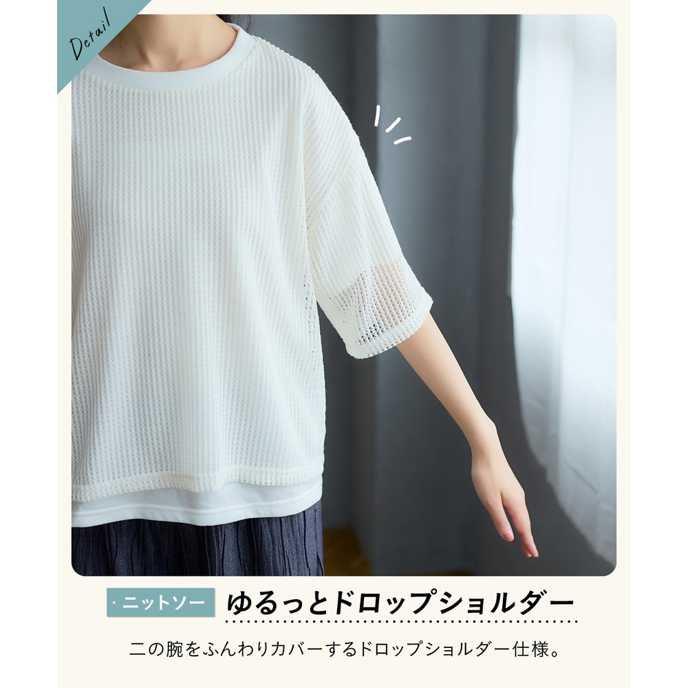 2点セット(透かし編ニットソー+5分袖Tシャツ) 大きいサイズ