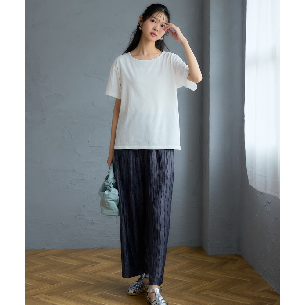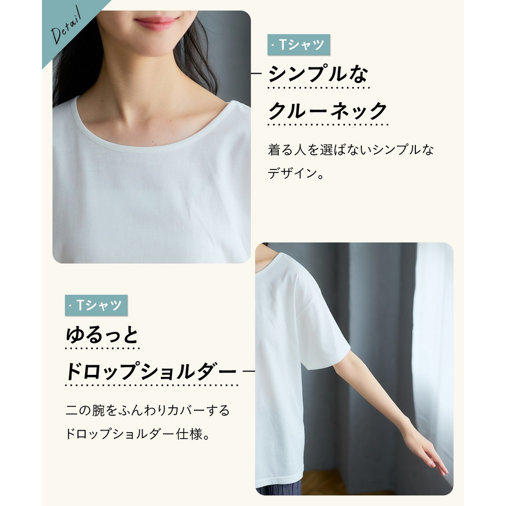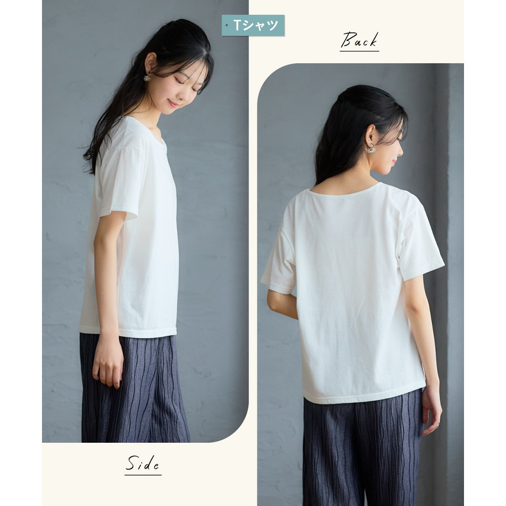 首元はベーシックなクルーネックを採用し、顔周りを明るく清潔感のある雰囲気に演出します。