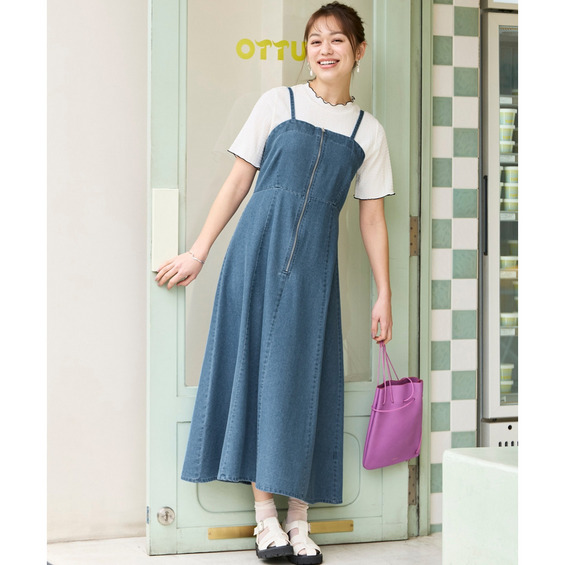 すっきり見える視覚効果とスタイルアップを両立させた、フロントジップデニムキャミワンピースが登場しました。