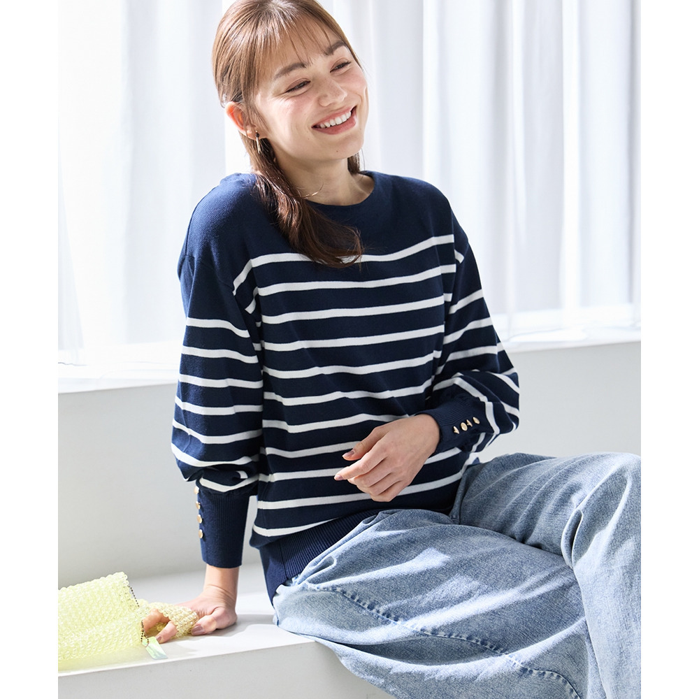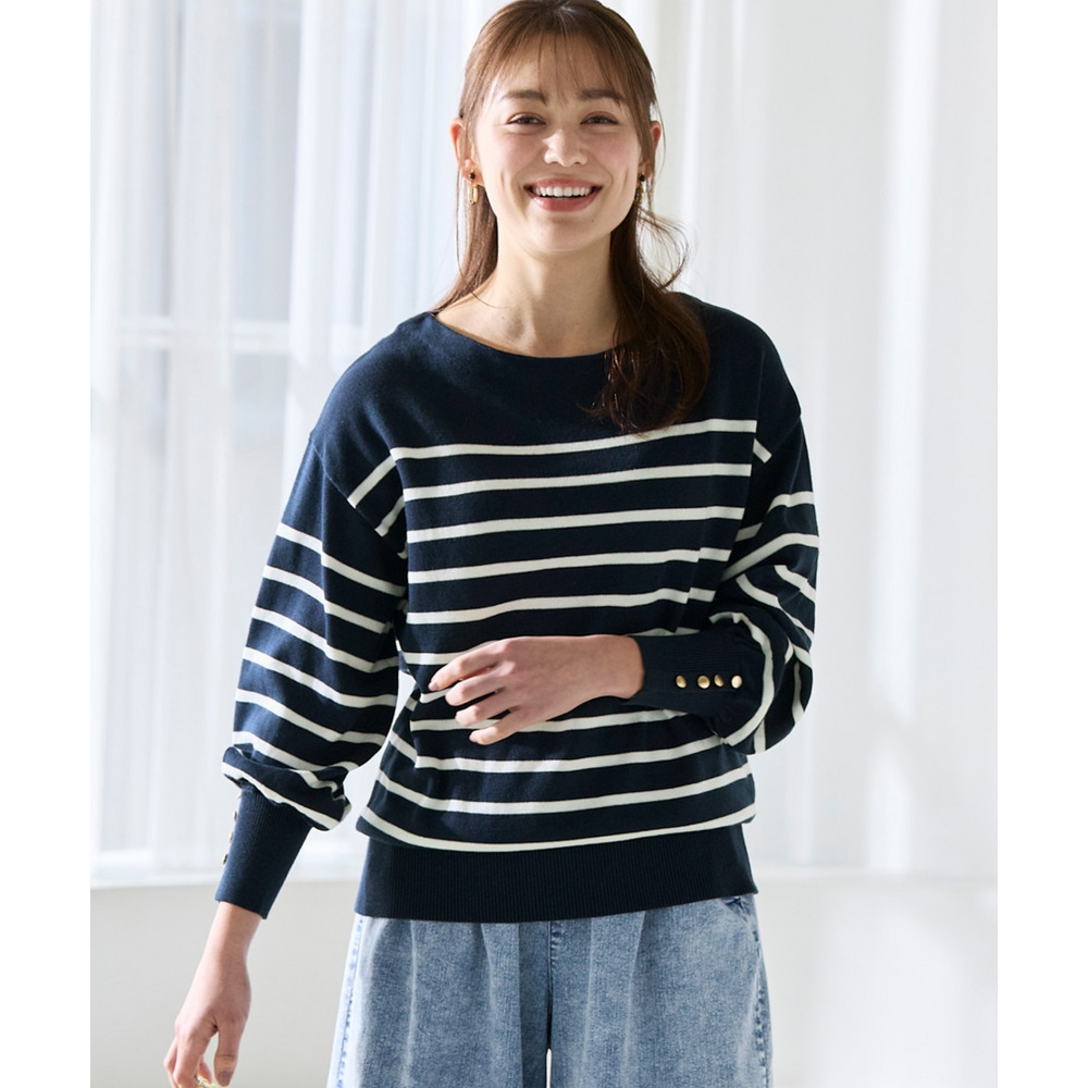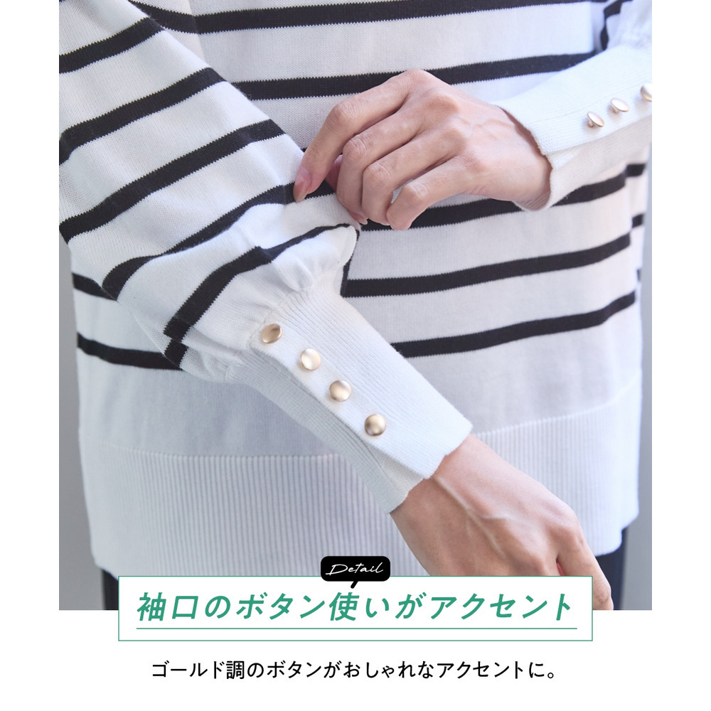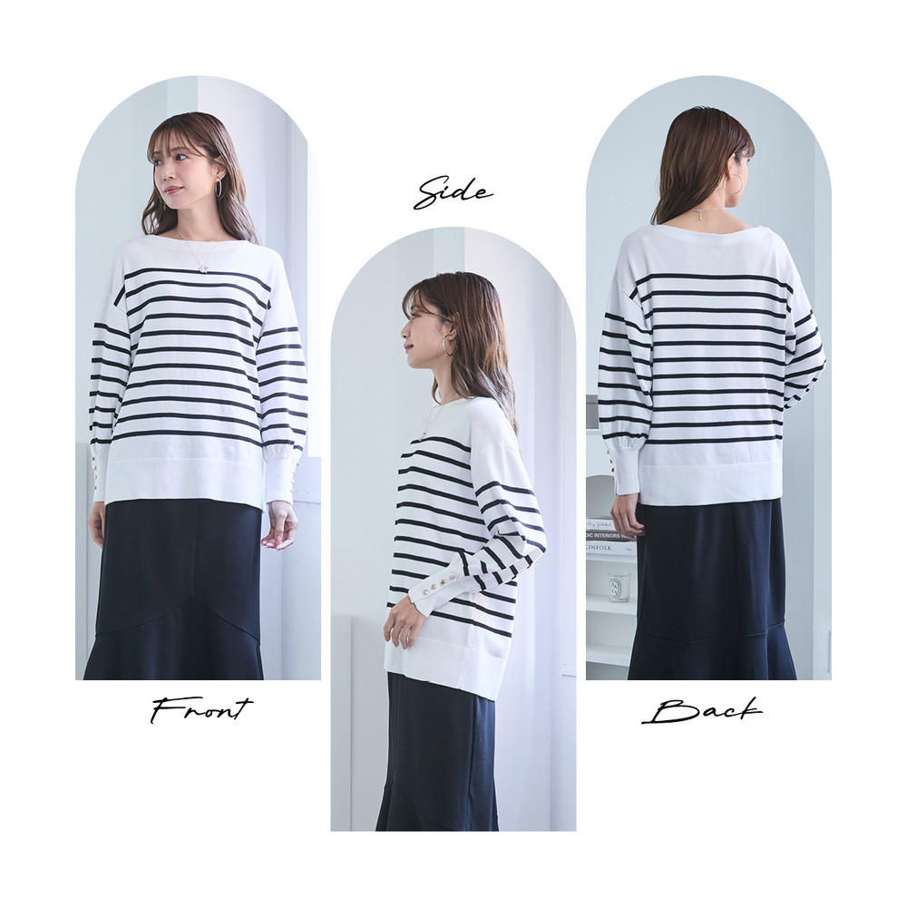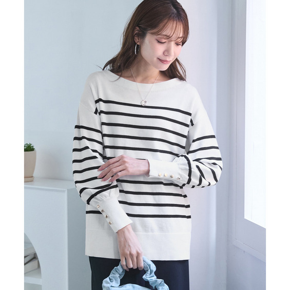 さらに、袖口にあしらわれた飾りボタンが品の良いアクセントとなり、カジュアルになりがちなボーダー柄を上品な大人の装いへと昇格させてくれます。