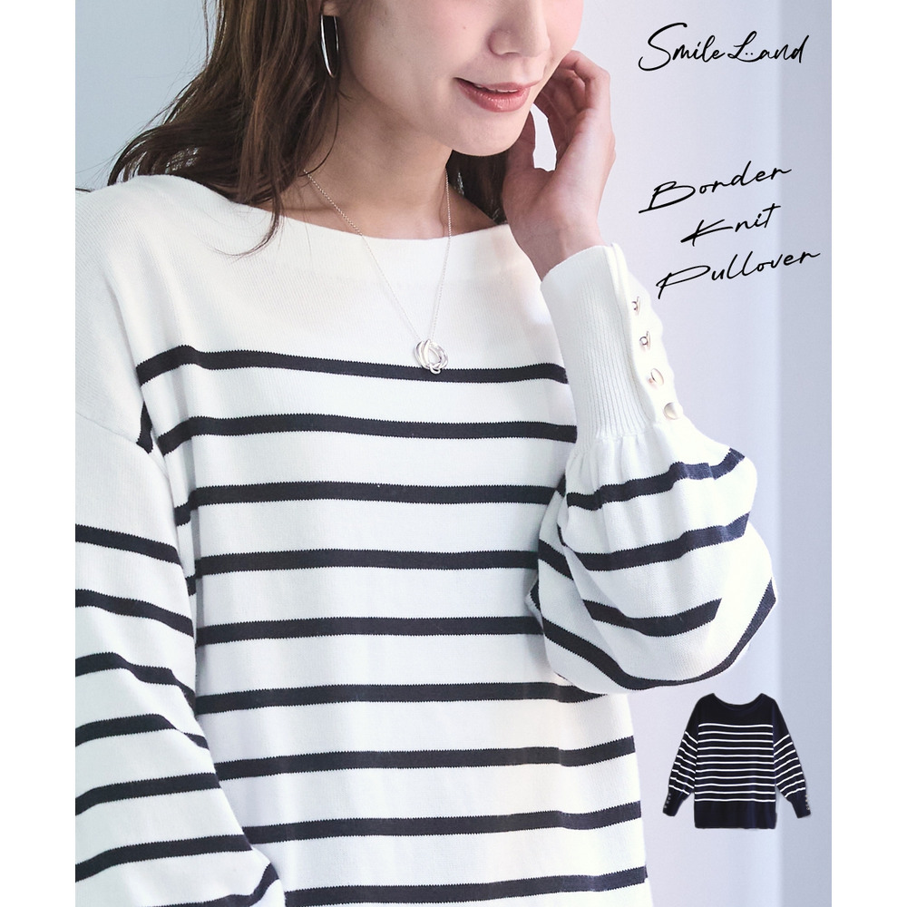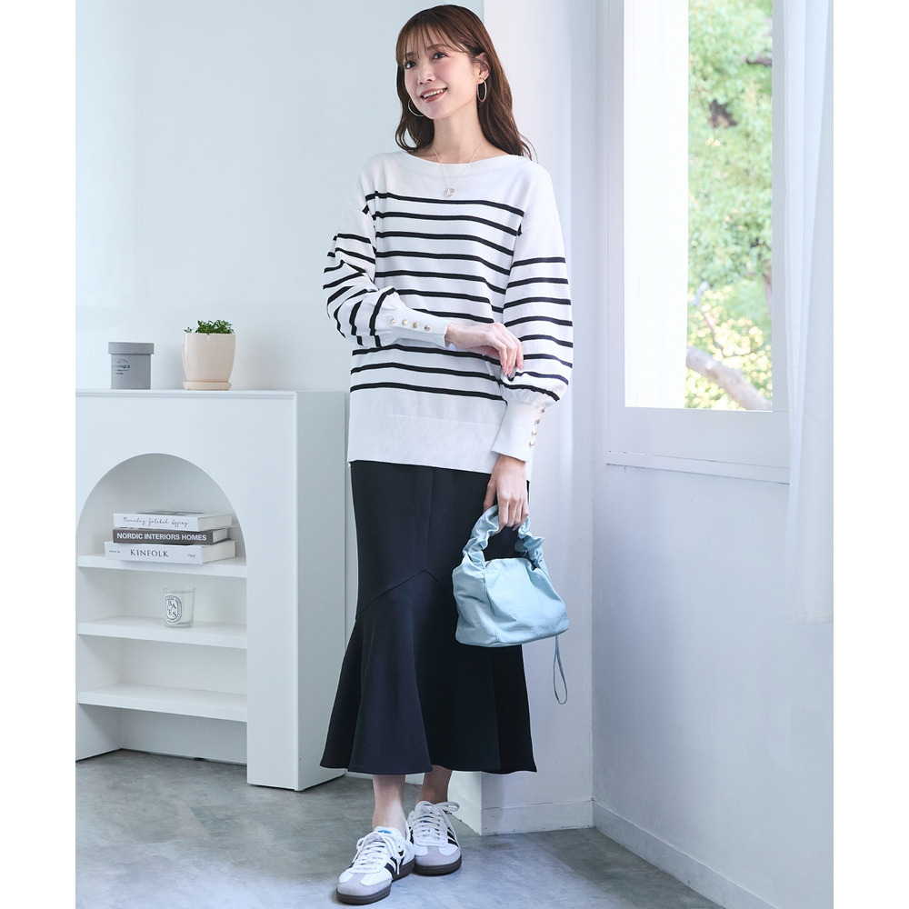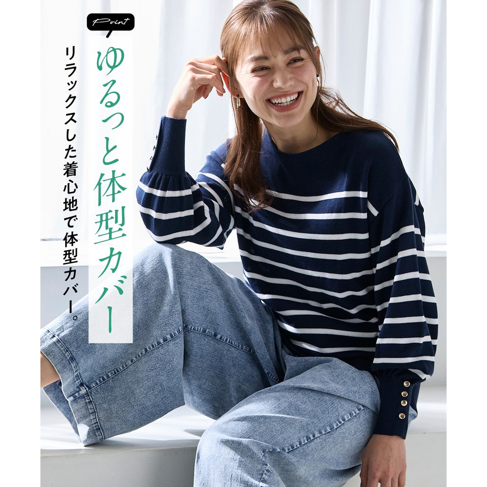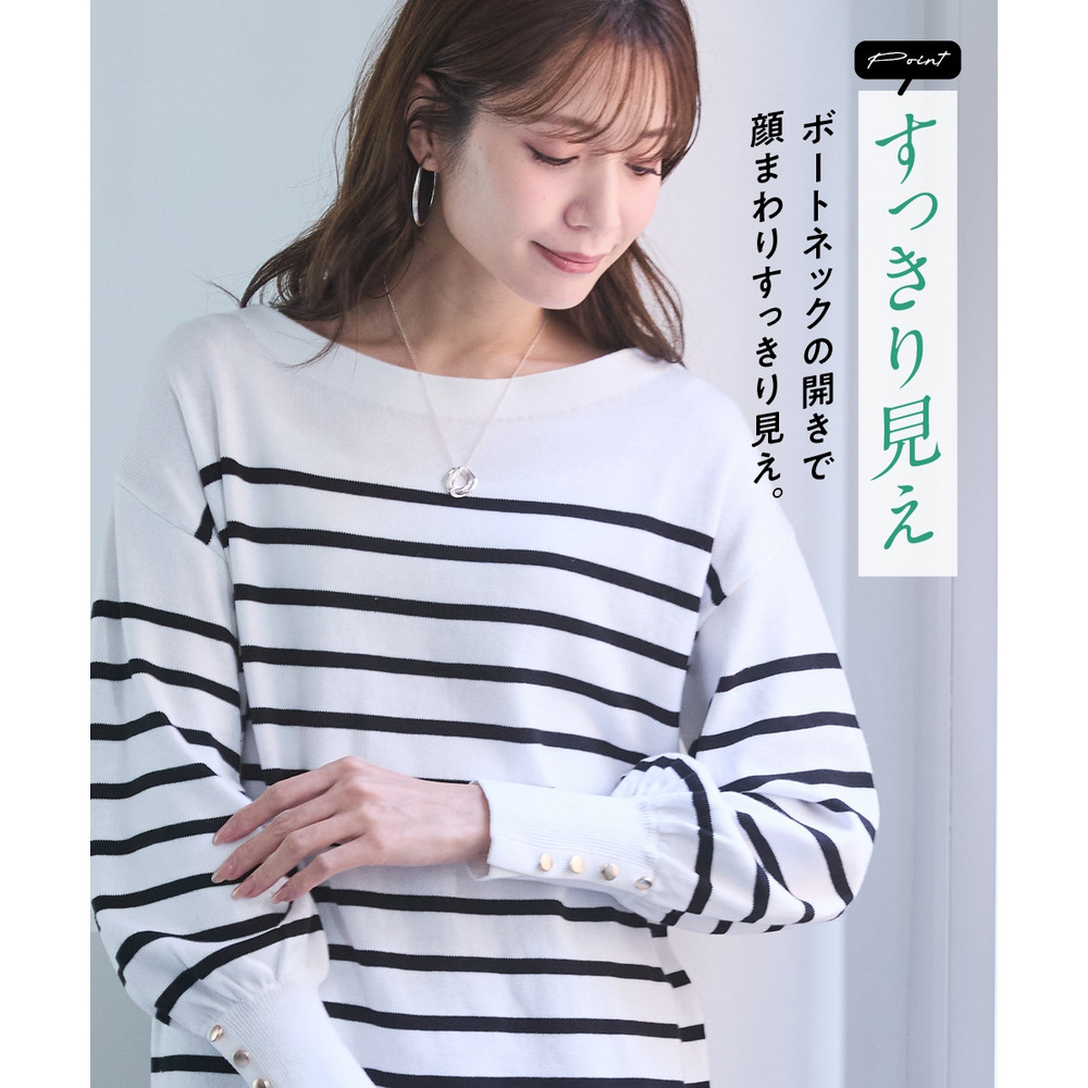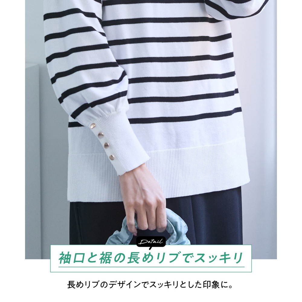 さらに、袖口にあしらわれた飾りボタンが品の良いアクセントとなり、カジュアルになりがちなボーダー柄を上品な大人の装いへと昇格させてくれます。