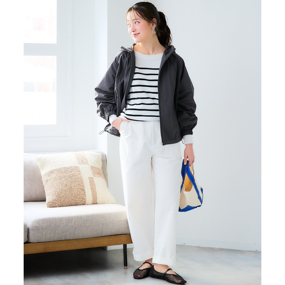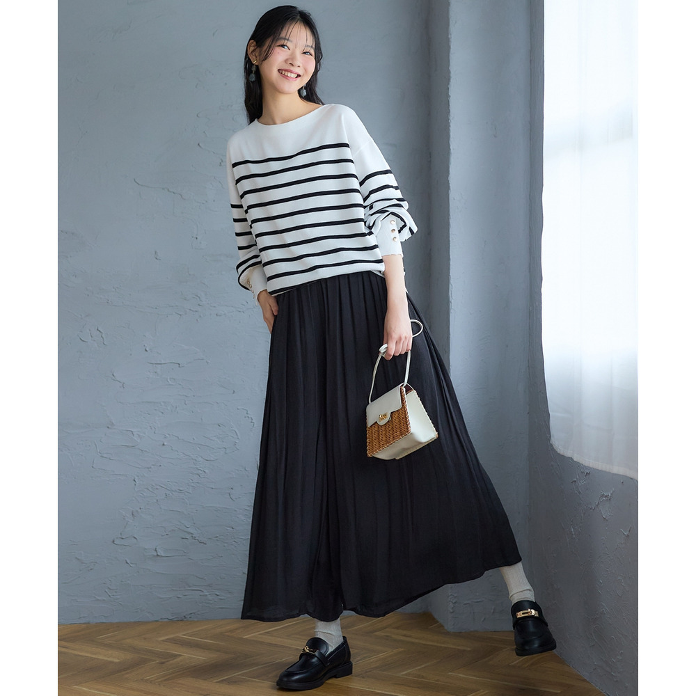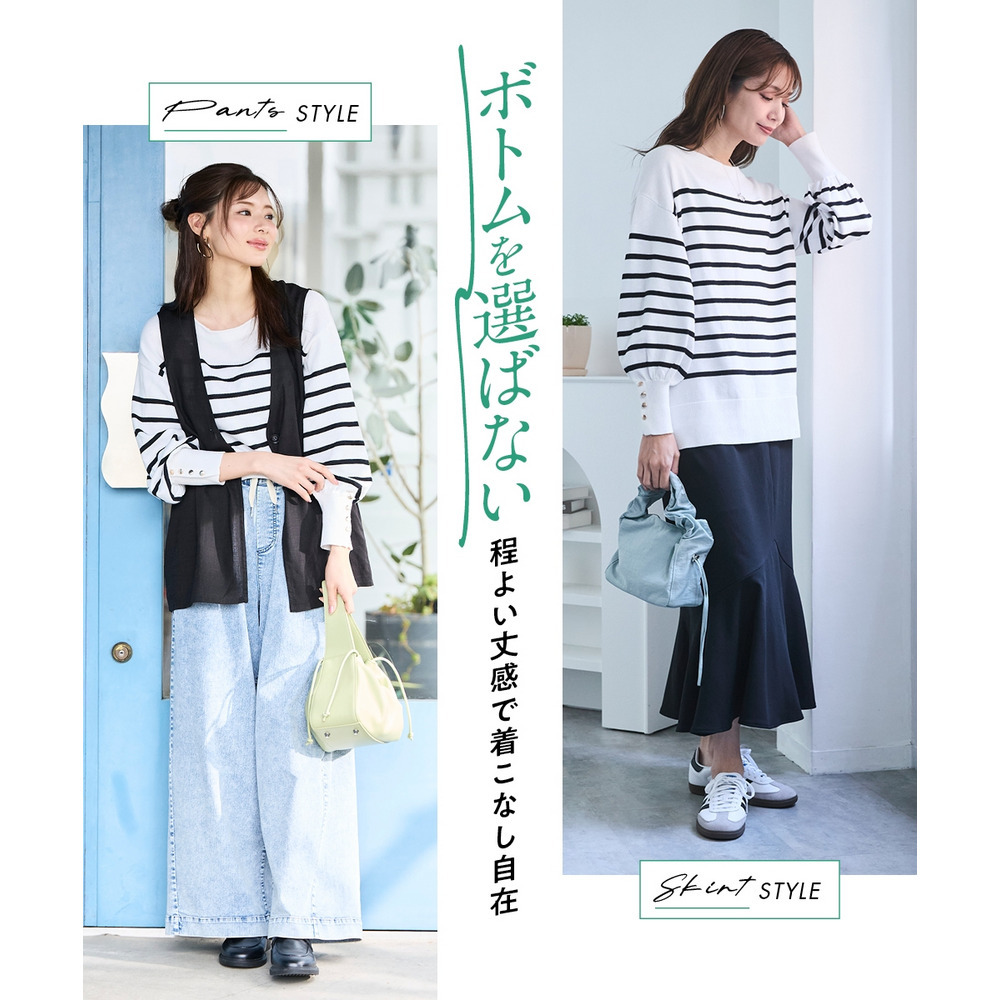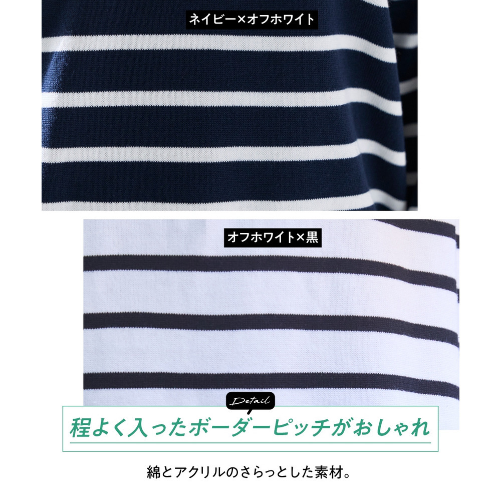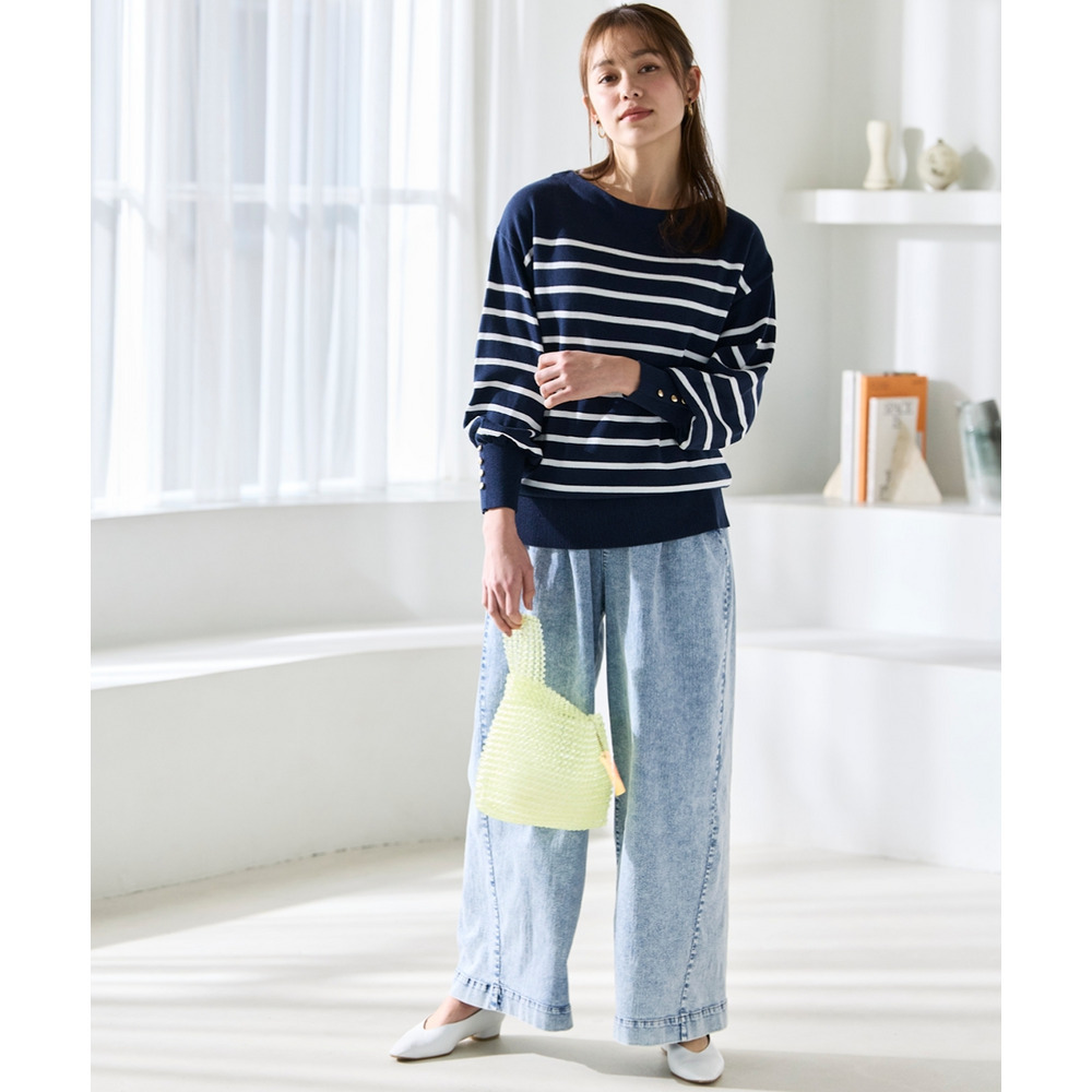 さらに、袖口にあしらわれた飾りボタンが品の良いアクセントとなり、カジュアルになりがちなボーダー柄を上品な大人の装いへと昇格させてくれます。