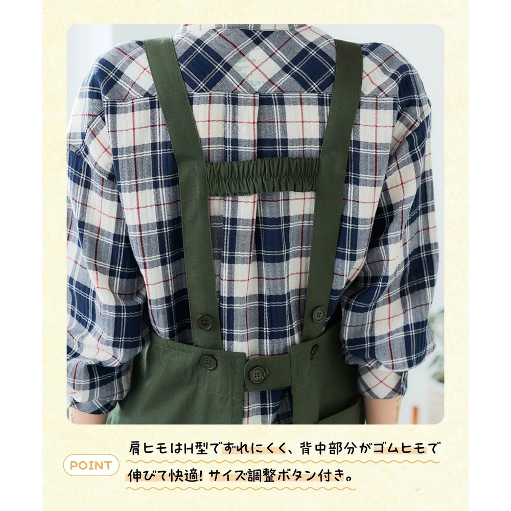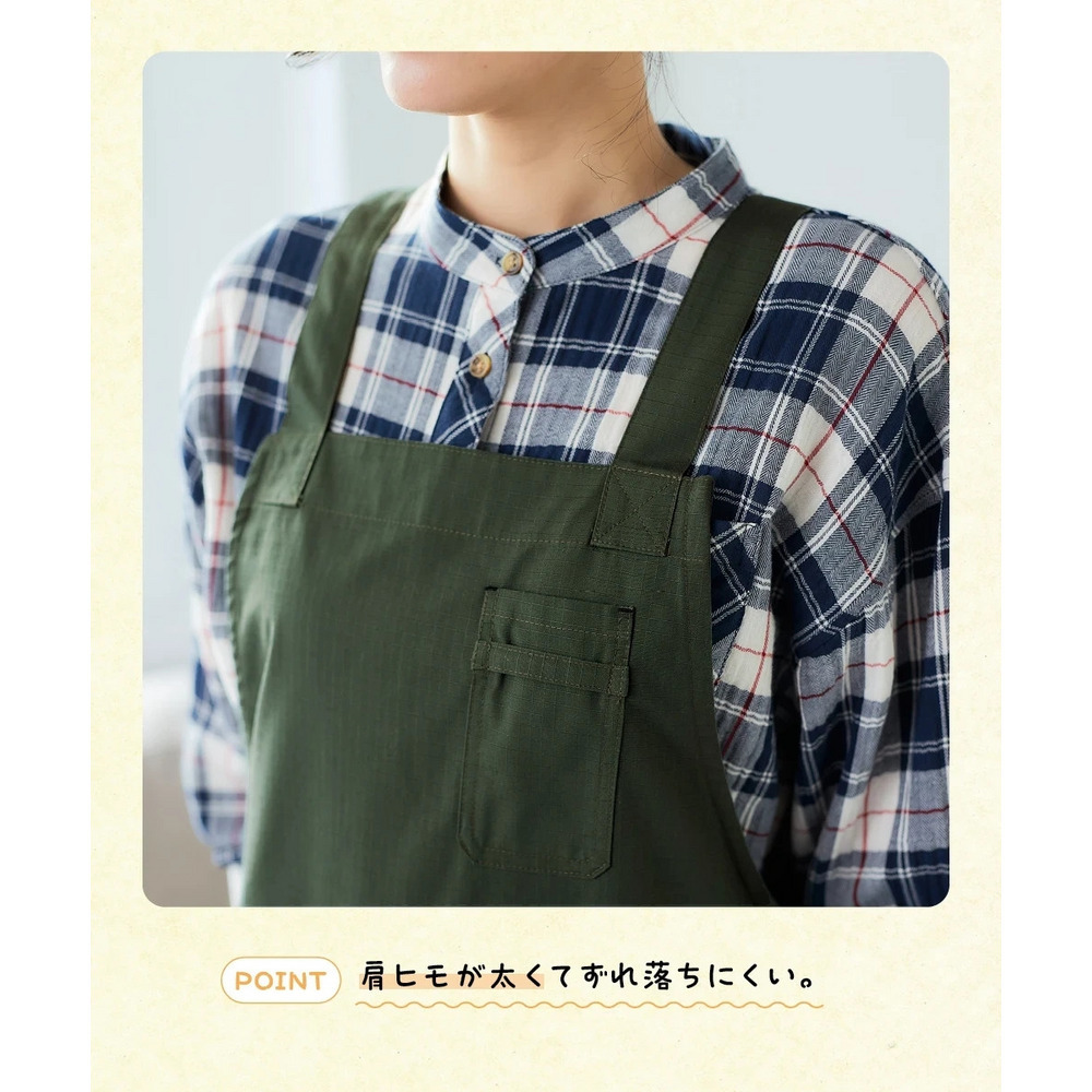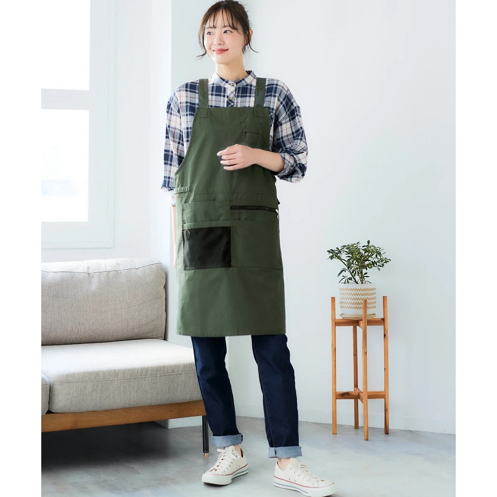 素材 品質:ポリエステル65%・綿35% 胸ポケット1つ・ポケット4つ・内ポケット1つ・後ろポケット1つ タオルフック1つ 左タブ1つ ポケット内Dカン1つ 肩ひも調整可 ウエスト調整ボタン付 商品のサイズはエプロンの下に軽衣料を着用した上で適正になるような設計にしております。 透け感:透けにくい 伸縮性:なし 生地の厚み:普通 光沢感:なし 裏地:なし ポケット:あり シルエット:ゆったり