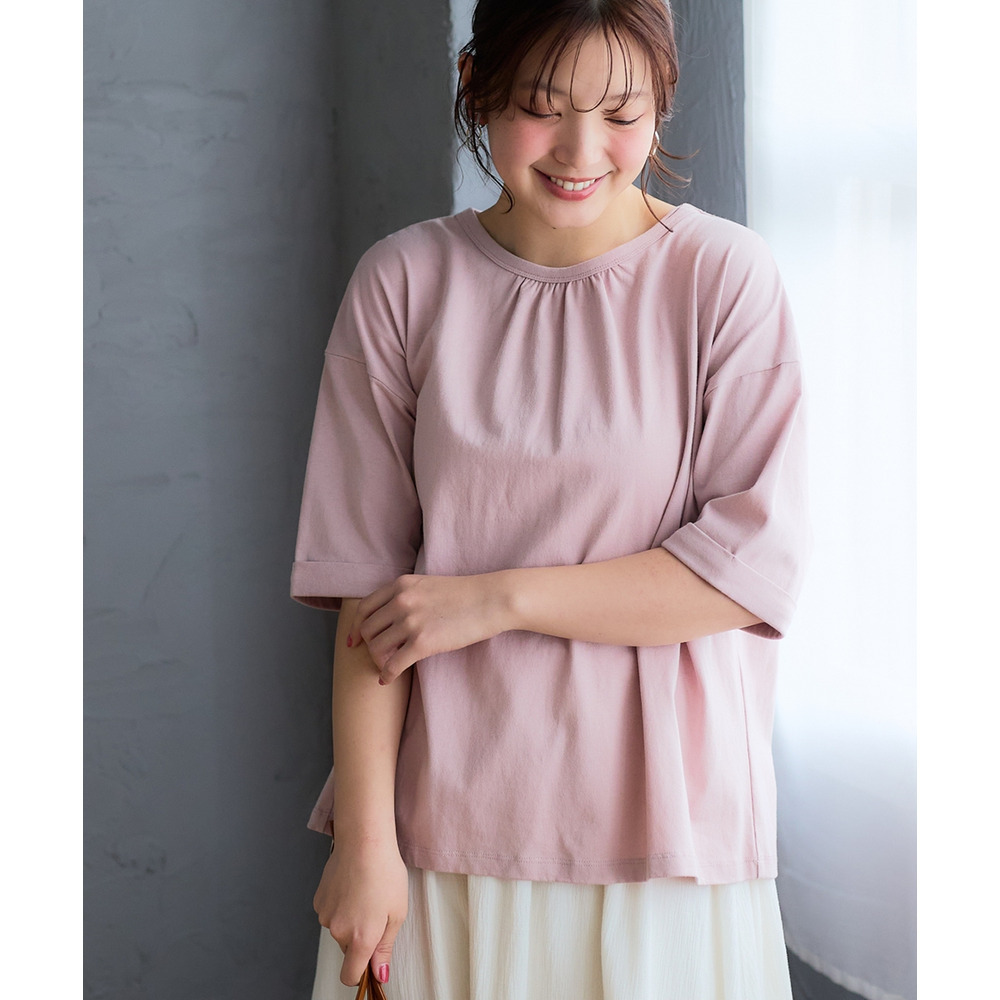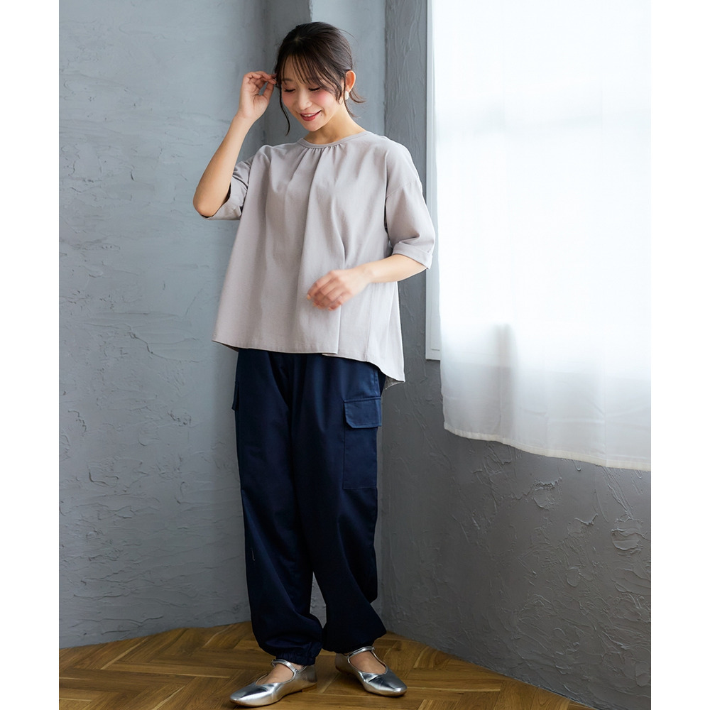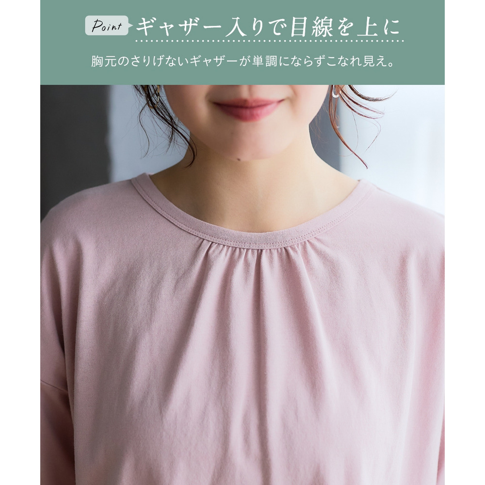 フロントの襟ぐりには繊細なギャザーを寄せ、顔周りを華やかかつ柔らかな印象に。