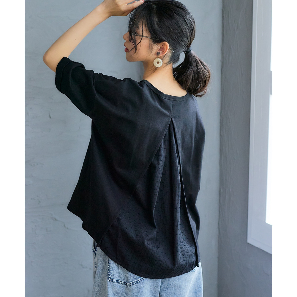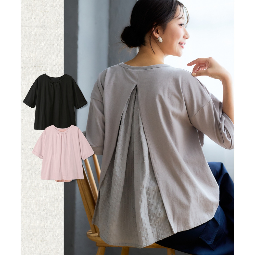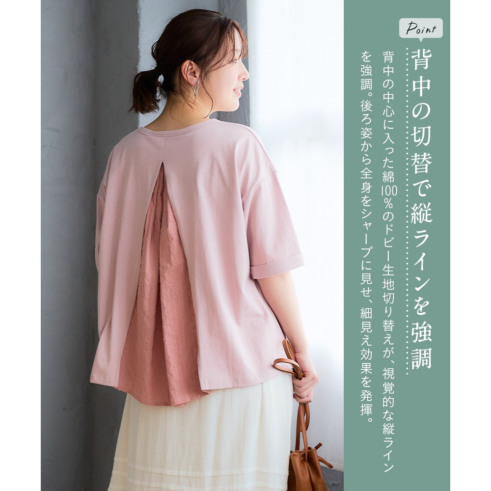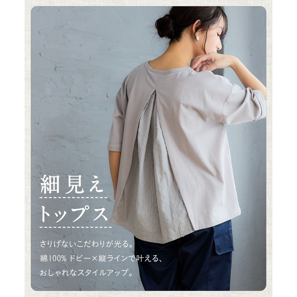 このトップスの最大の魅力は、背中中央に施されたドビー生地の切り替えデザインです。