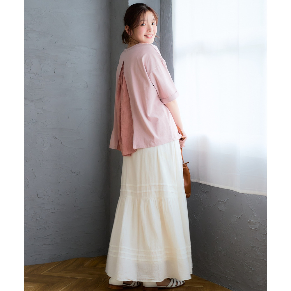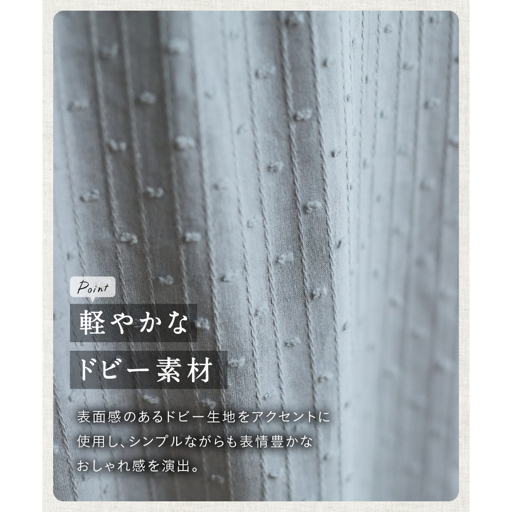バックの切り替え部分には、ぽこぽことした表面感が可愛いドビー生地を使用しており、異素材の組み合わせが奥行きのあるおしゃれを演出します。