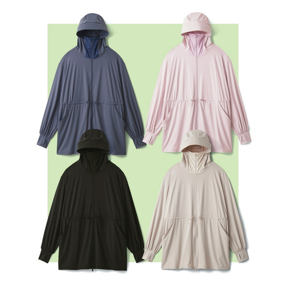 この一着は、深めのフードと指穴設計により、日差しが気になる顔まわりから手の甲まで徹底的にカバーします。