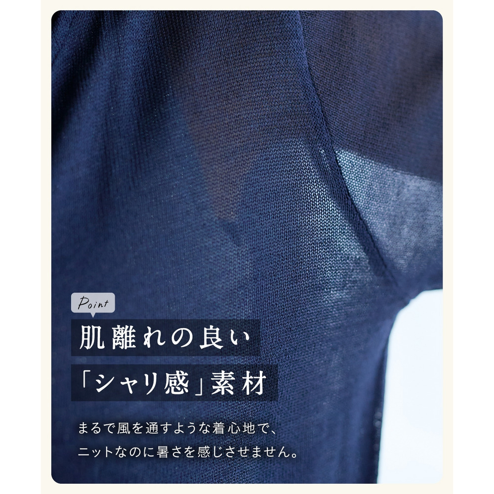 ニット特有の柔らかさがありながらも、独特のシャリっとした質感が肌離れを良くし、汗ばむ時期でもべたつかず、常に爽やかな着心地をキープします。