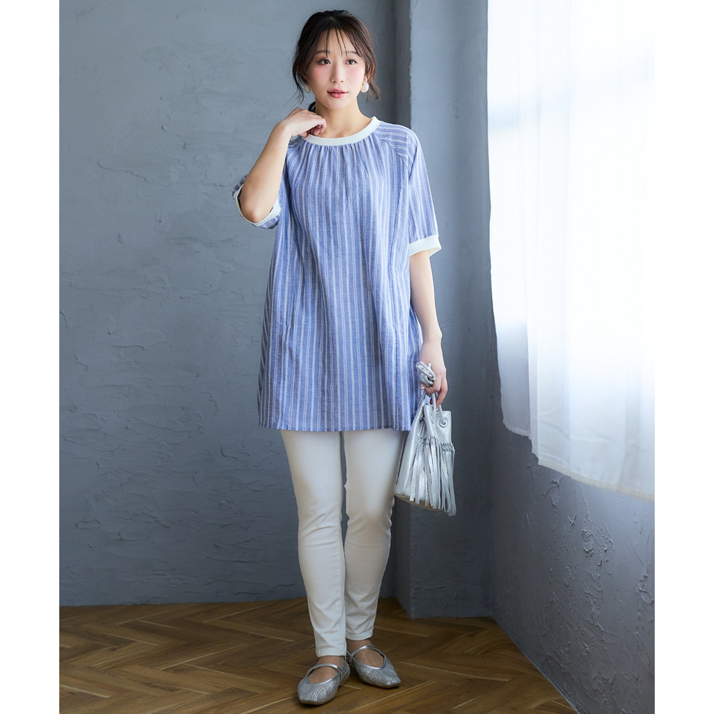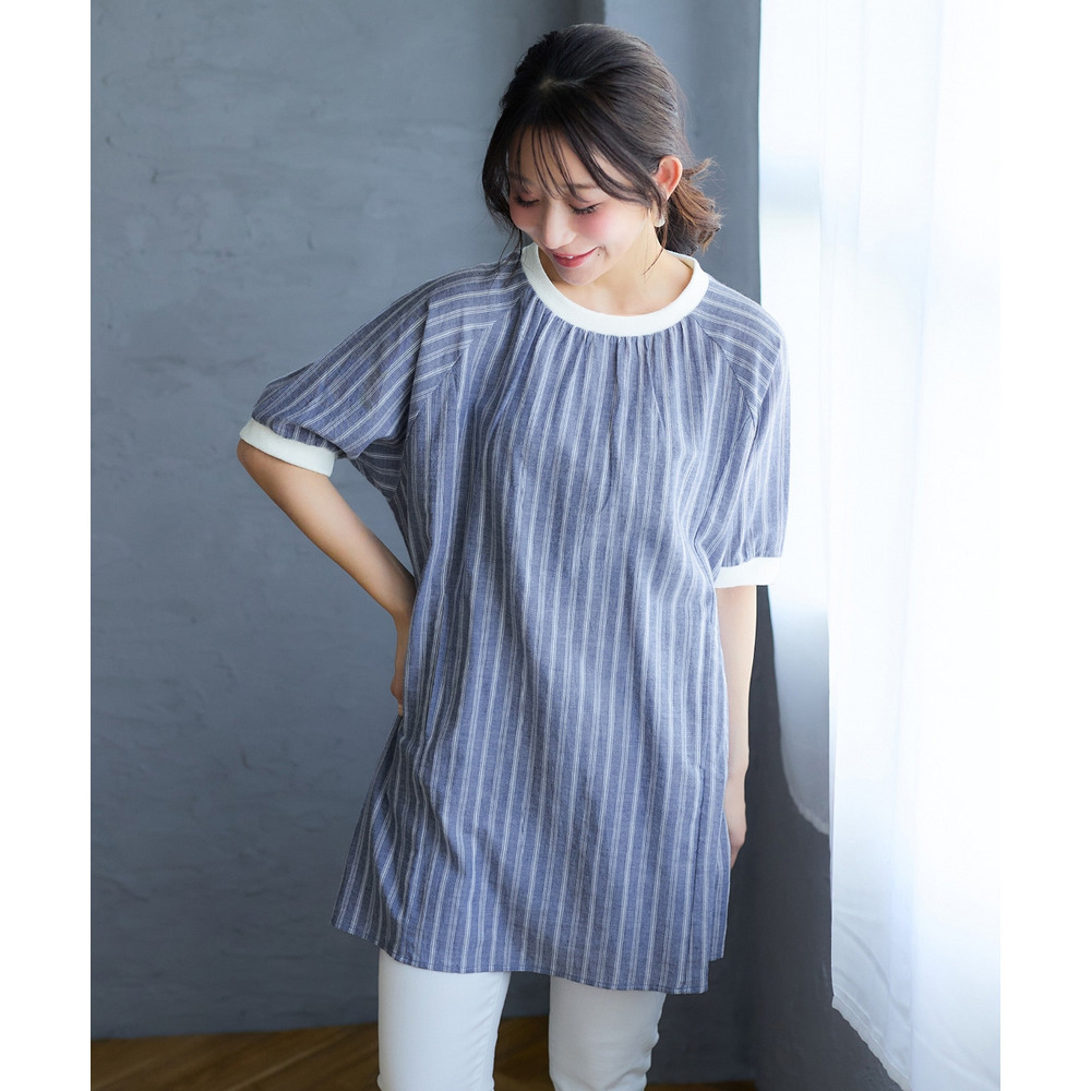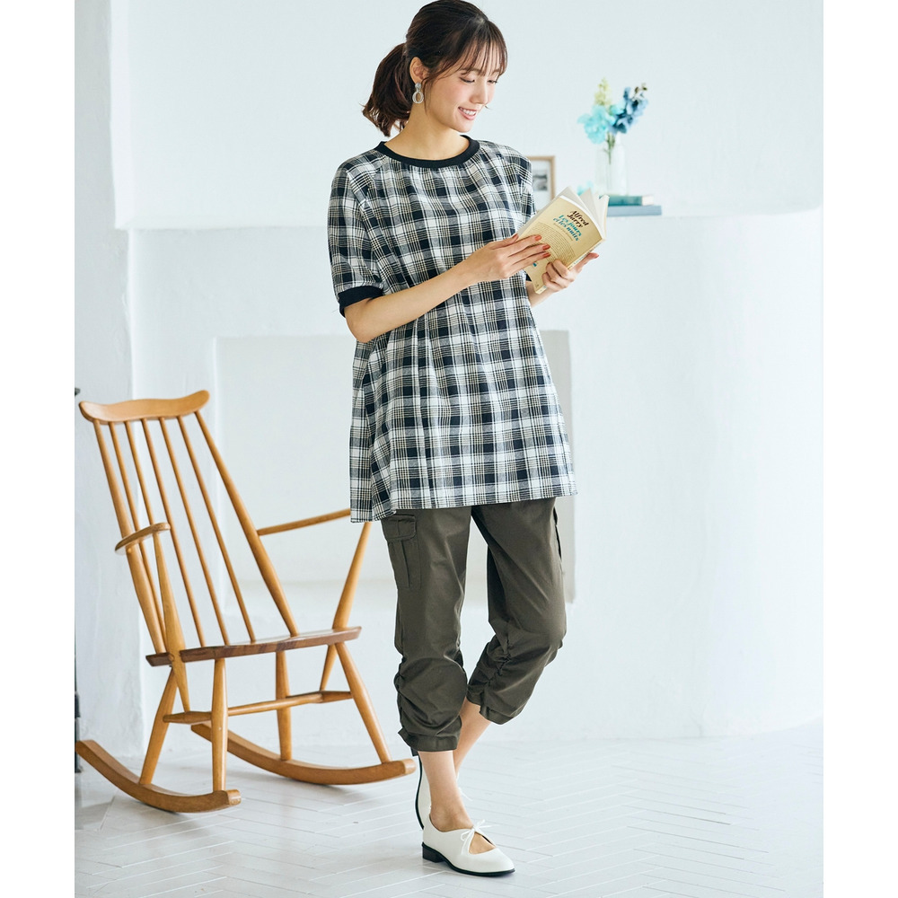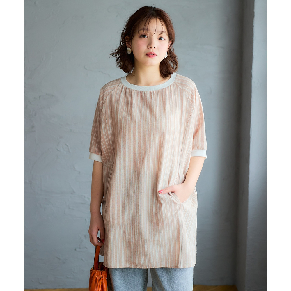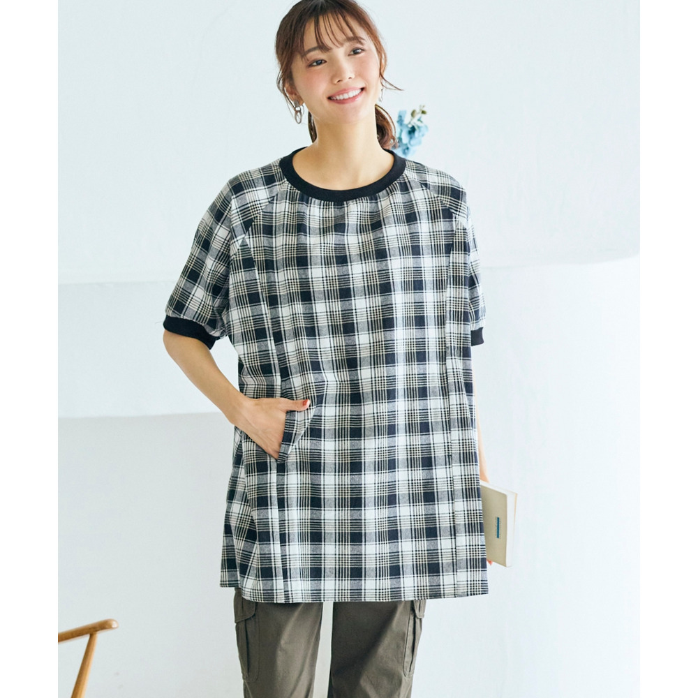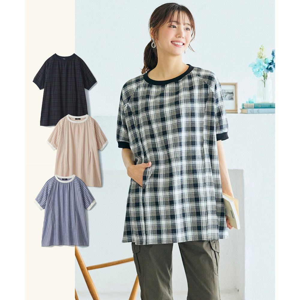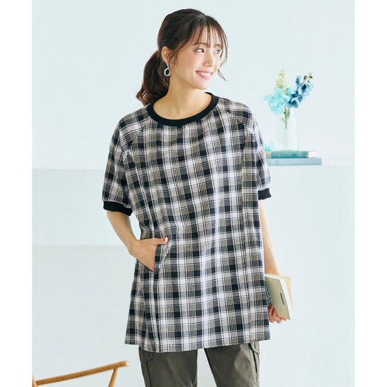 気になるお腹周りやヒップを自然に隠してくれる長めのチュニック丈は、リラックス感がありながらも、配色リブの引き締め効果ですっきりとした印象に。