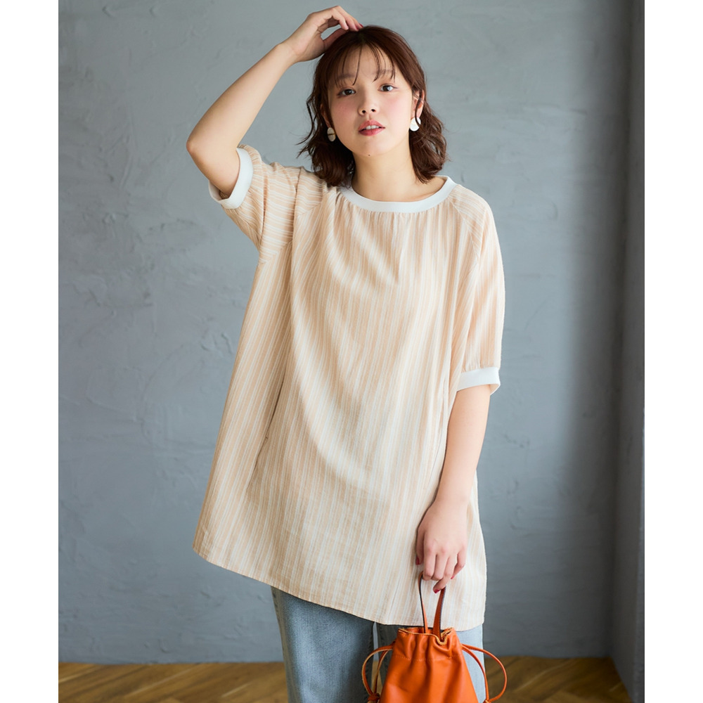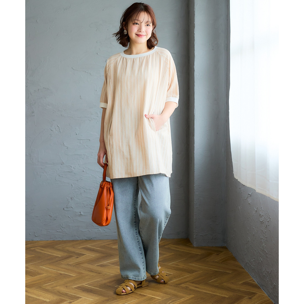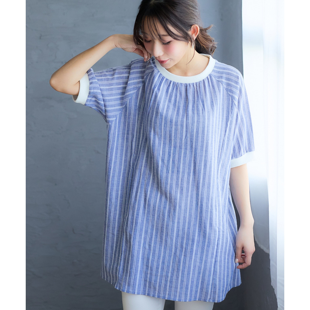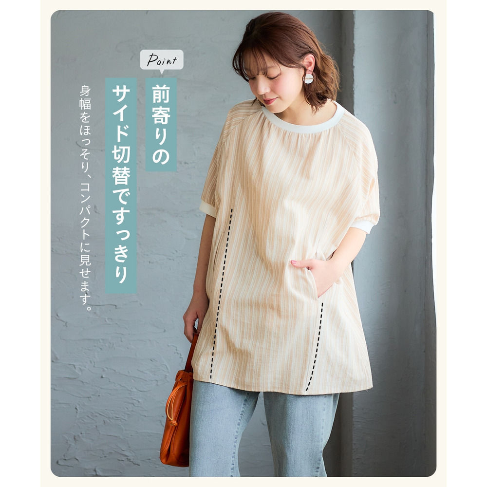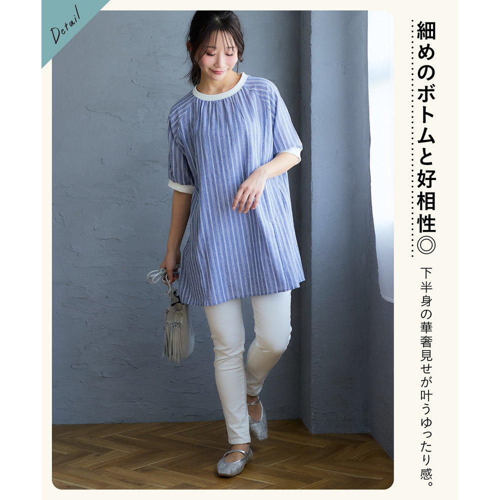 気になるお腹周りやヒップを自然に隠してくれる長めのチュニック丈は、リラックス感がありながらも、配色リブの引き締め効果ですっきりとした印象に。