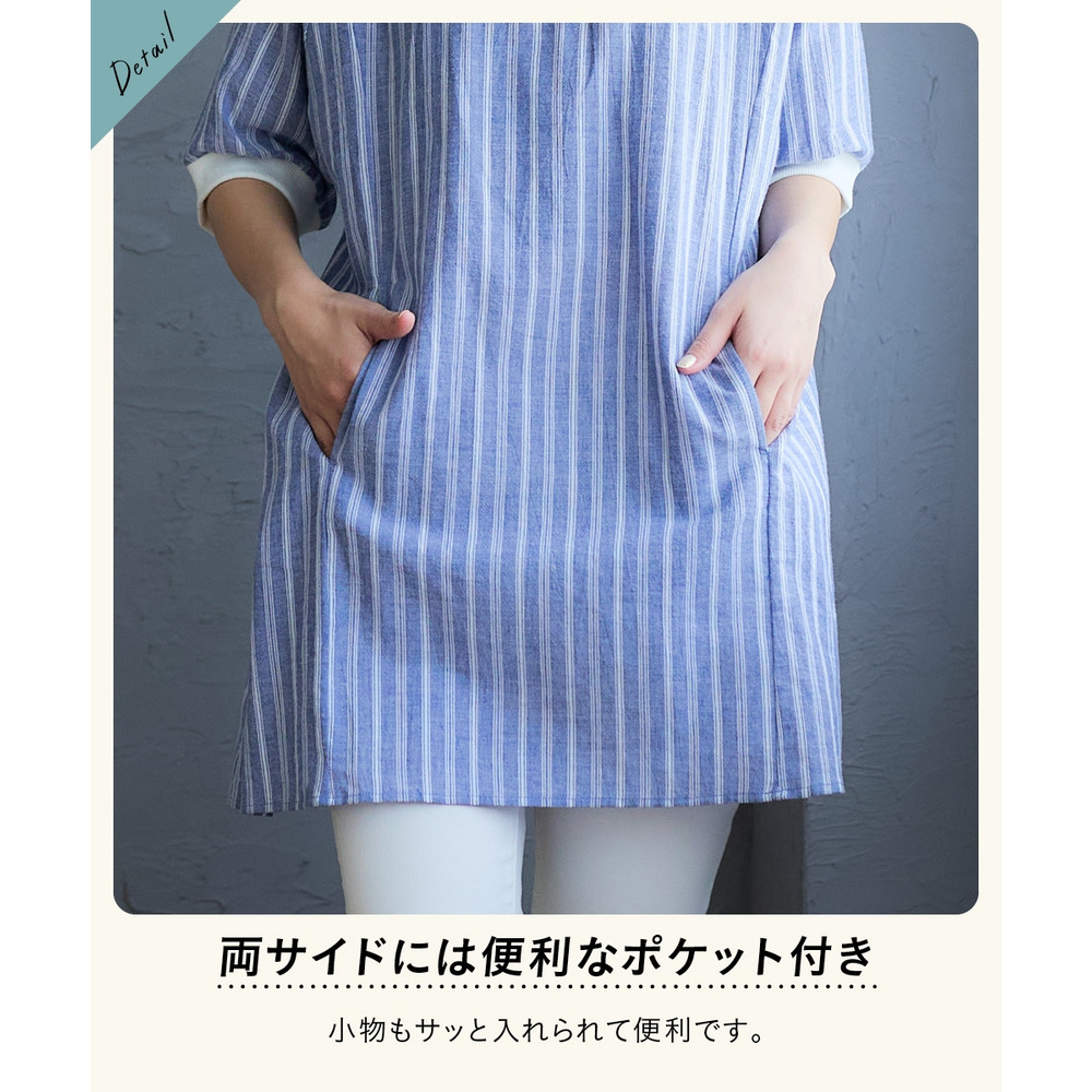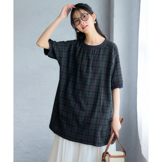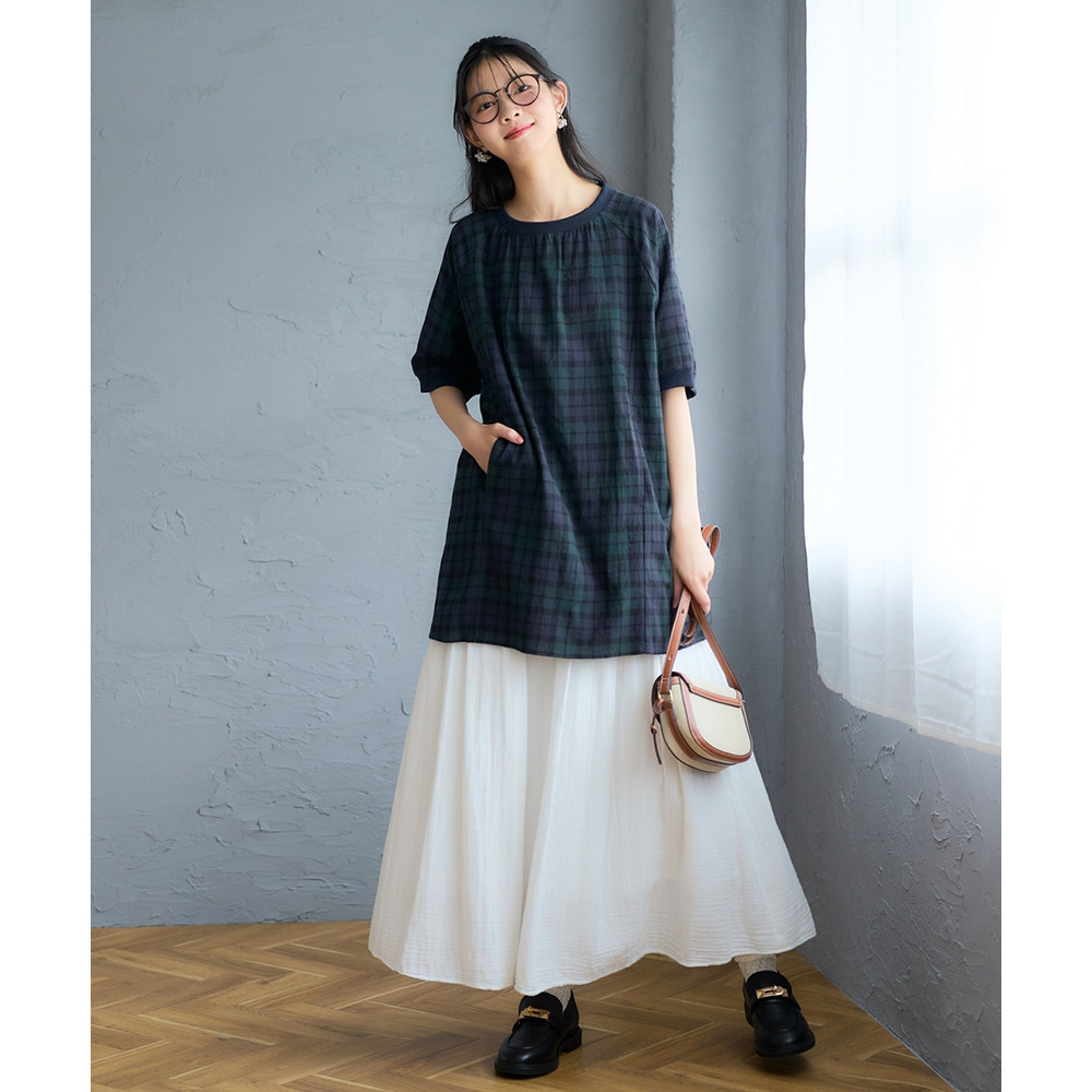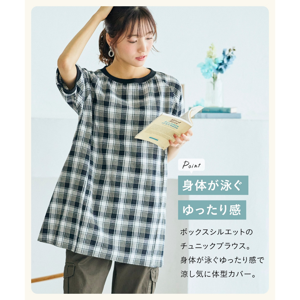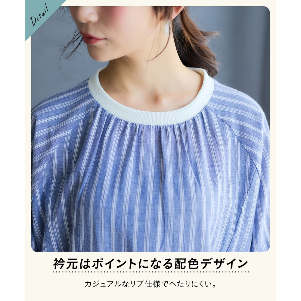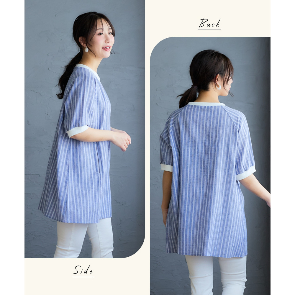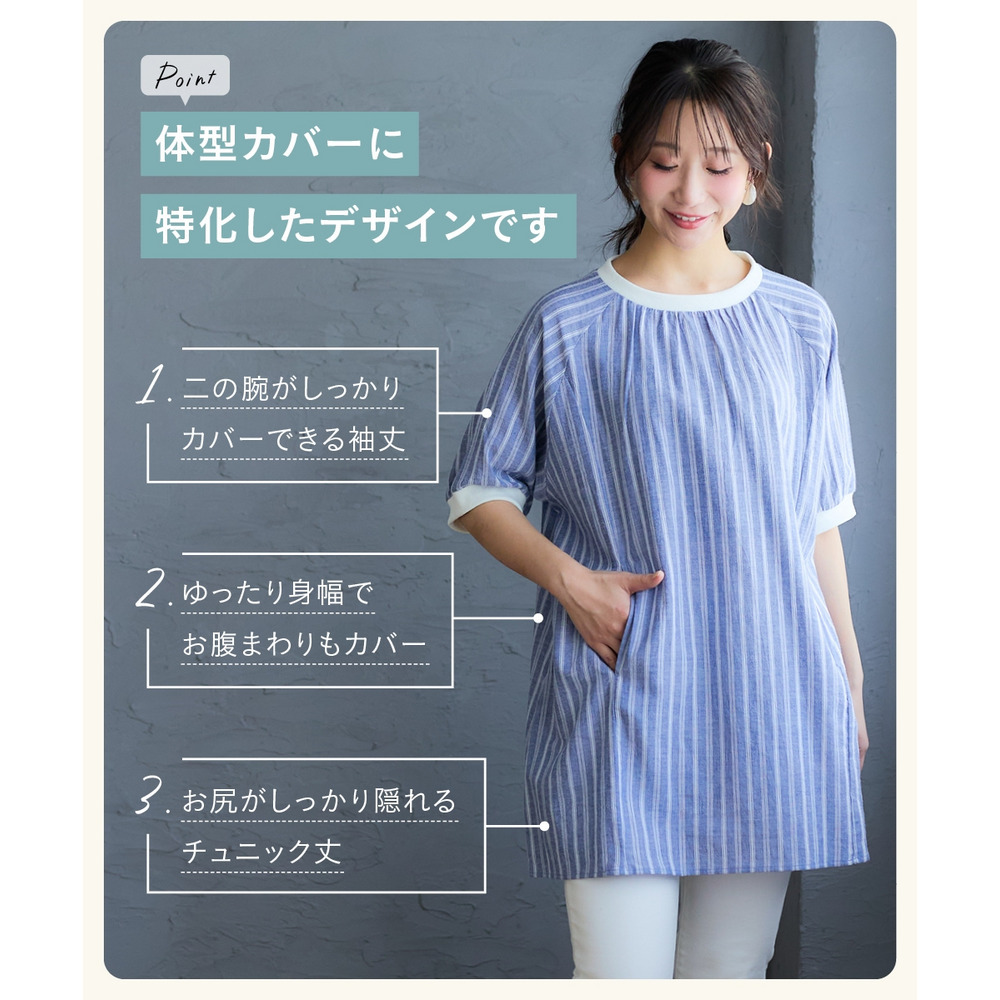 気になるお腹周りやヒップを自然に隠してくれる長めのチュニック丈は、リラックス感がありながらも、配色リブの引き締め効果ですっきりとした印象に。