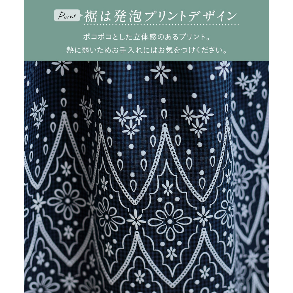 裾部分には存在感のある繊細な発泡プリントを施しており、シンプルなギンガムチェックをぐっと垢抜けた印象に格上げしています。