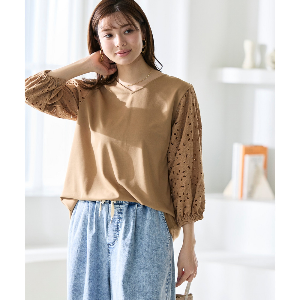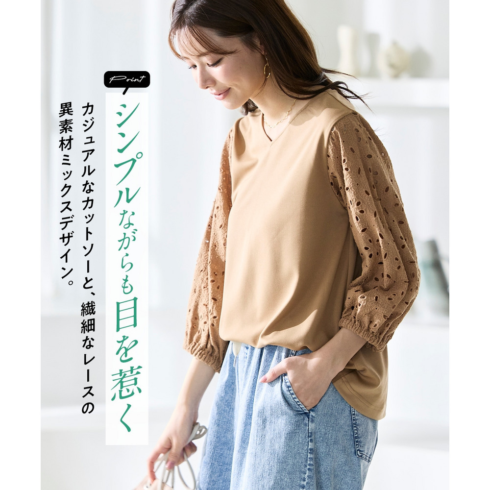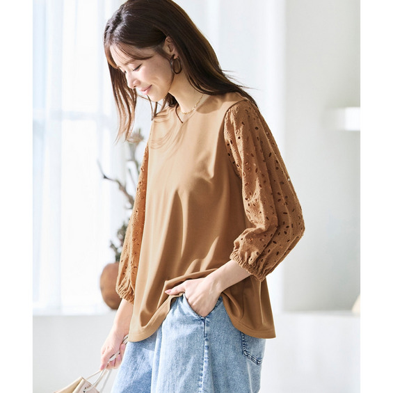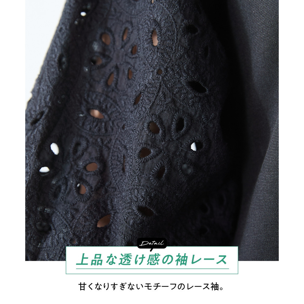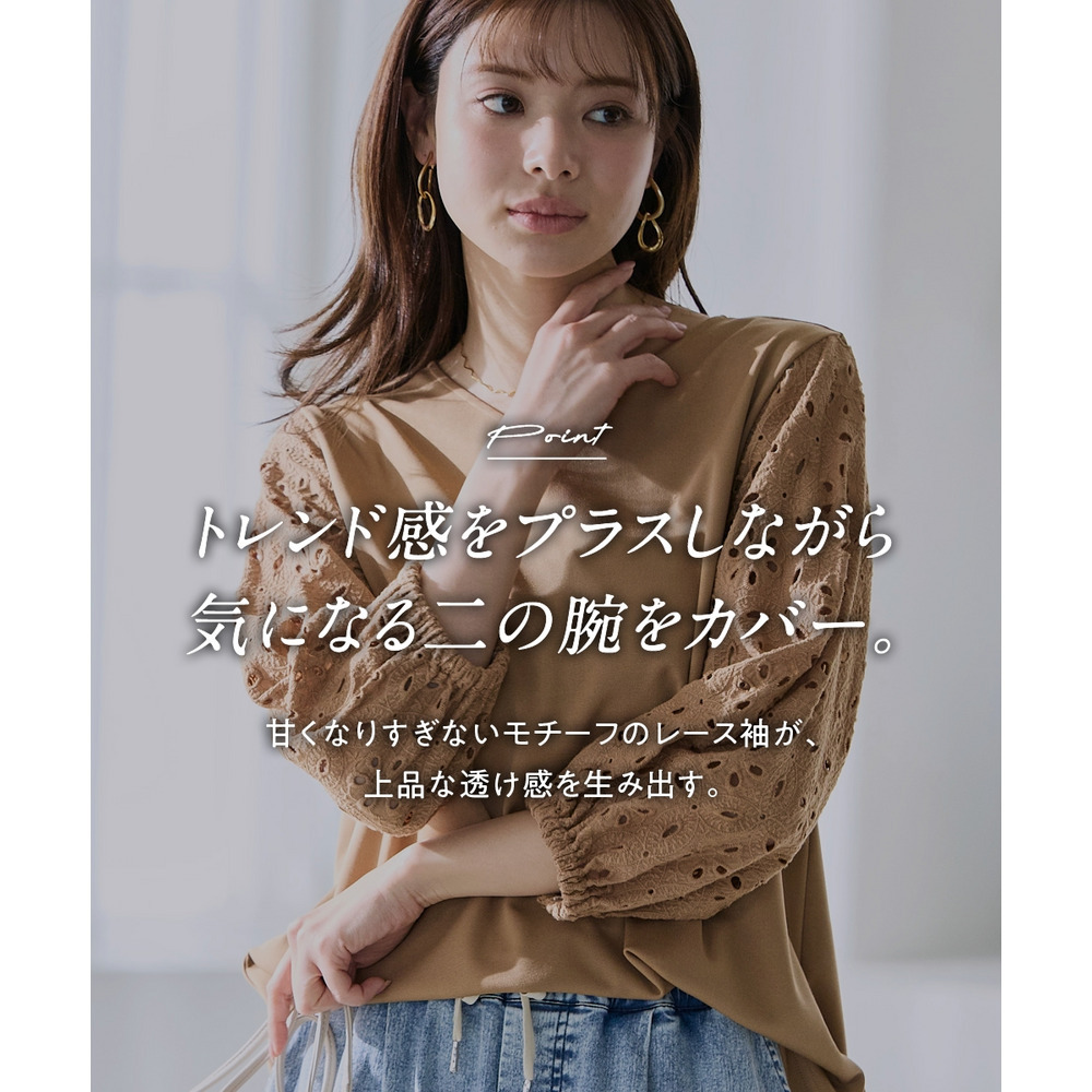 袖部分にはナチュラルな風合いが魅力の綿100%のレースを使用しており、異素材の組み合わせが奥行きのあるお洒落を演出。