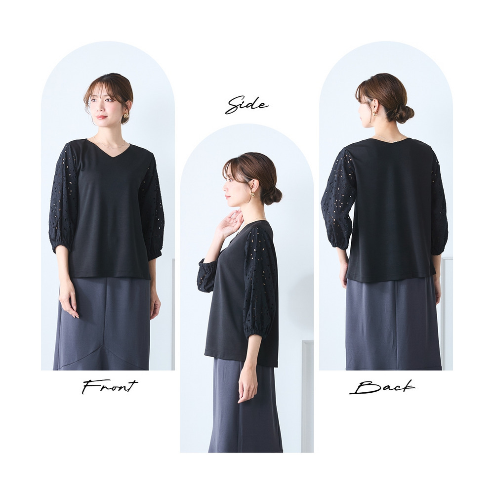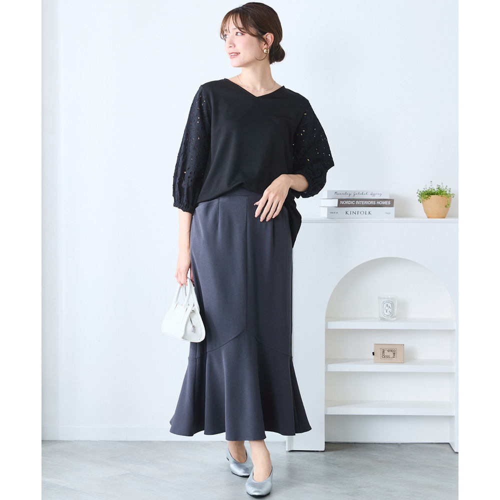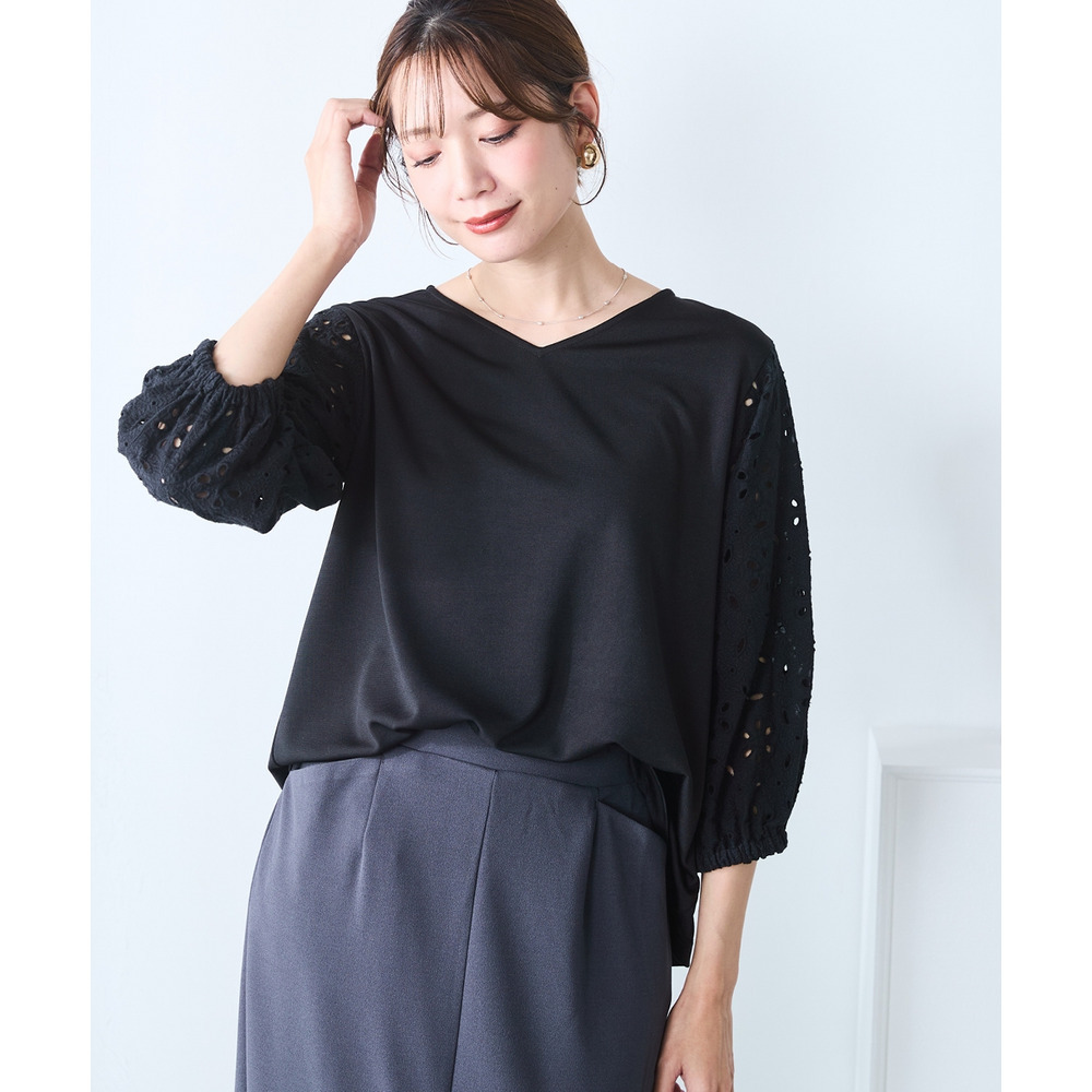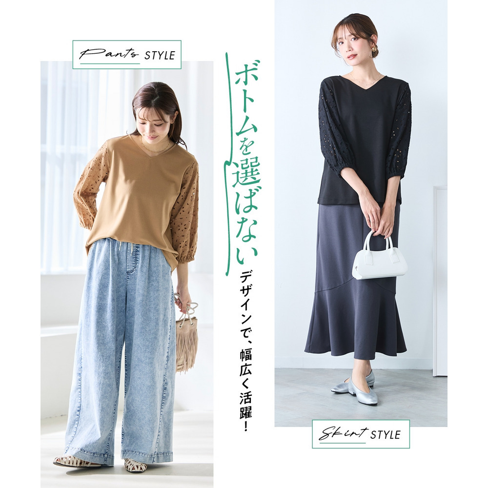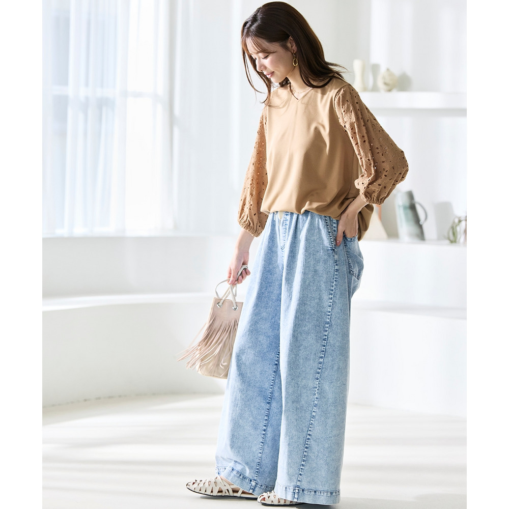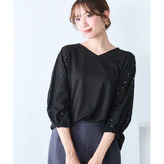 シンプルなボトムスを選ぶことで、袖の繊細なレースデザインがより一層際立ちます。