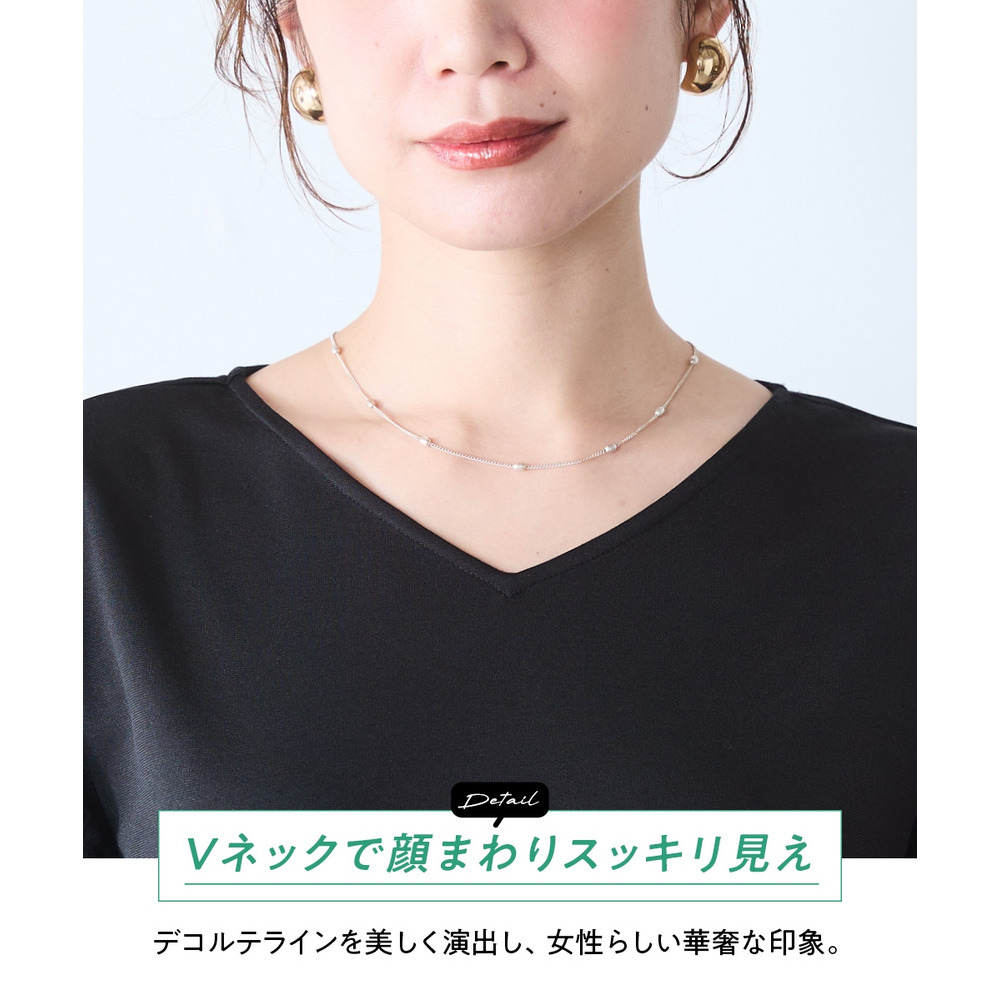 ゆったりとしたシルエットでありながら、広めに設計された緩やかなVネックラインがデコルテをすっきりと見せ、顔周りに優しく知的な表情をプラス。