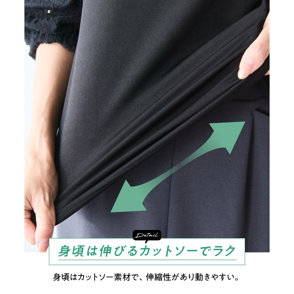 気になる二の腕を自然にカバーするボリューム袖は、袖口にゴムを入れることでブラウジングもしやすく、手首を細く見せる華奢見え効果も期待できます。