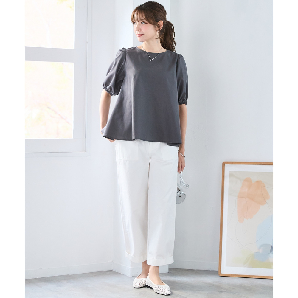 このブラウスの持ち味である緩やかなAラインを活かした、大人可愛いカジュアルスタイルがおすすめです。