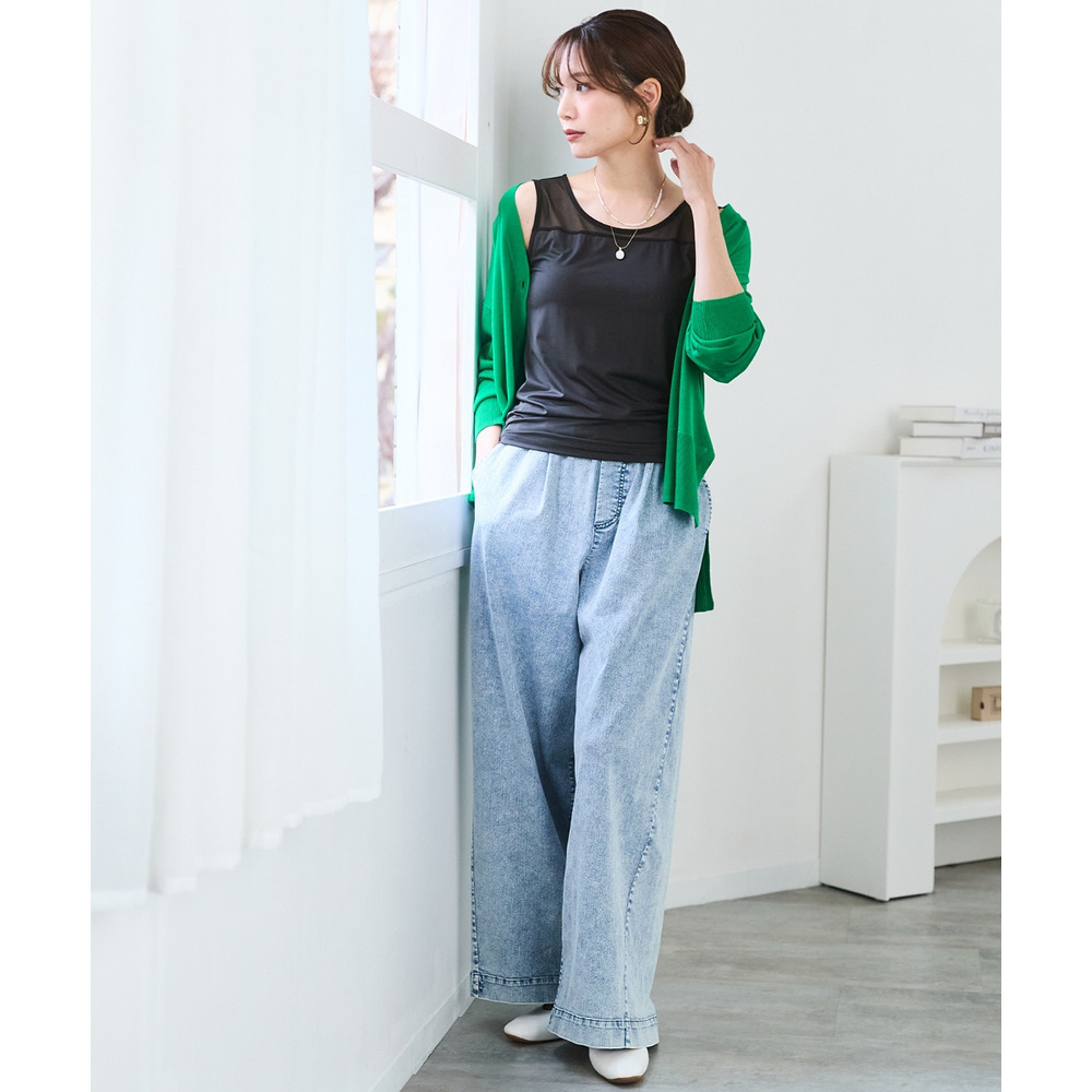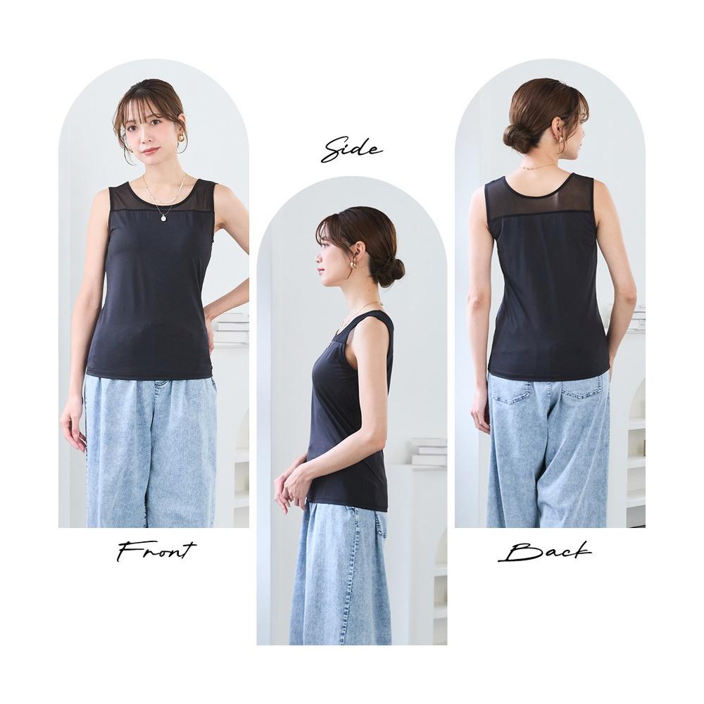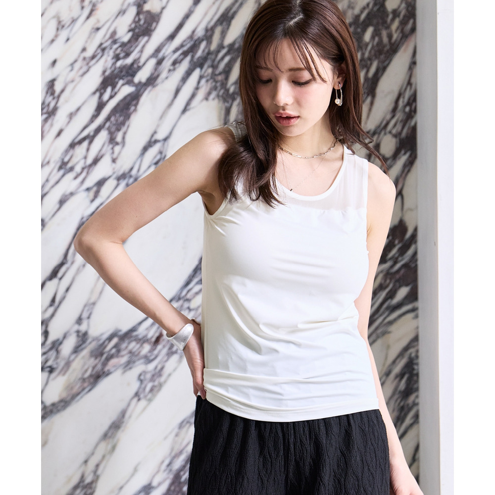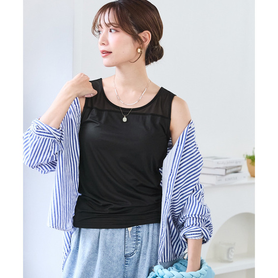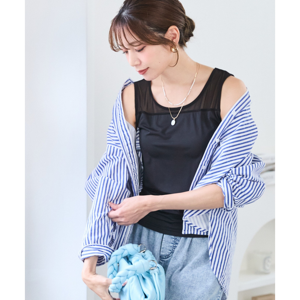ジャケットやカーディガンのインナーとして着用すれば、衿元から覗くシアー素材がスタイリングに軽やかさとトレンド感を運びます。
