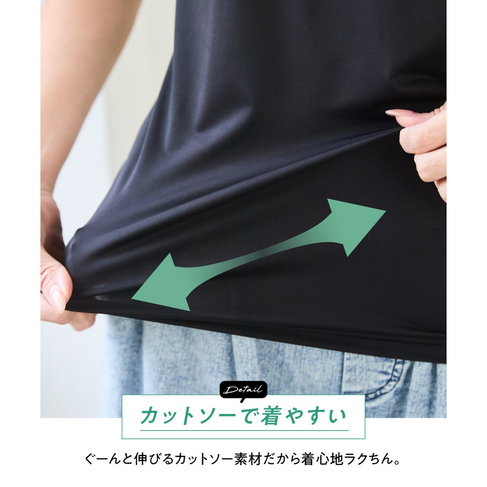 身頃は肌馴染みの良いカットソー素材を採用しており、程よいフィット感がありながらも、気になるお腹周りを優しくカバーする丈感にこだわりました。