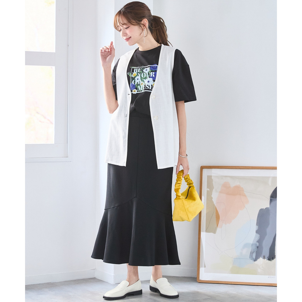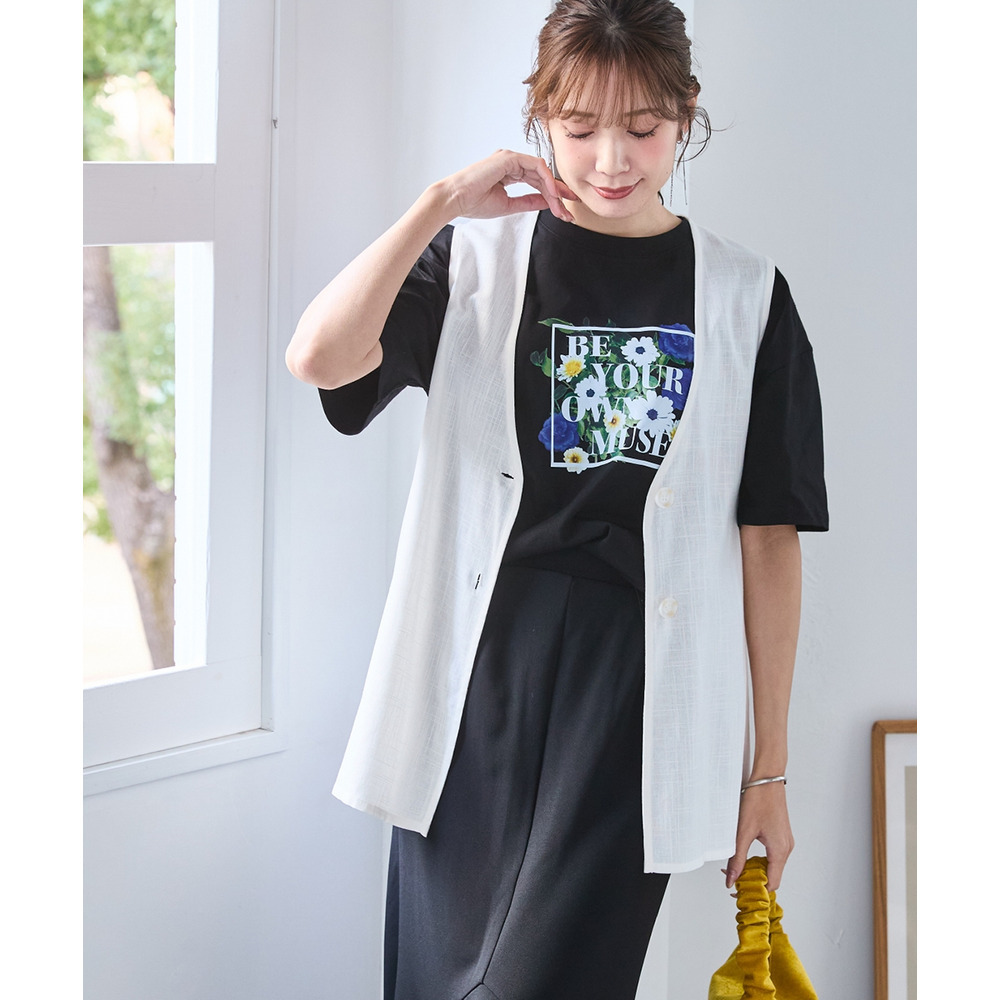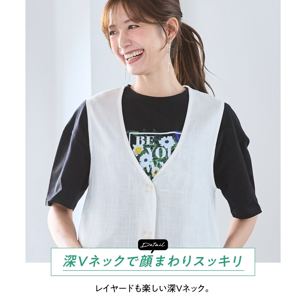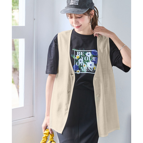 シンプルなTシャツにデニムという定番のスタイルも、このジレを一枚重ねるだけで、ぐっとこなれ感のあるトレンドコーデにアップデートされます。