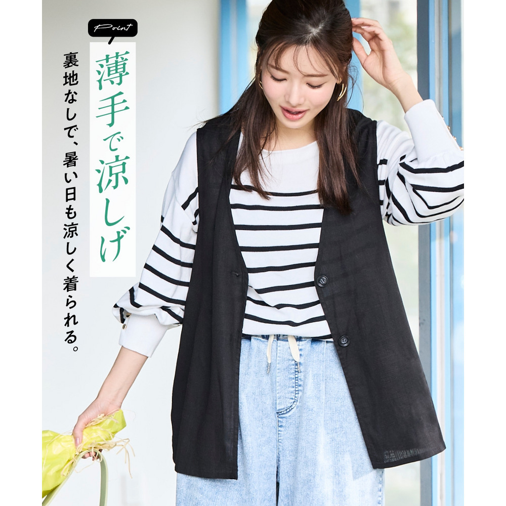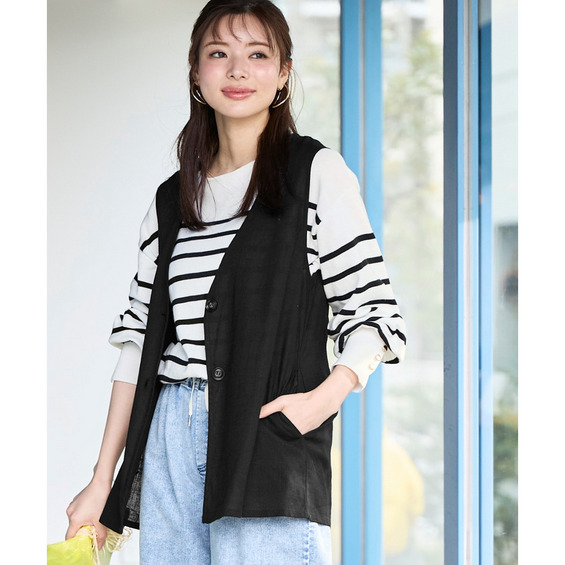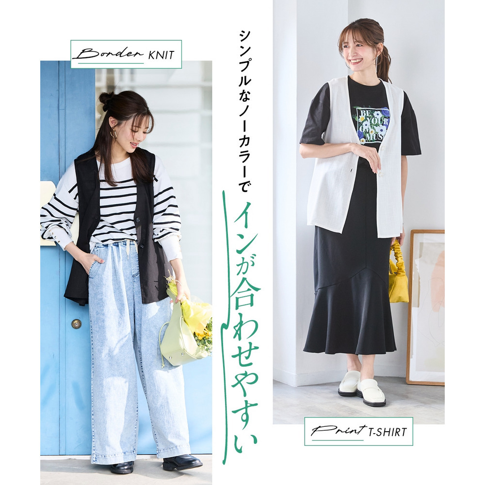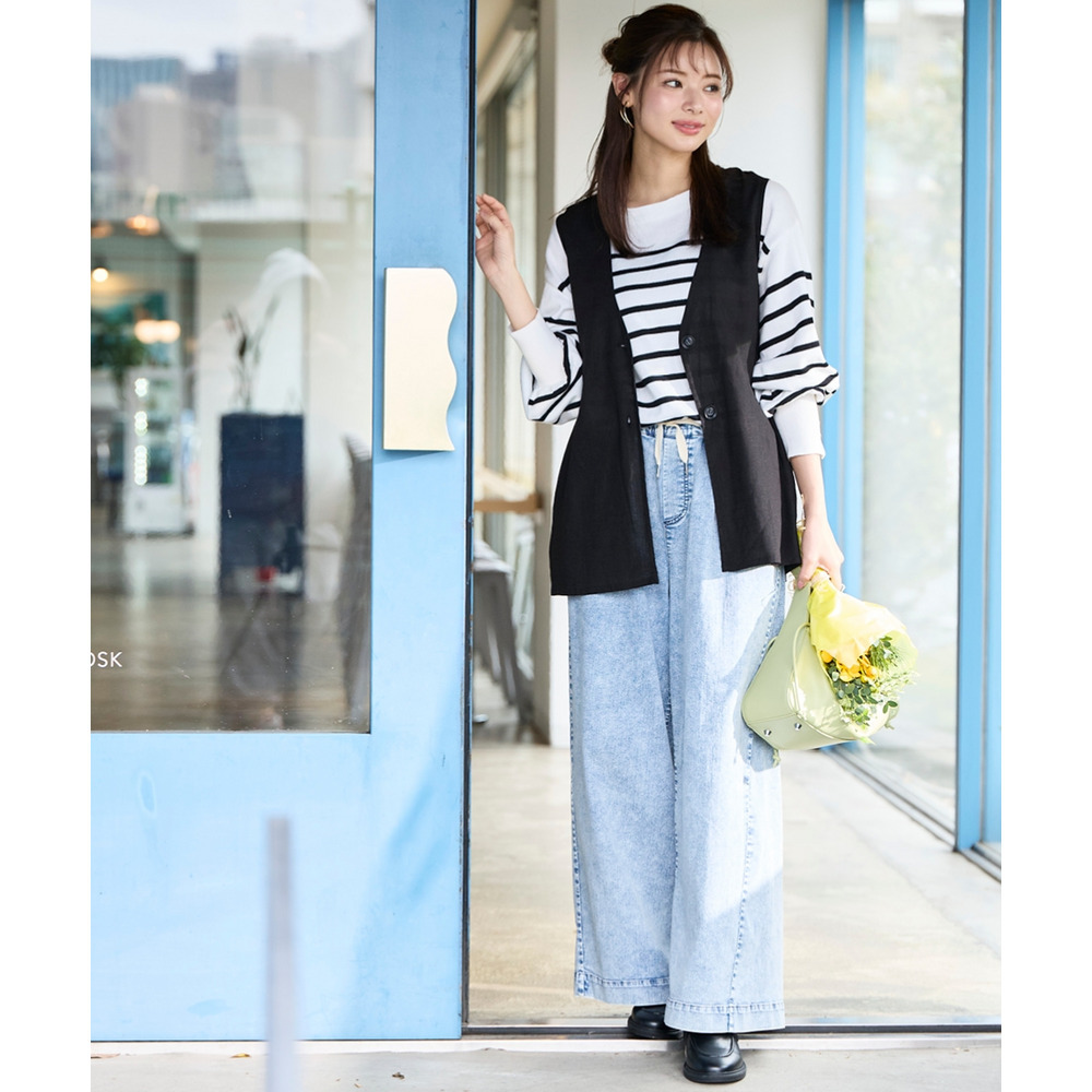 ボーダー柄のトップスなど、カジュアルなカットソーをインナーに合わせると、ジレの端正なシルエットが全体を引き締め、大人カジュアルな装いに仕上がります。