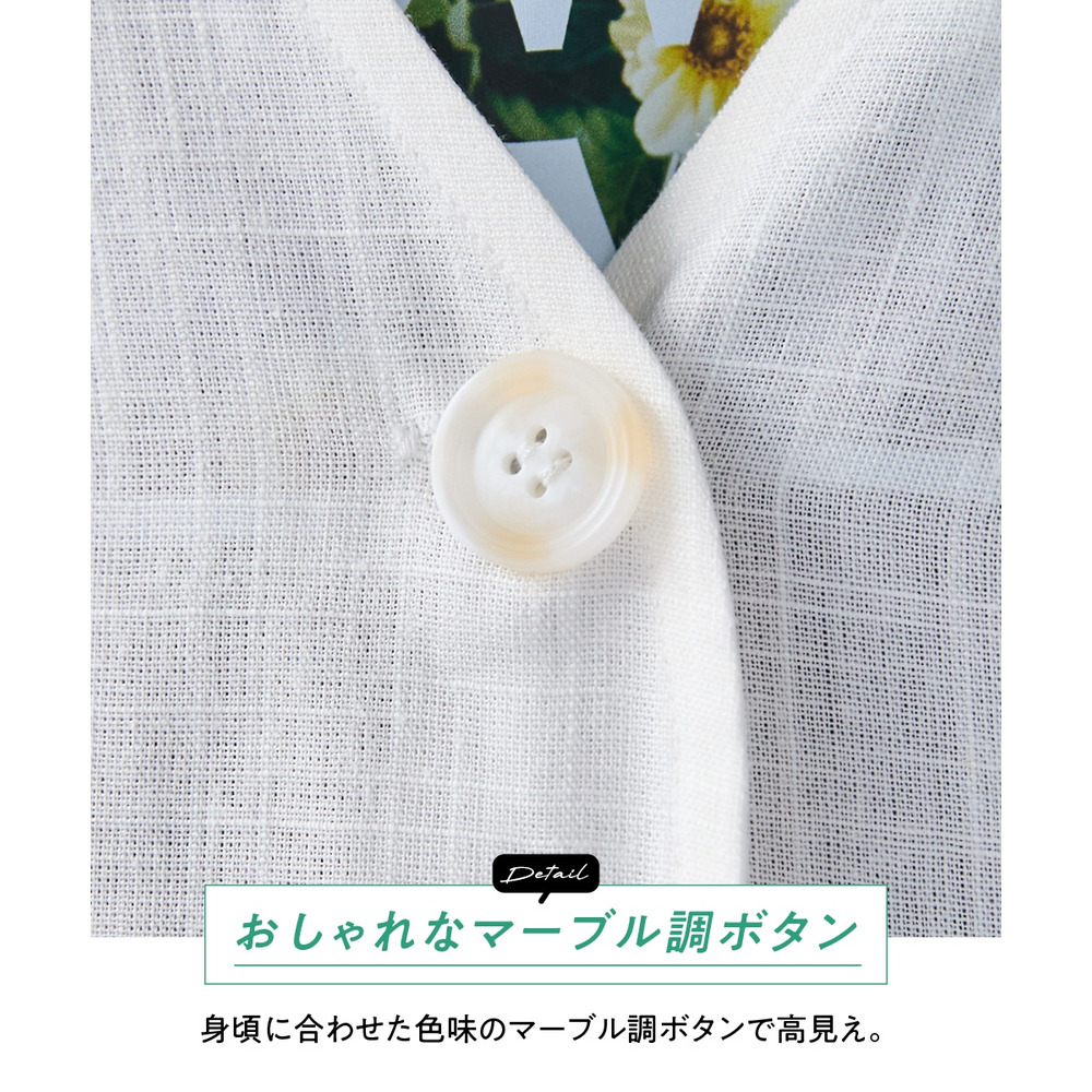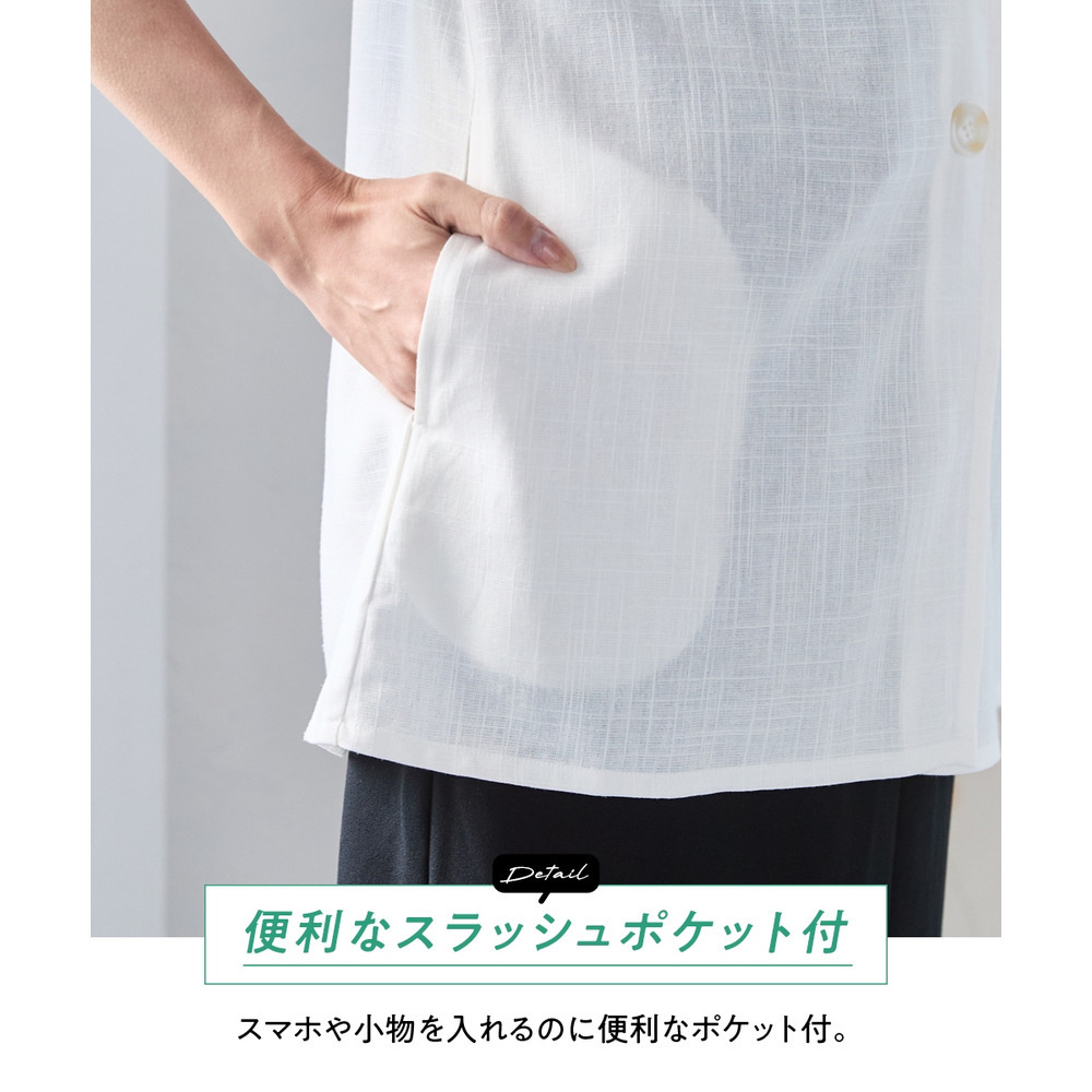 | 素材 | 品質=レーヨン90%・麻10% 前ボタン ポケット両脇 透け感:やや透ける ※色によって透け感が異なる場合があります。淡色カラーはベージュ系インナー着用をおすすめします。 伸縮性:なし 生地の厚み:薄い 光沢感:なし 裏地:なし ポケット:あり 季節:春・夏 シルエット:普通 |