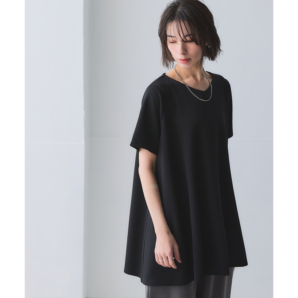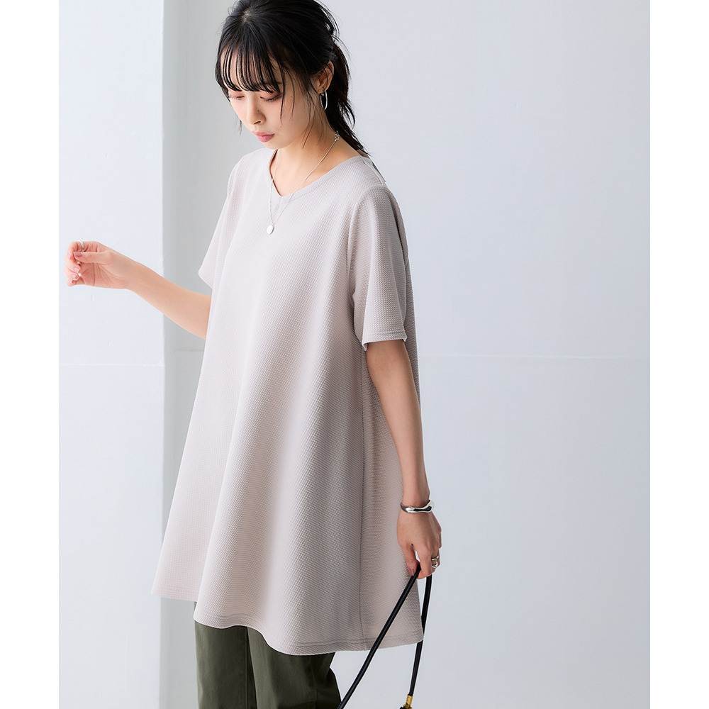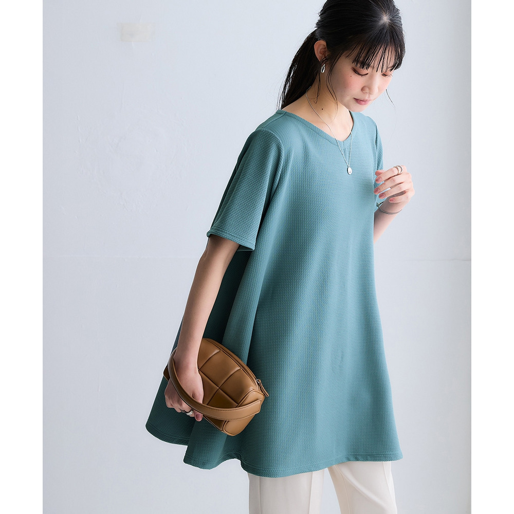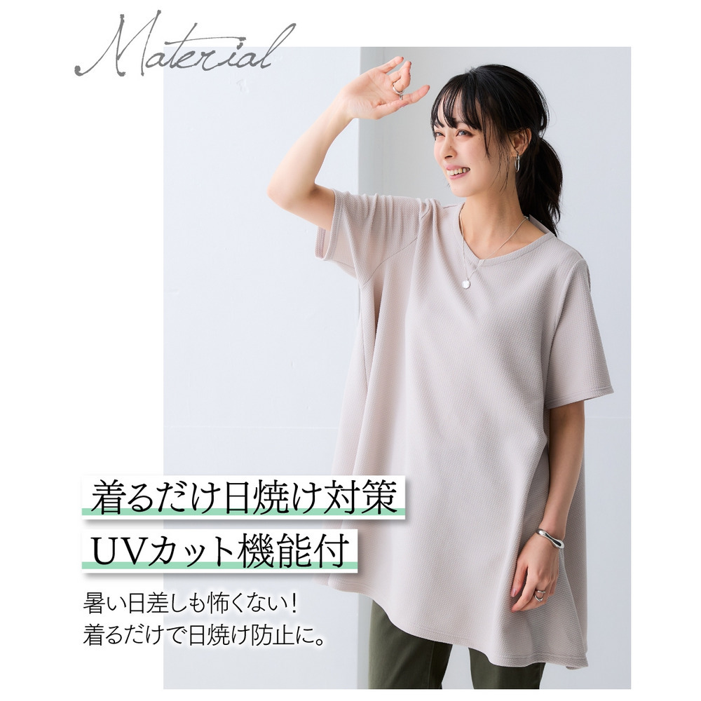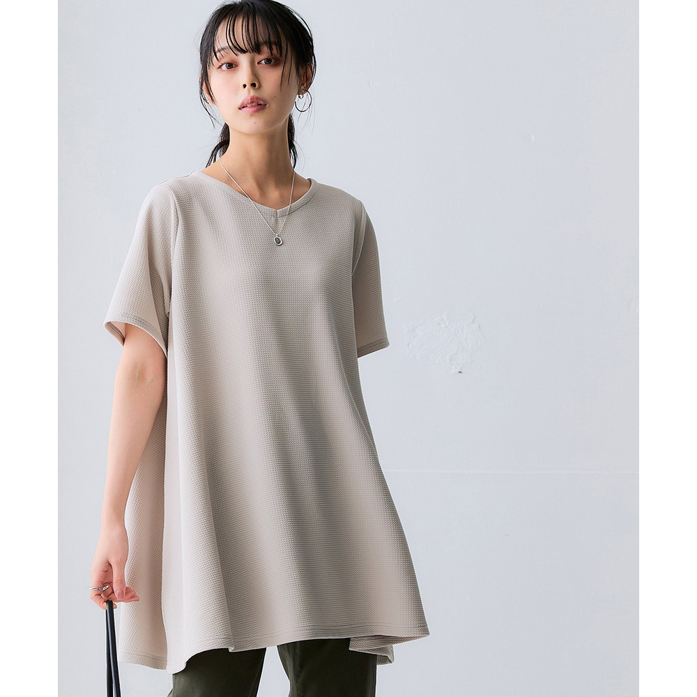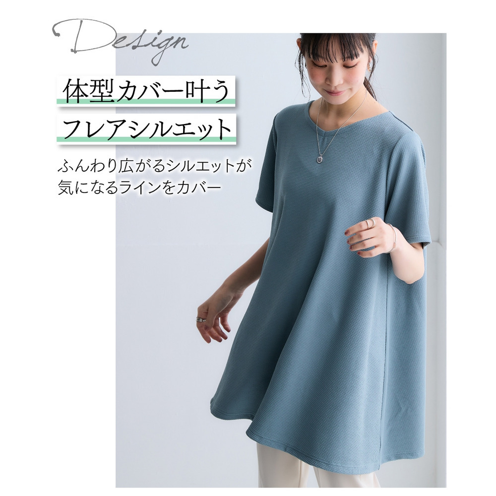 ふくれジャガードカットソー5分袖Vネックフレアチュニック(イージーケア・UVカット・接触冷感) 大きいサイズ