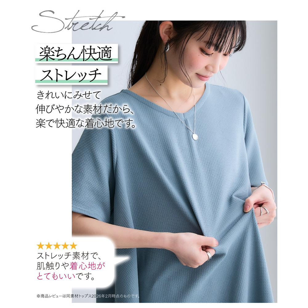 | 素材 | 品質=ポリエステル97%・ポリウレタン3% 表面に凹凸のある生地組織の特性上、引っ掛けに弱いです。着用時は引っ掛けにご注意ください。 透け感:透けにくい 伸縮性:あり 生地の厚み:普通 光沢感:なし 季節:春・夏・秋 シルエット:ゆったり |