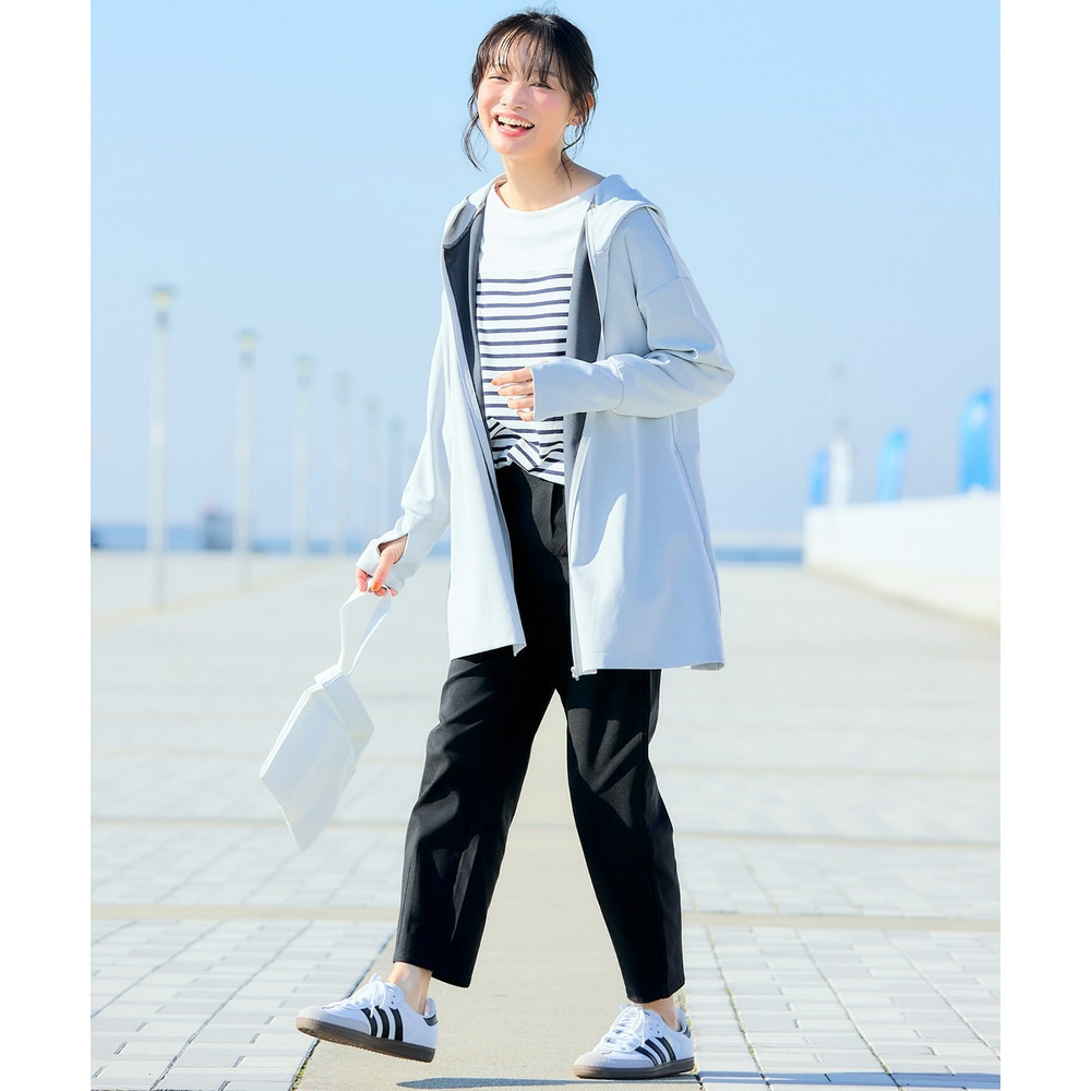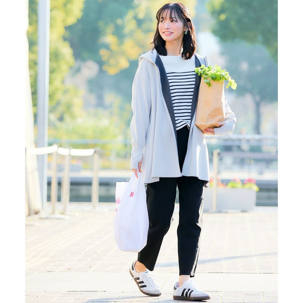 ボリュームのあるAラインシルエットなので、ボトムスをスッキリまとめることでスタイルアップ効果が期待できます。