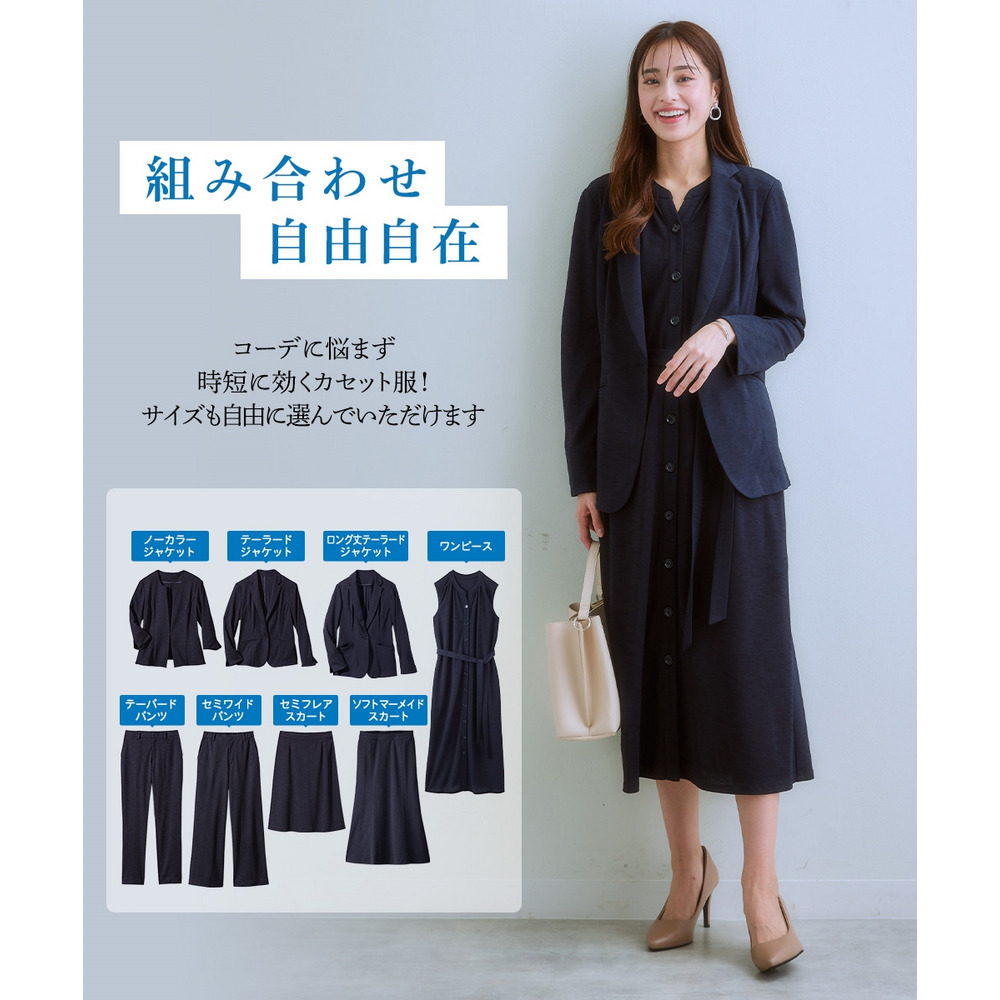 ・大人体型の方でも着るだけですっきり見えるこだわりデザインは、組み合わせも自由自在で、オフィスから休日の大人カジュアルコーデ、落ち着いたセミフォーマルとしても着まわし可能なカセットスーツです。