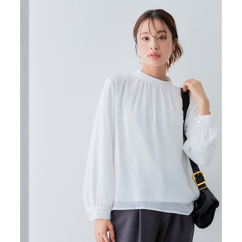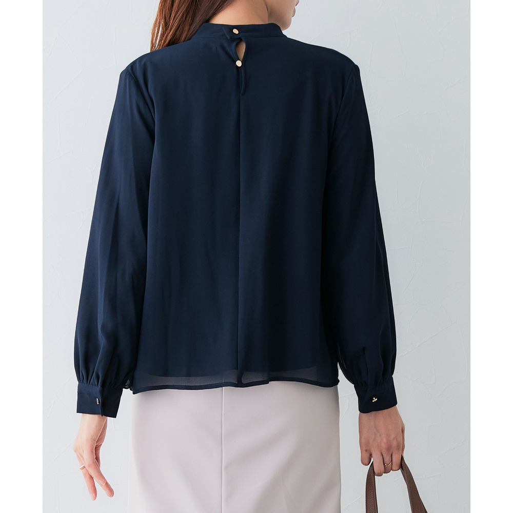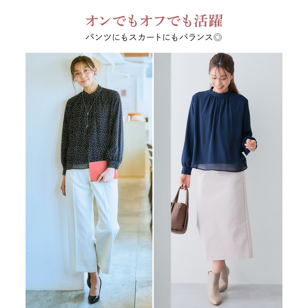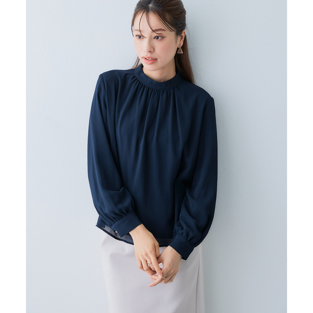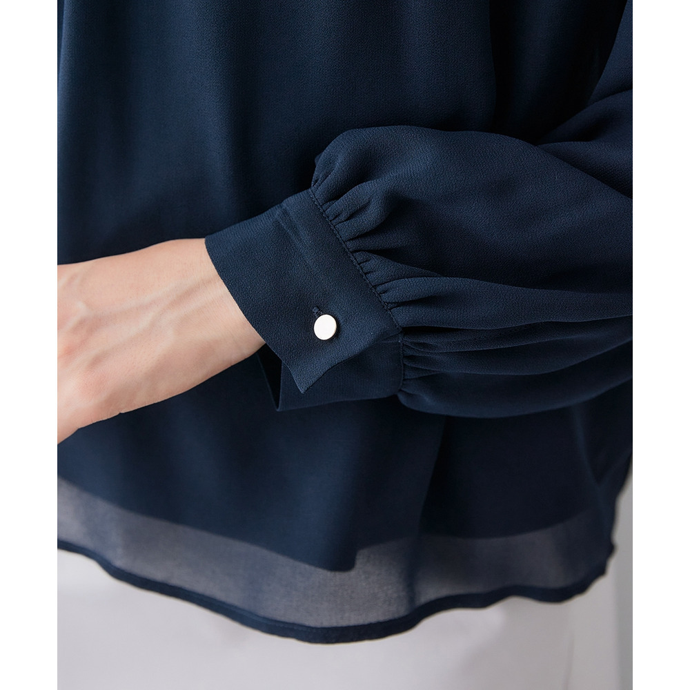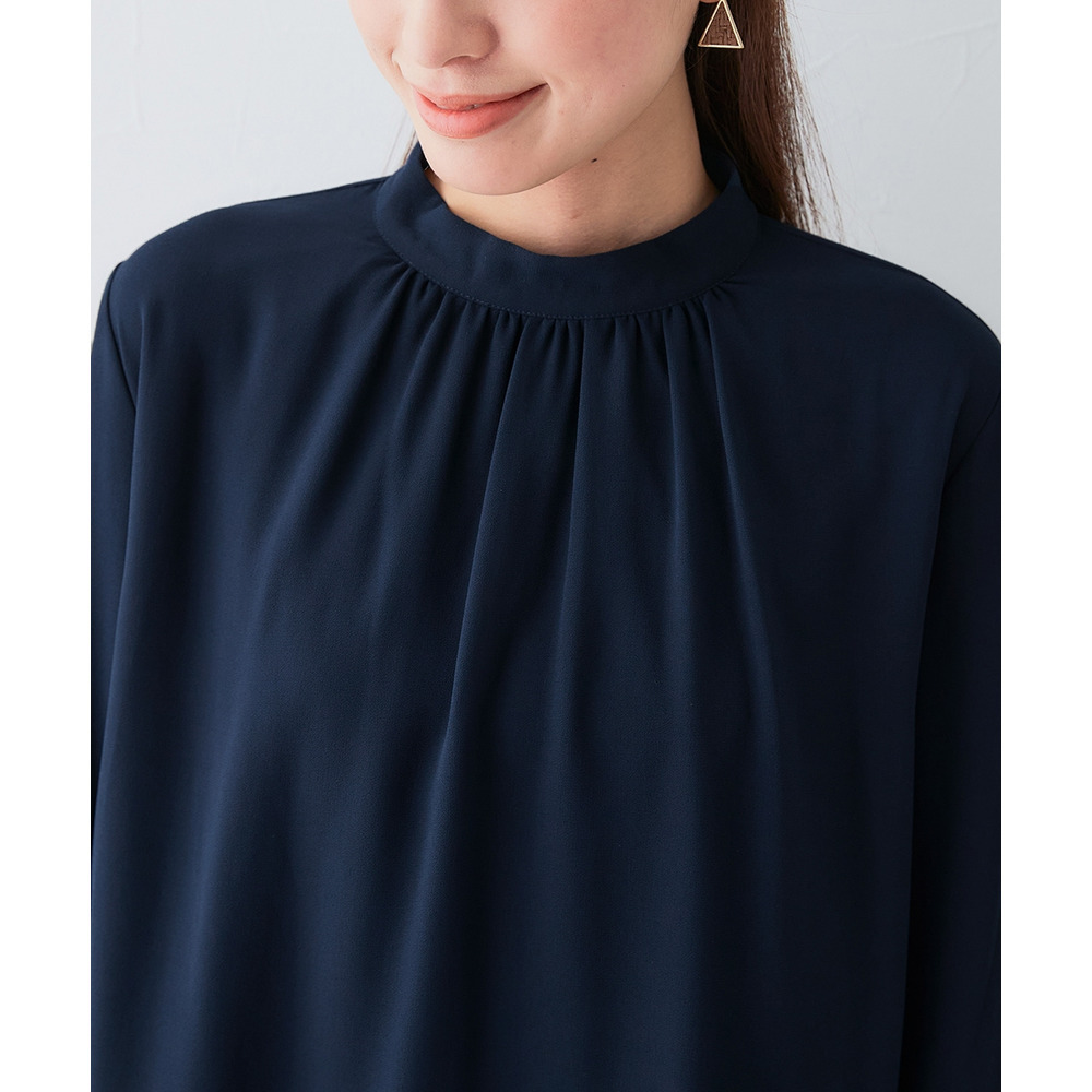 ・首元ギャザー&袖ボリュームで機能性ブラウスながらエレガントなデザイン