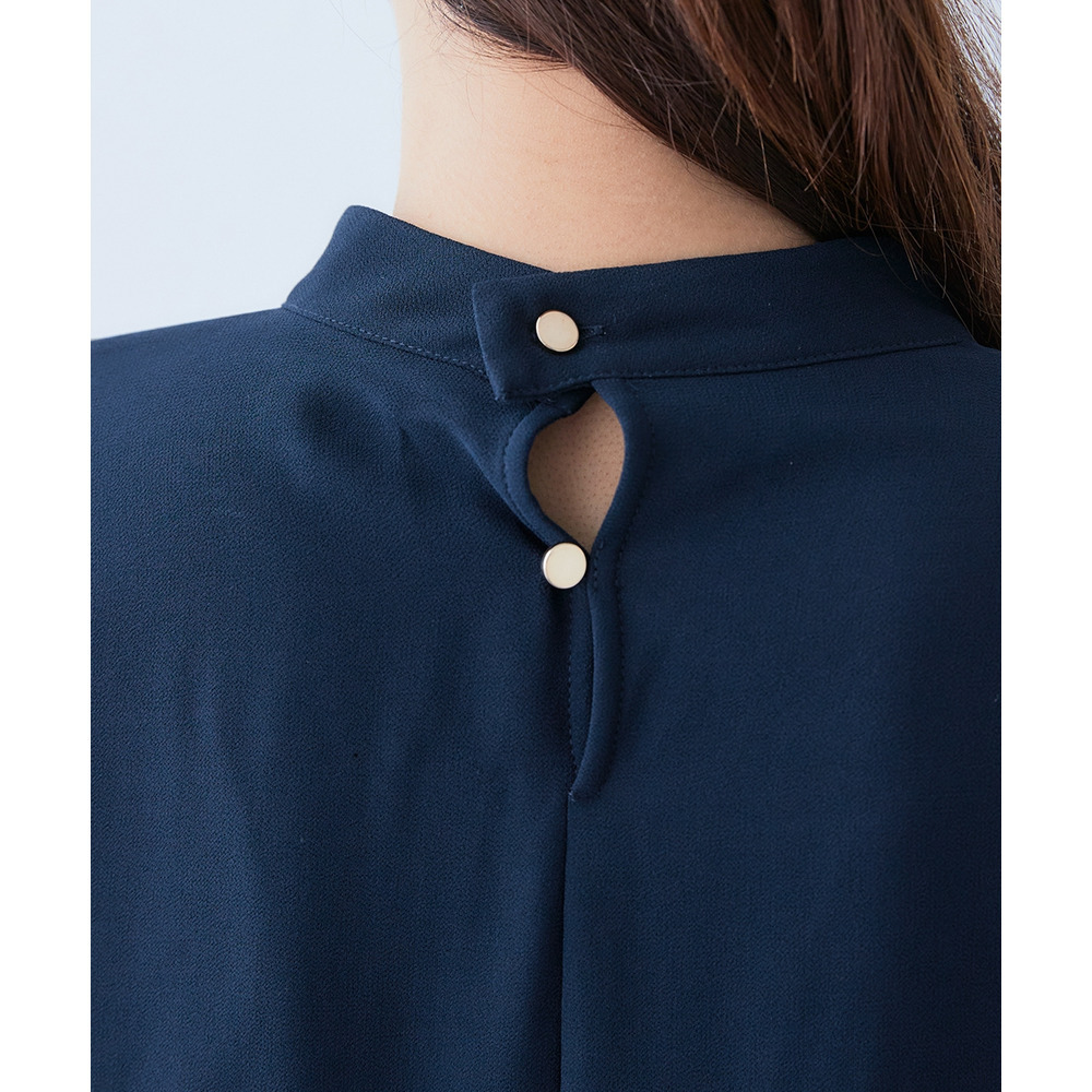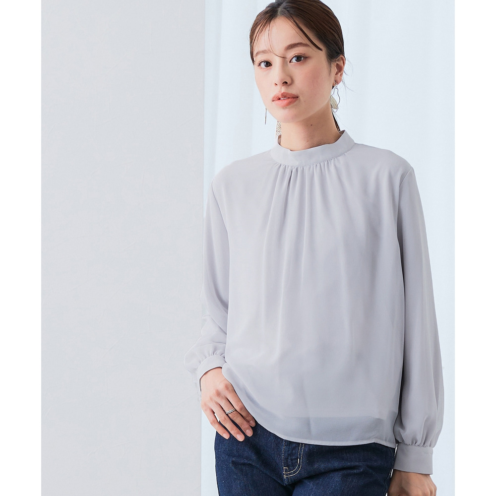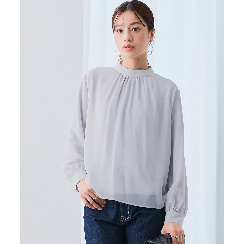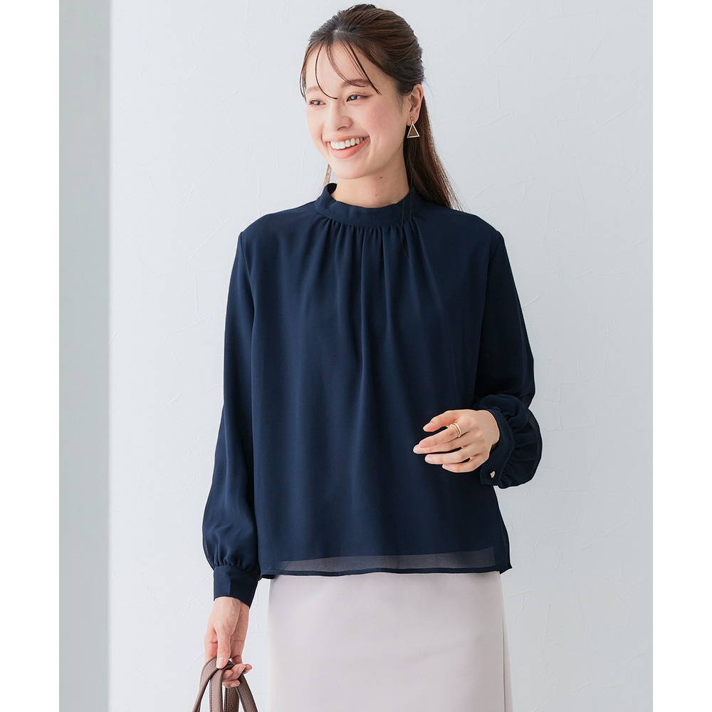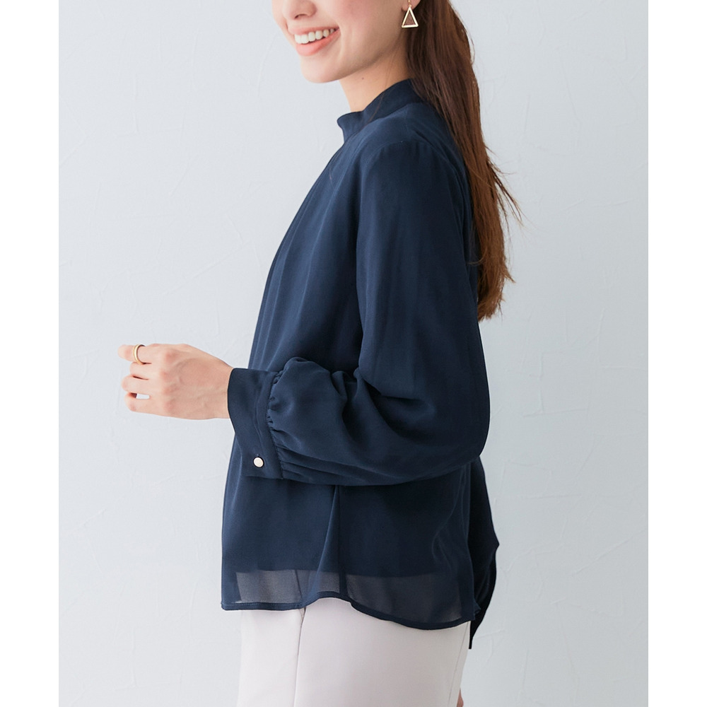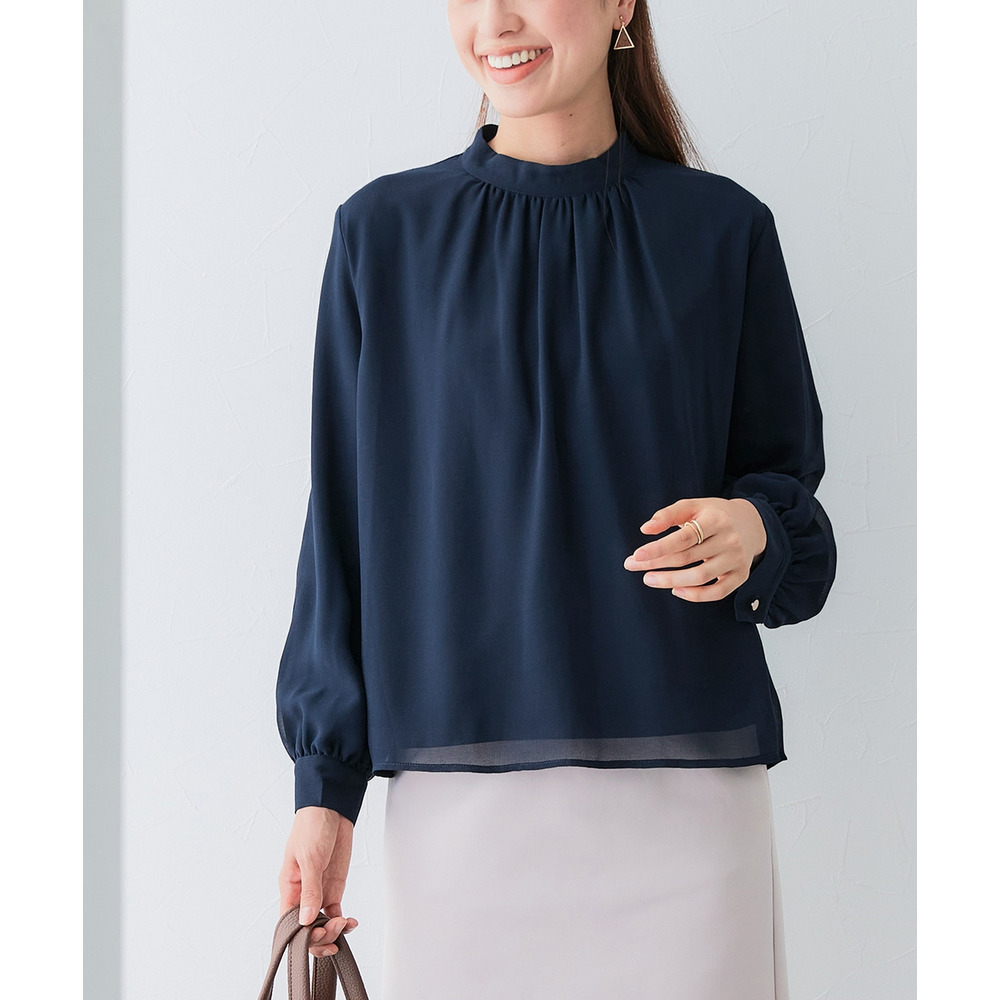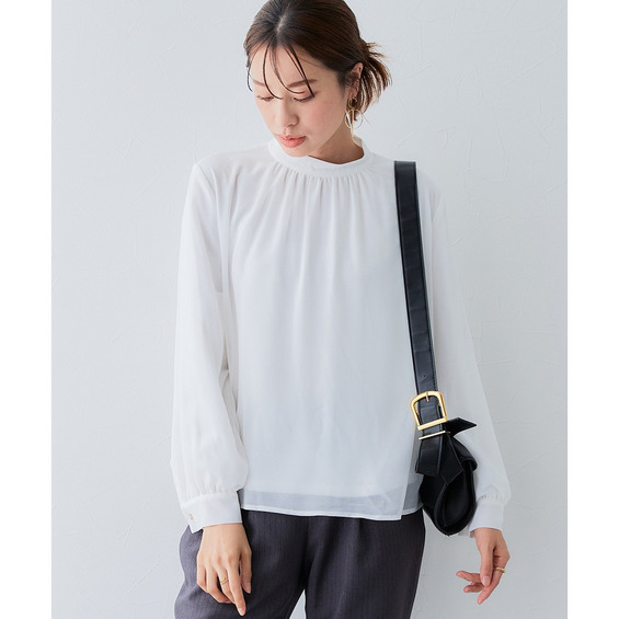 ・首元ギャザー&袖ボリュームで機能性ブラウスながらエレガントなデザイン