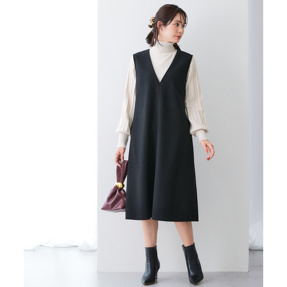 ・すっきりVネック×揺れフレアシルエットで顔周りすっきり、女性らしい印象に