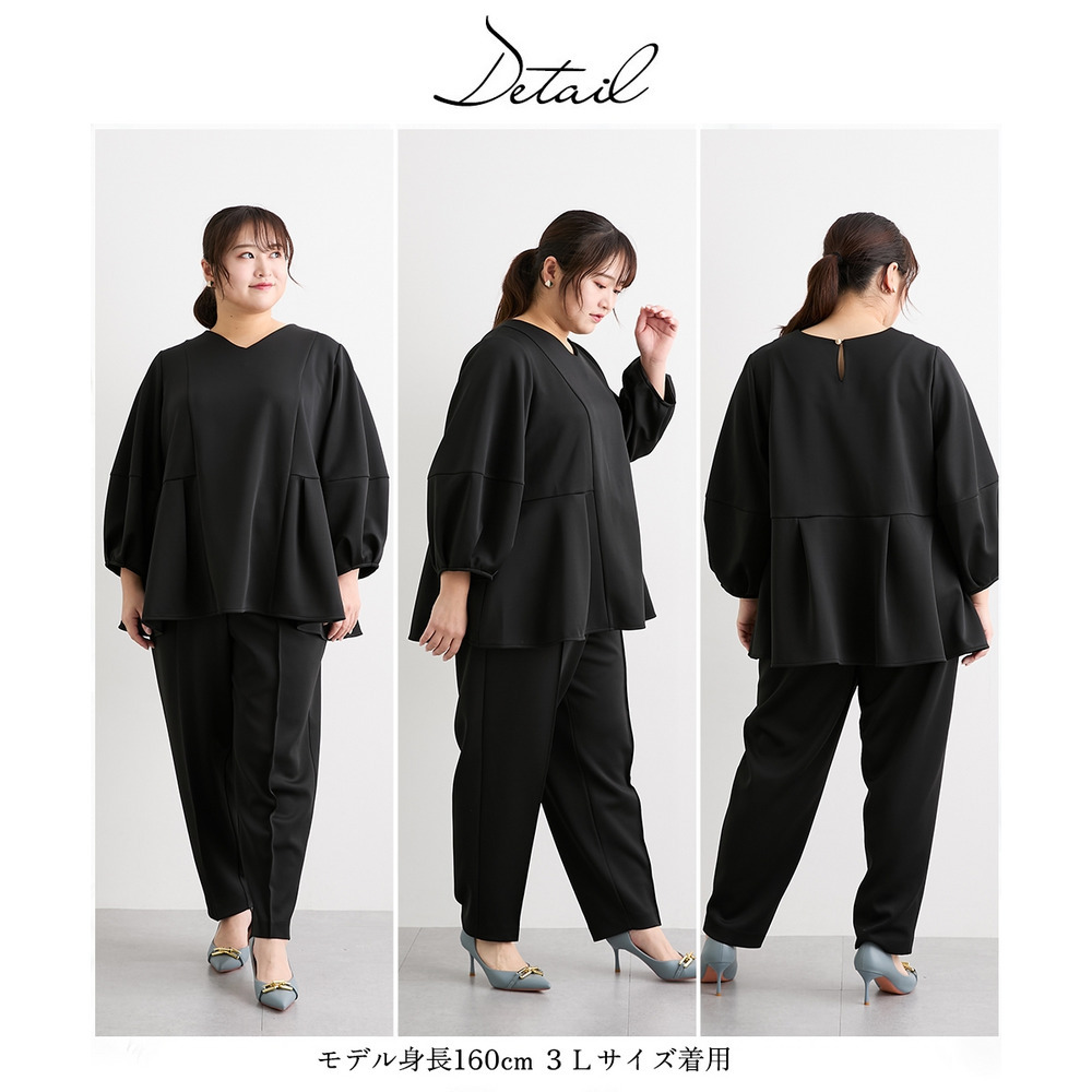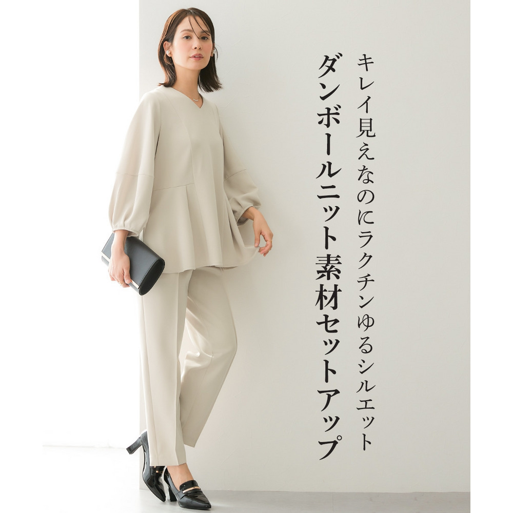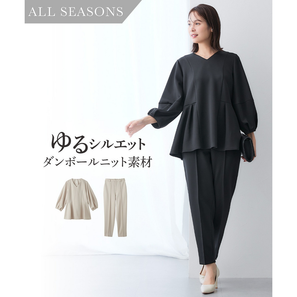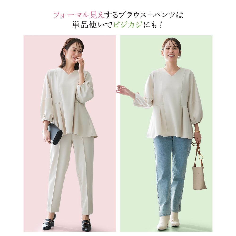 【レディーススーツ】ダンボールニット素材ブラウスセットアップスーツ(9分袖ブラウス+テーパードパンツ) 大きいサイズ