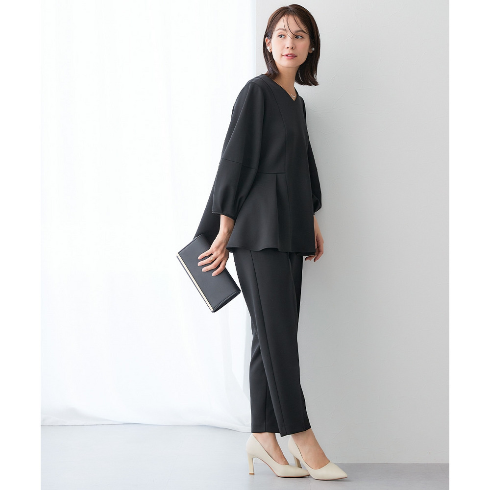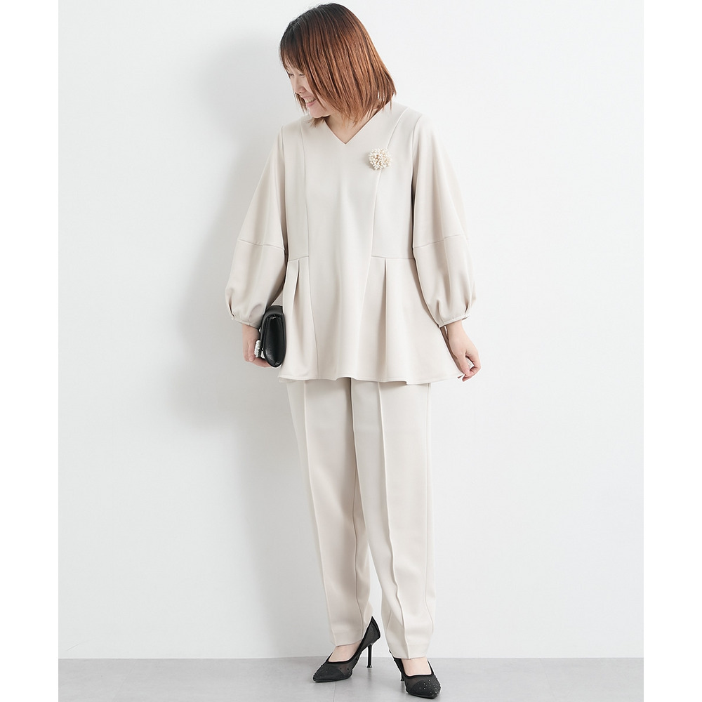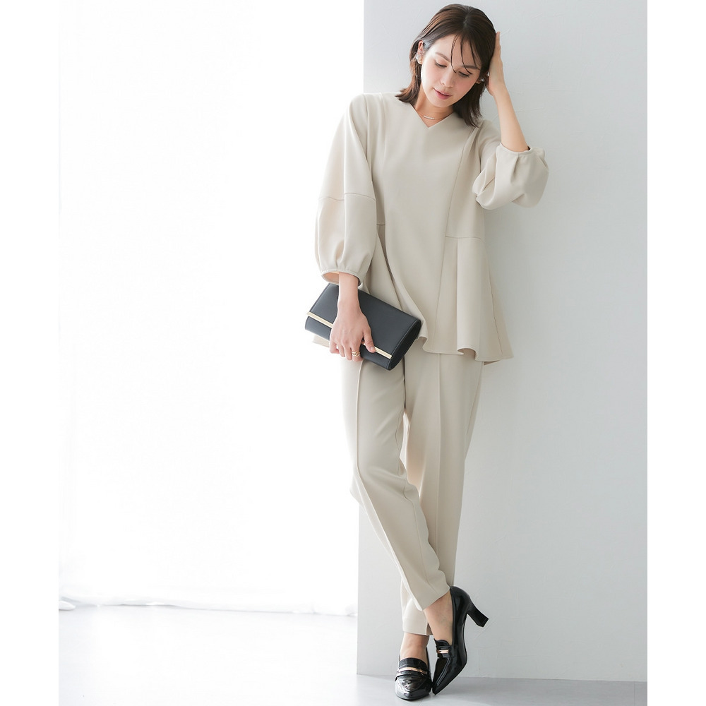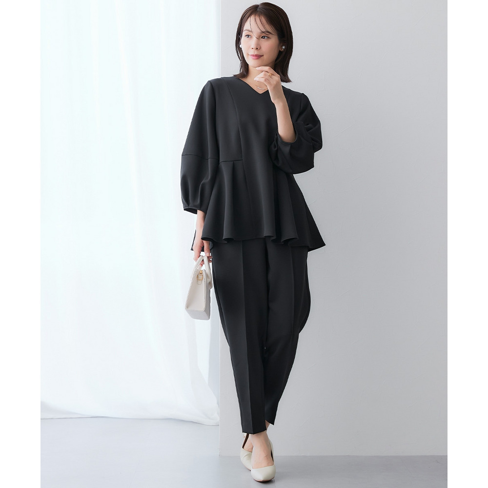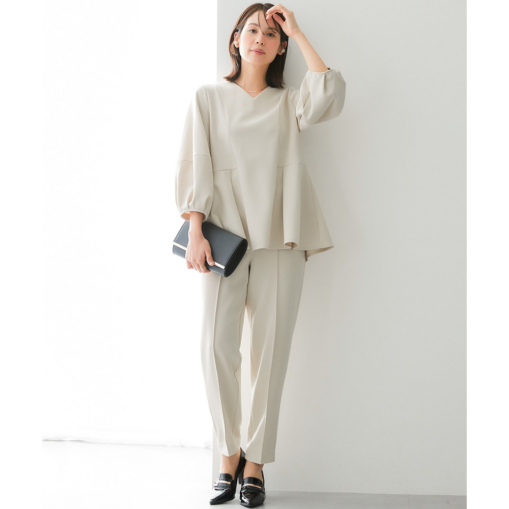 【レディーススーツ】ダンボールニット素材ブラウスセットアップスーツ(9分袖ブラウス+テーパードパンツ) 大きいサイズ