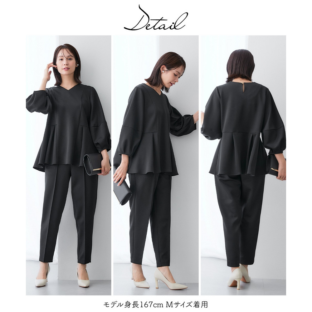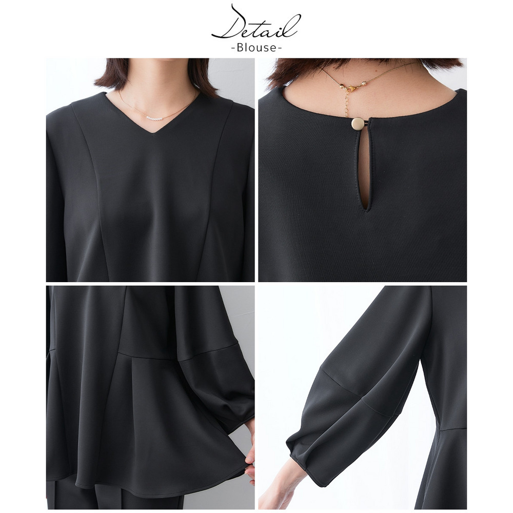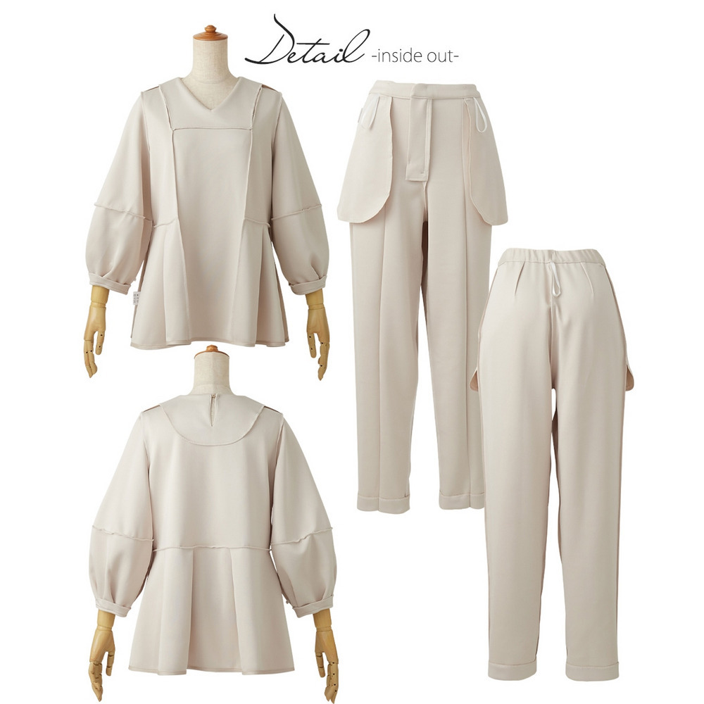 | 素材 | 品質=ポリエステル95%・ポリウレタン5% 裏地無ブラウス:後涙開パンツ:前ホック付ファスナー開 ウエスト後ゴム入 ポケット両脇※この商品は2点同サイズのみで販売します。 |