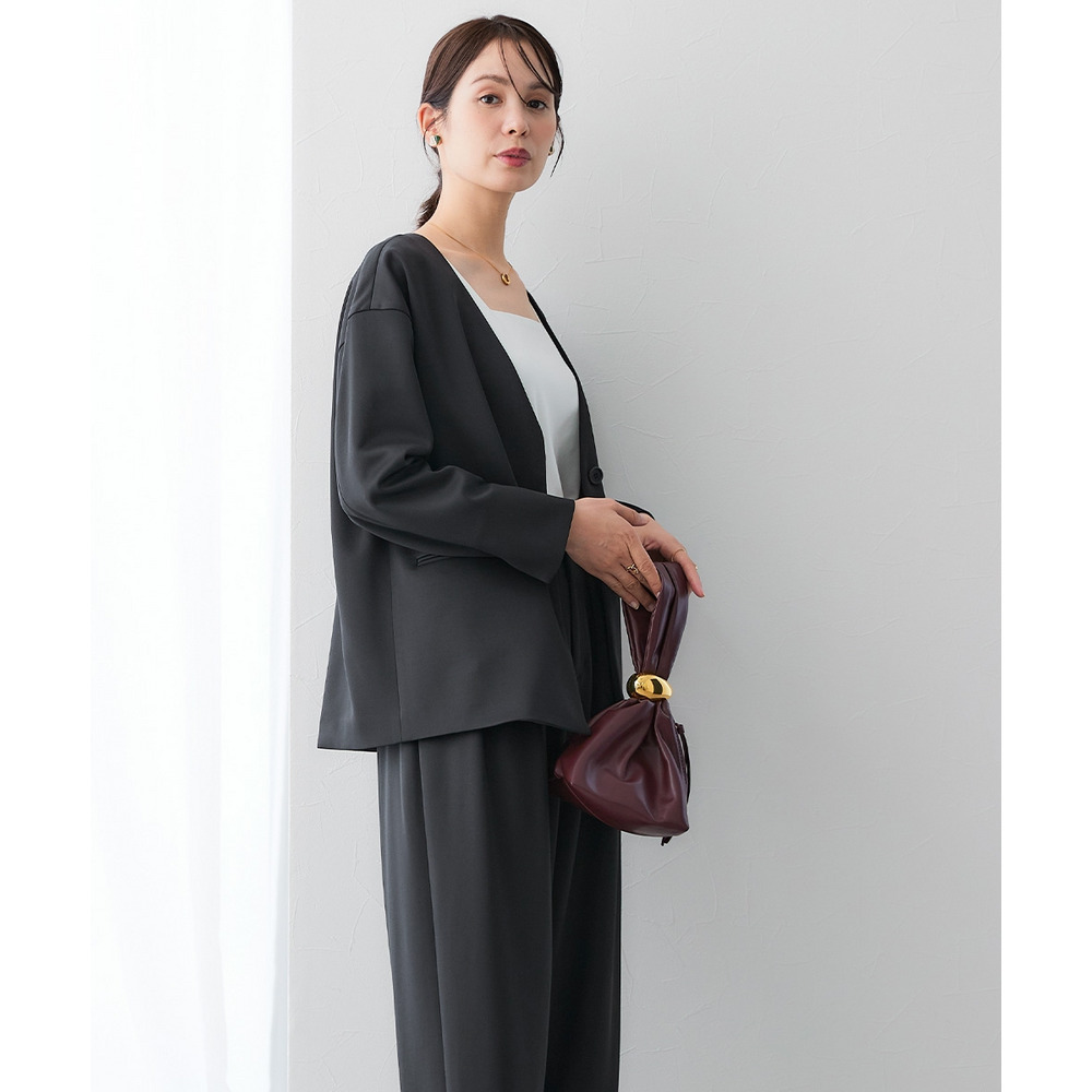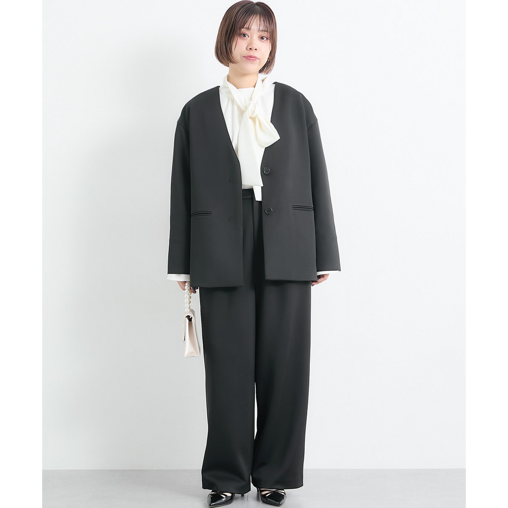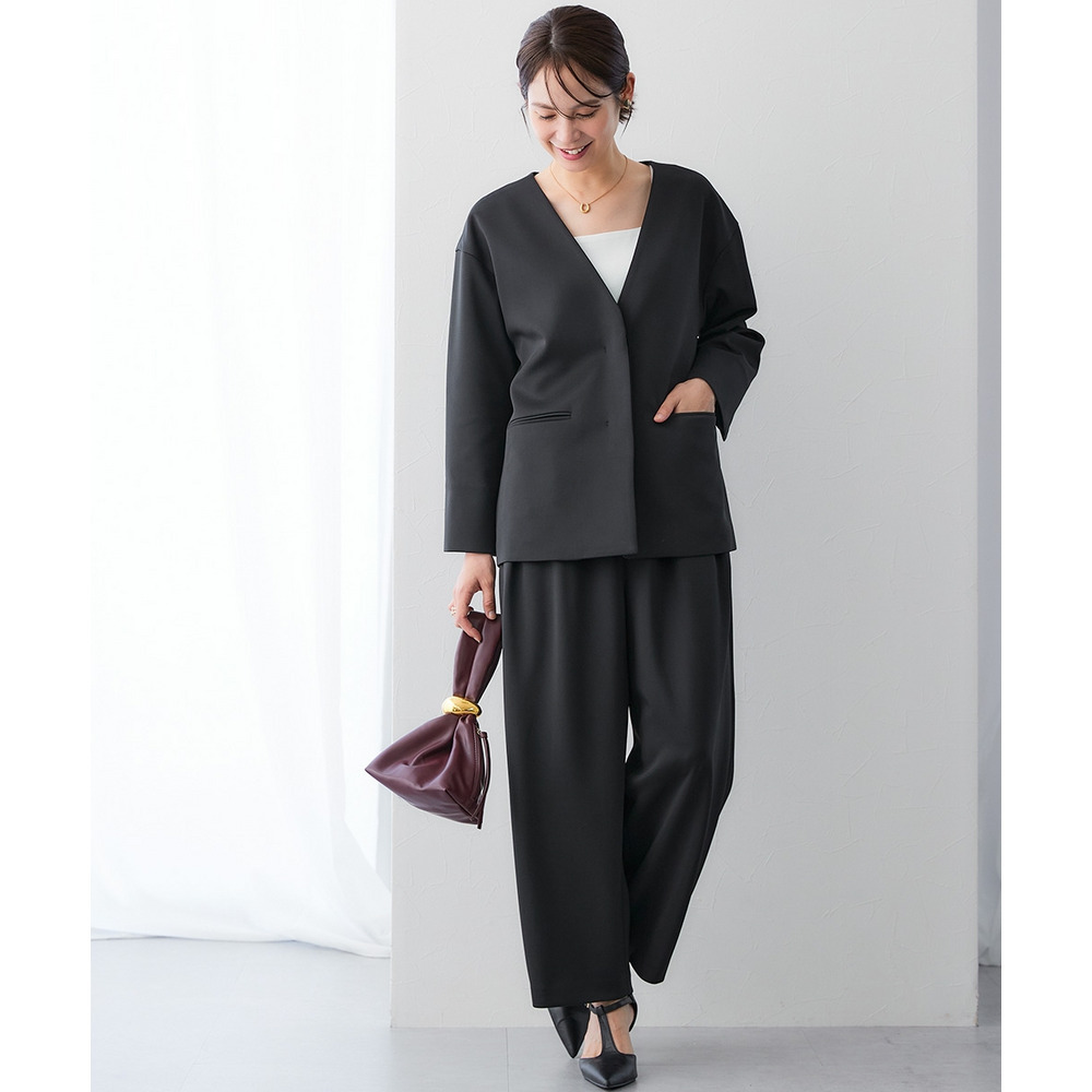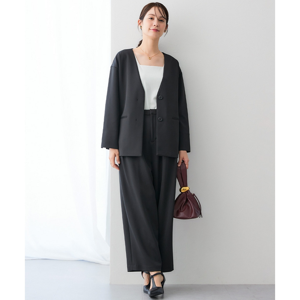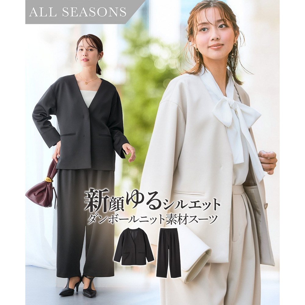• 【レディーススーツ】ダンボールニット素材ノーカラースーツ(ジャケット+ワイドパンツ) 大きいサイズ4
