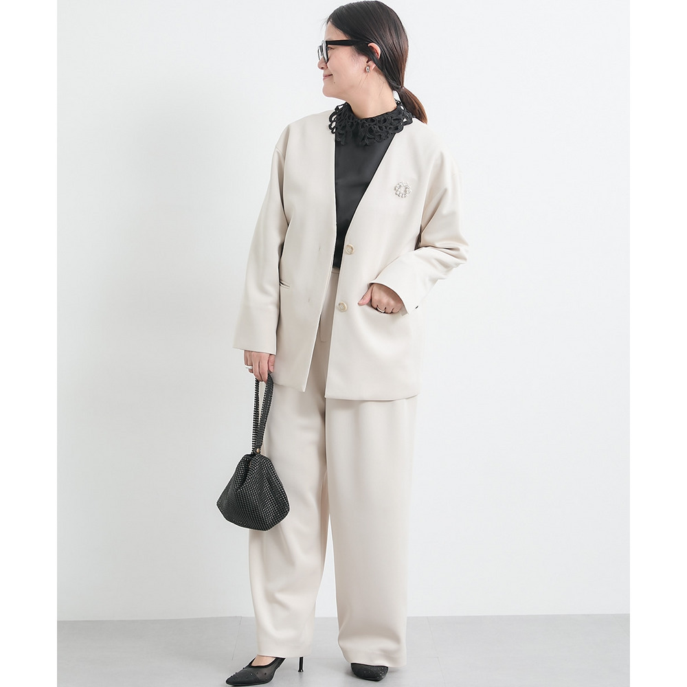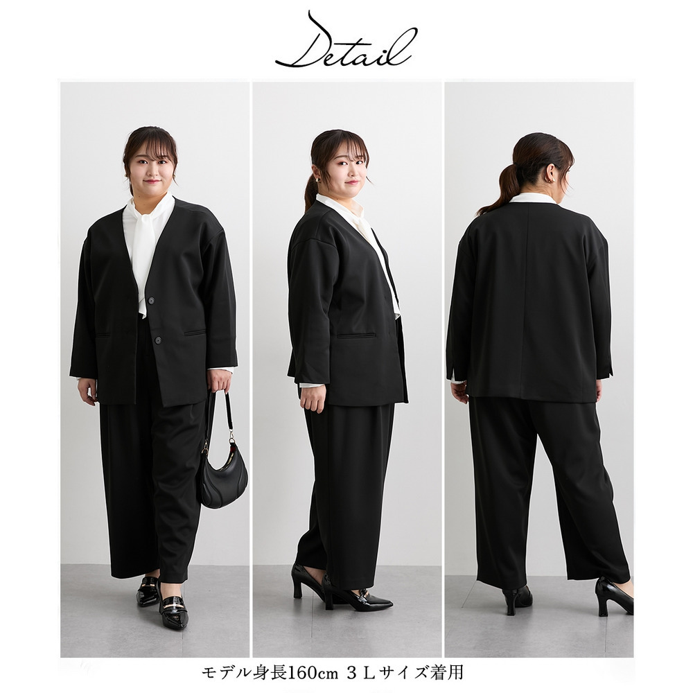 • 【レディーススーツ】ダンボールニット素材ノーカラースーツ(ジャケット+ワイドパンツ) 大きいサイズ3