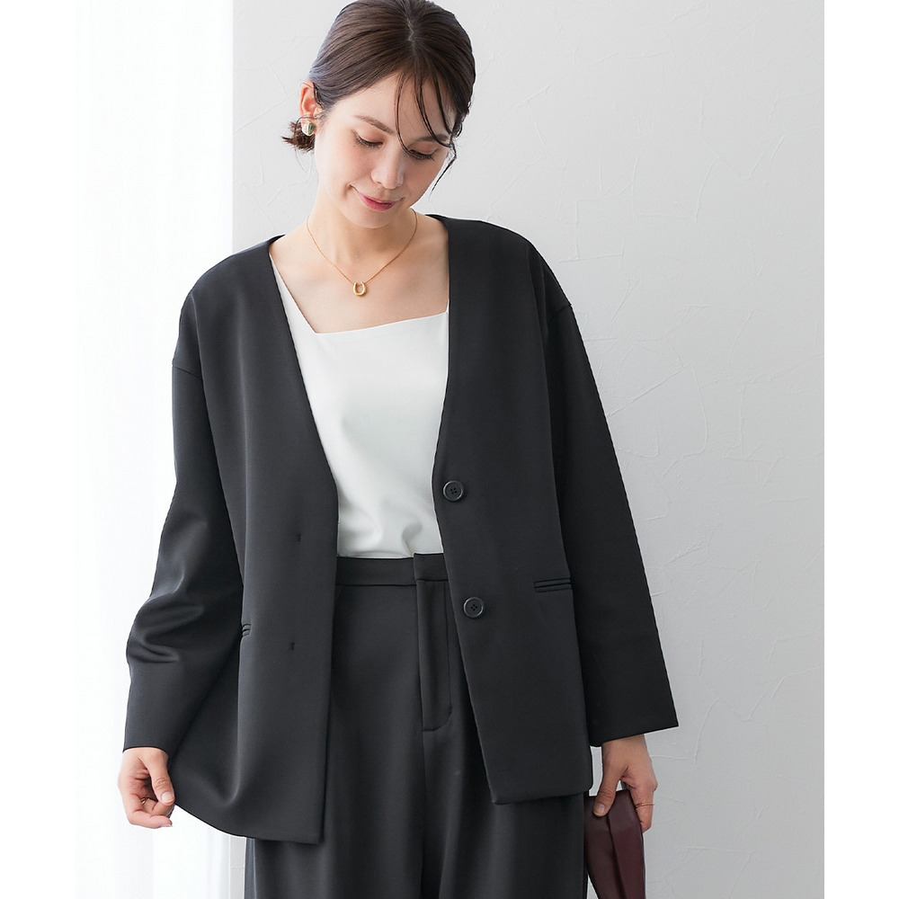 リラクシーながらもきれい見えするVネックノーカラージャケット。