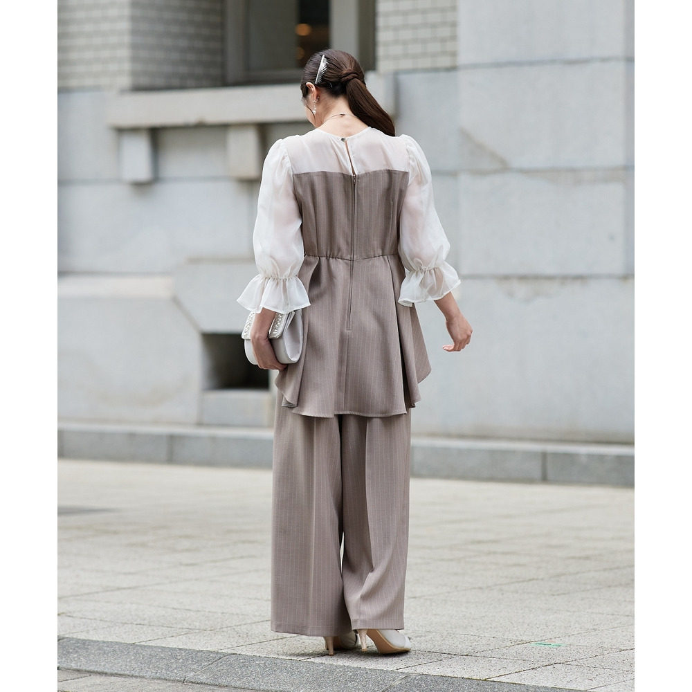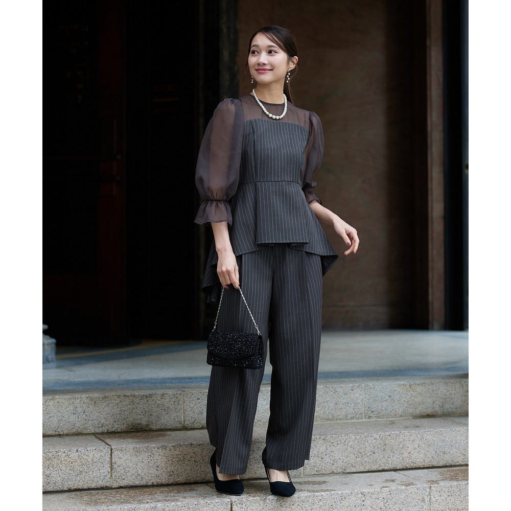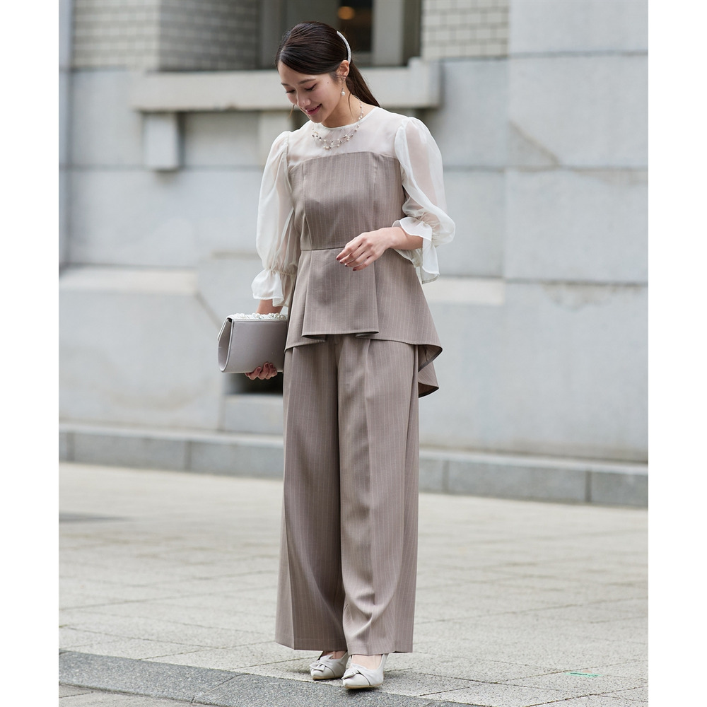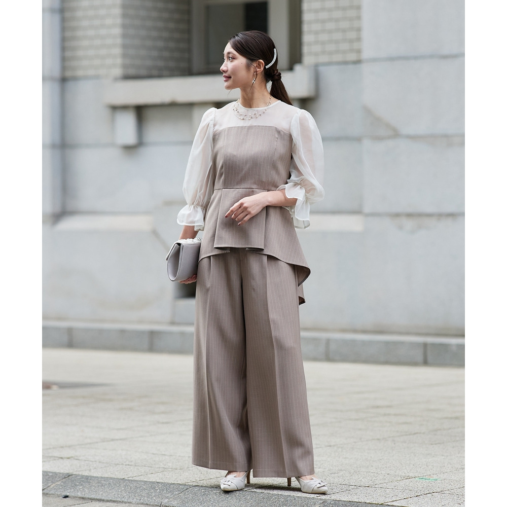 【結婚式・パーティードレス】キャンディースリーブペプラムストライプブラウス+ワイドパンツセットアップ 大きいサイズ