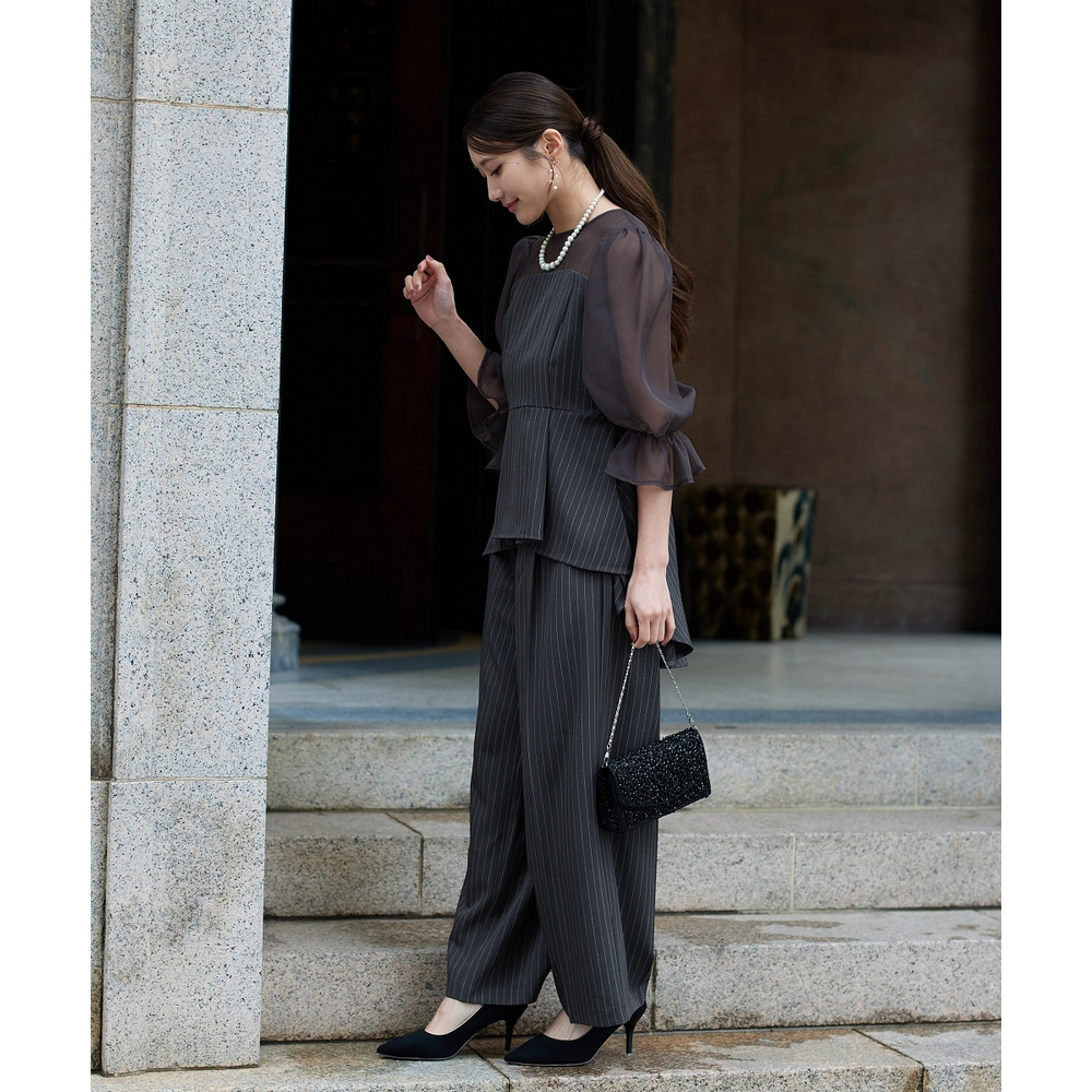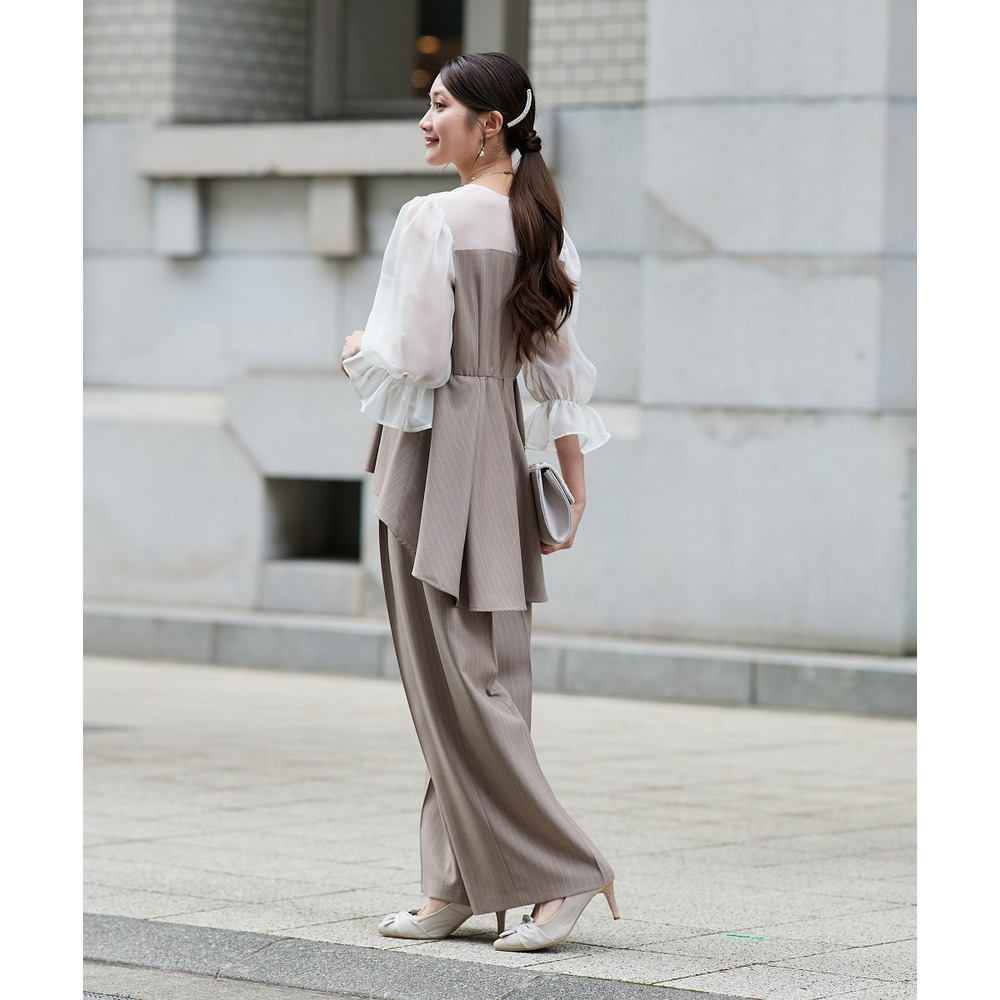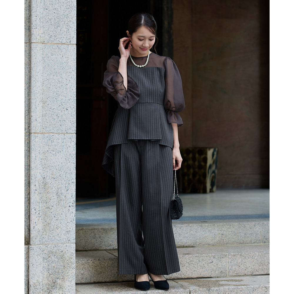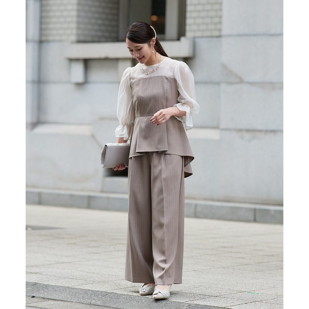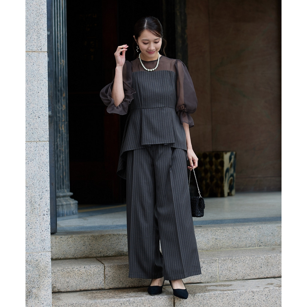 【結婚式・パーティードレス】キャンディースリーブペプラムストライプブラウス+ワイドパンツセットアップ 大きいサイズ